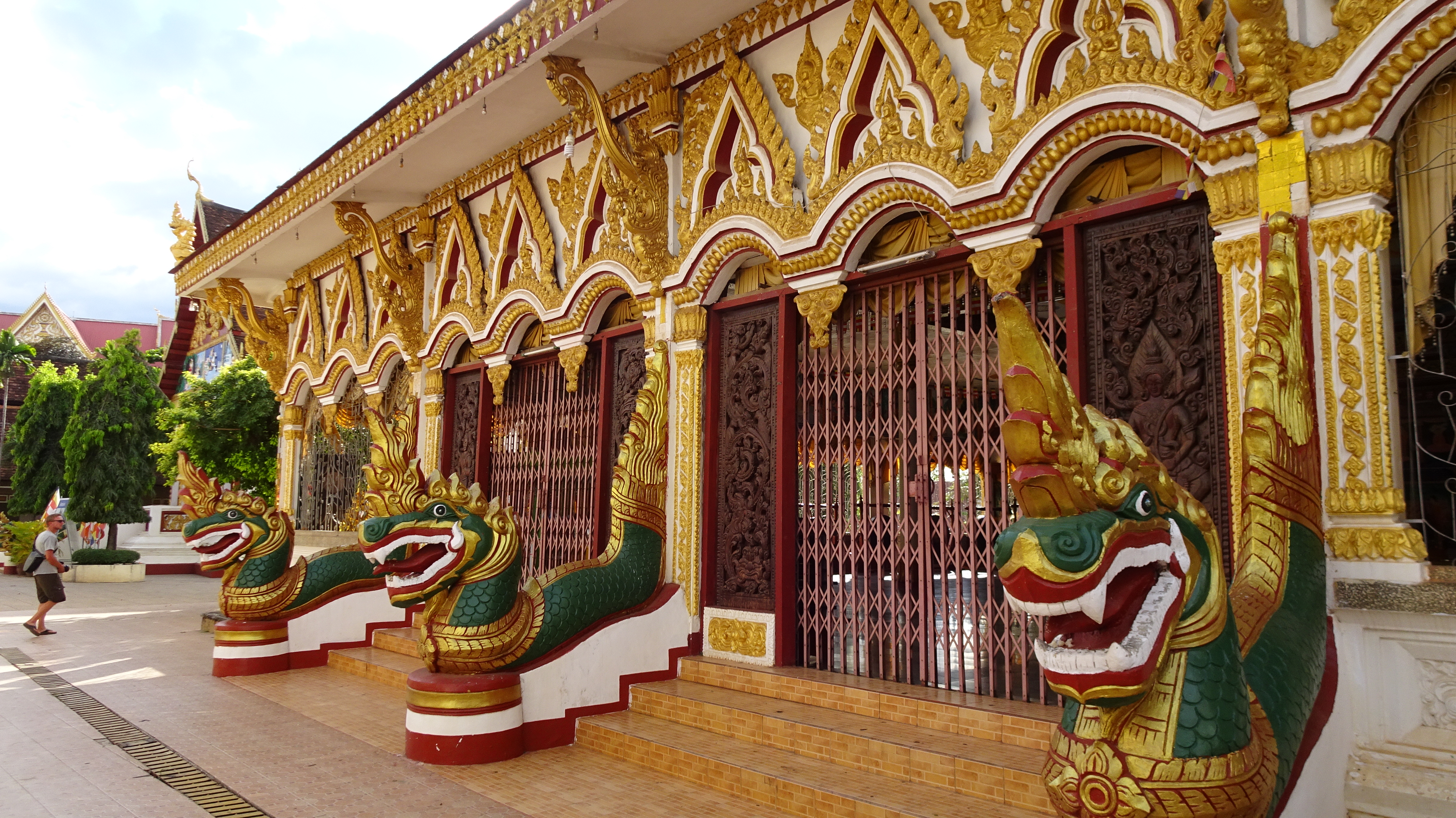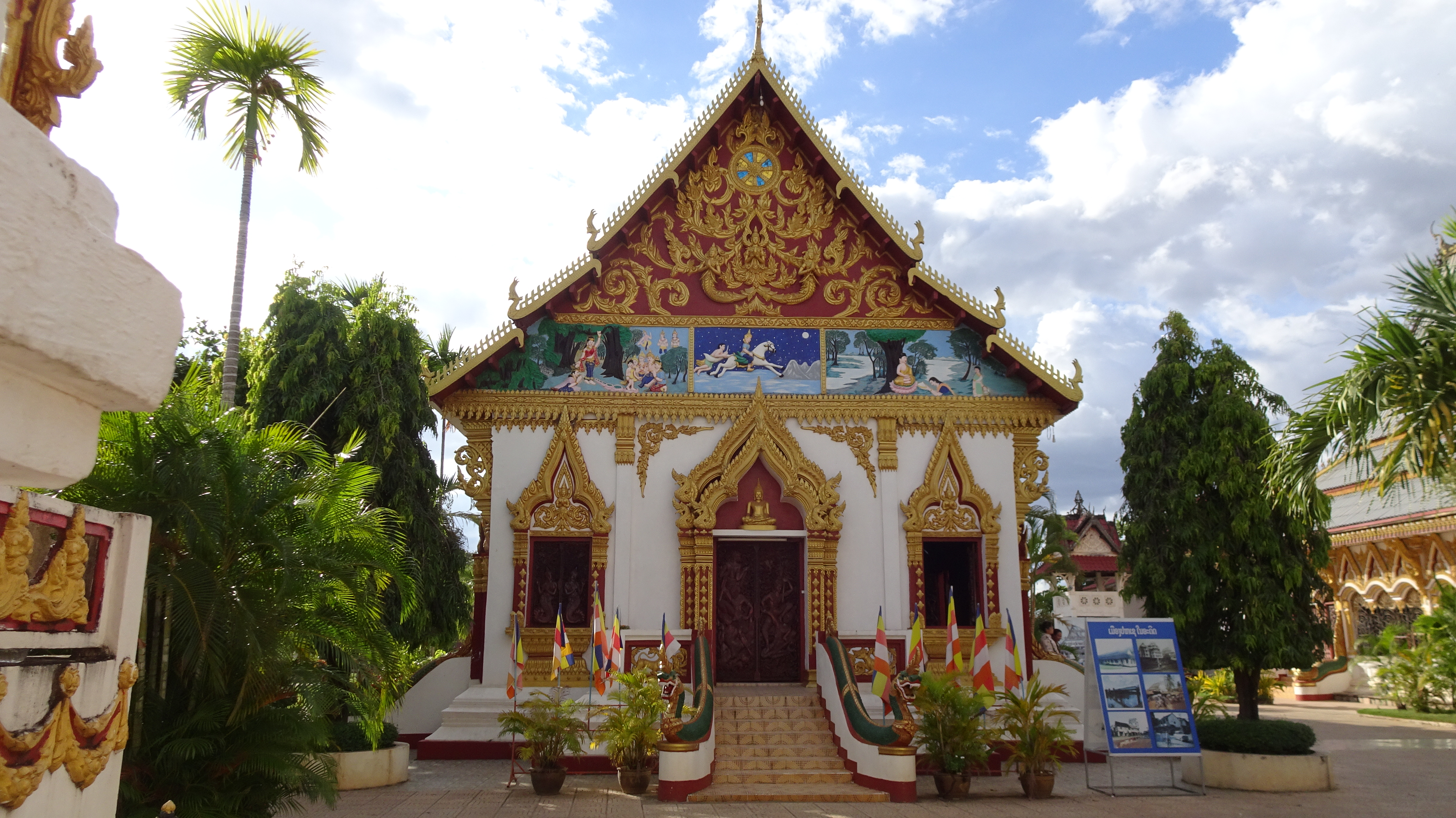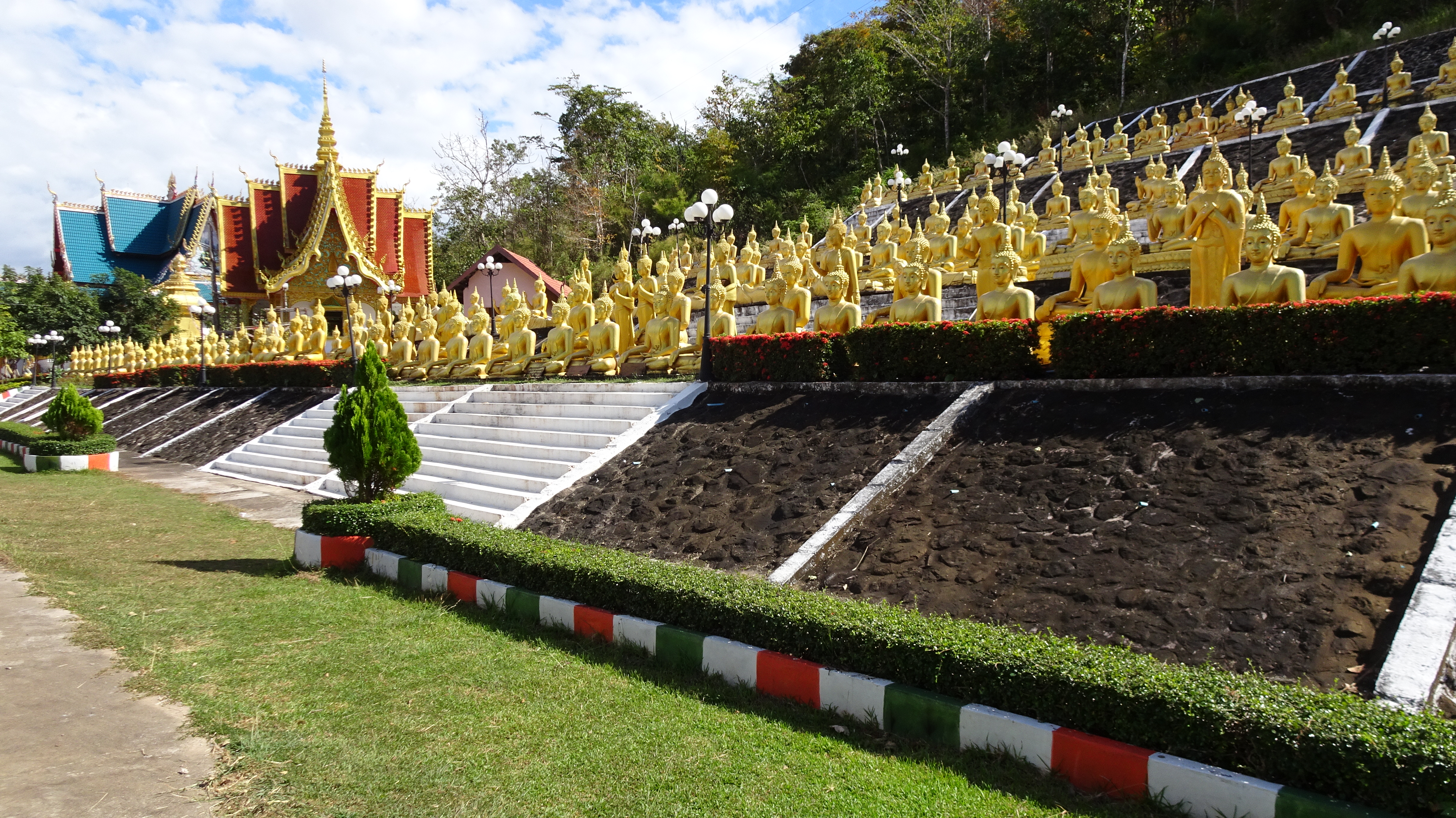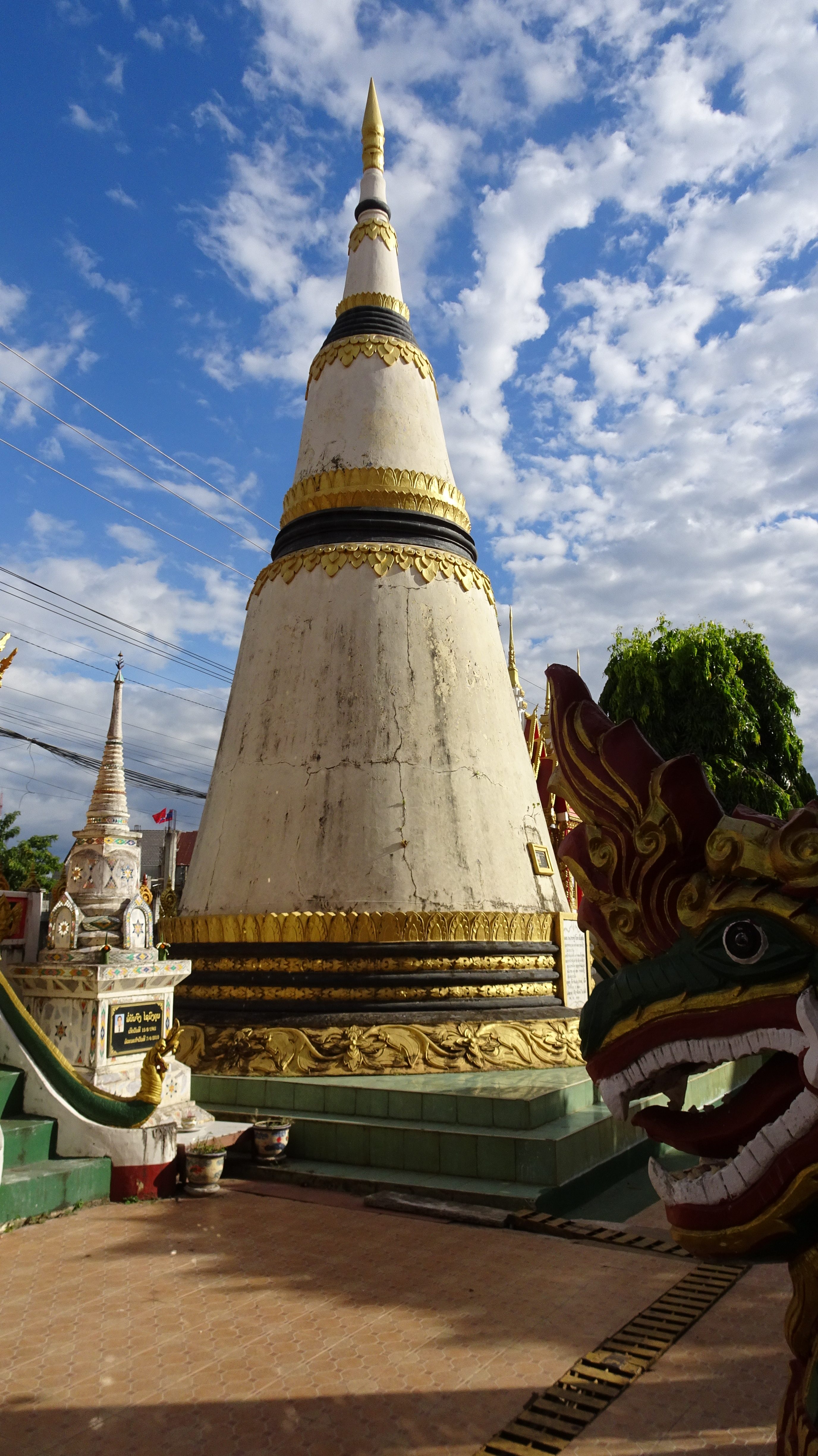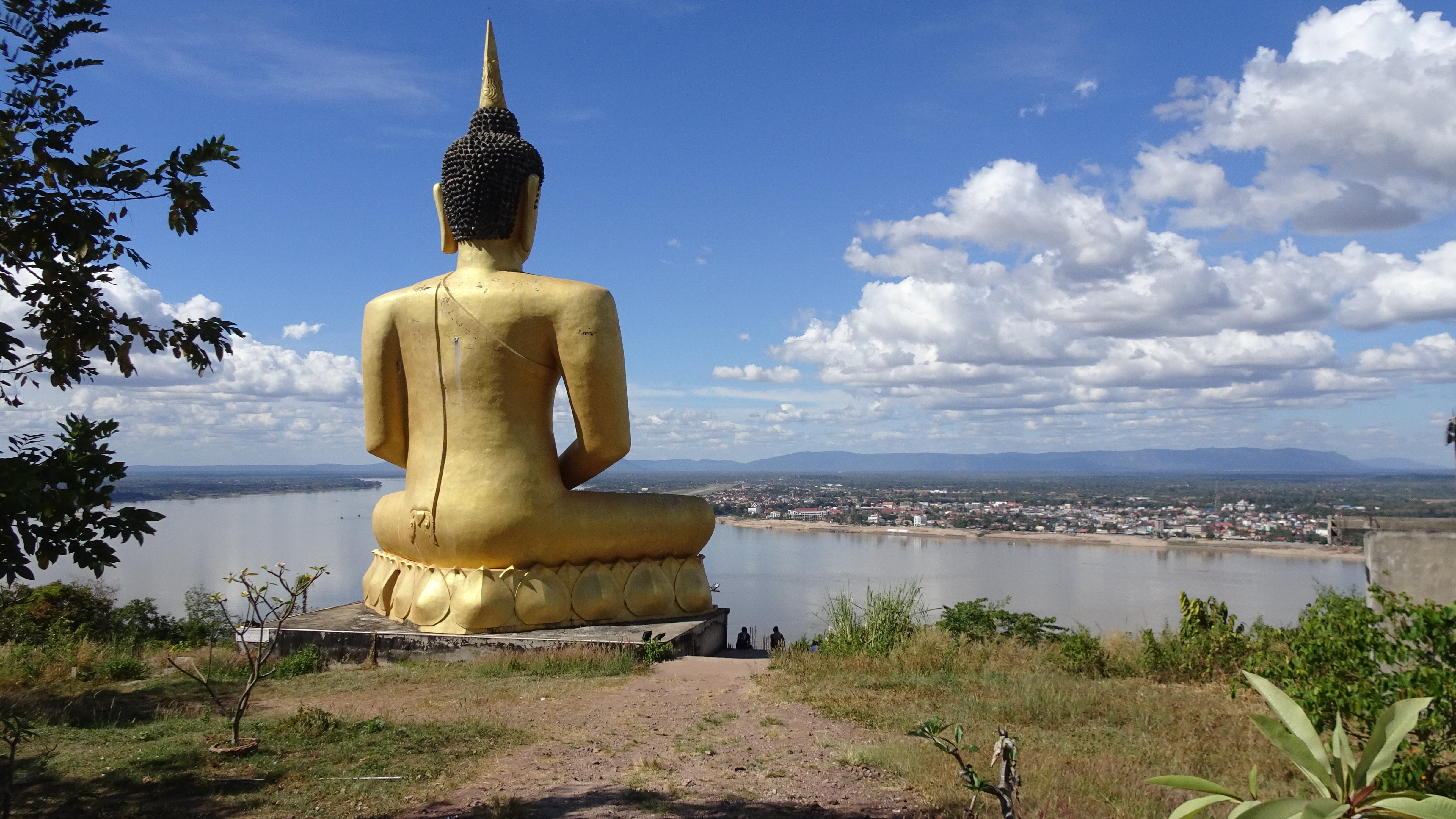 Von den zahlreichen Sehenswürdigkeiten in und außerhalb der Stadt besuchen wir letztendlich die zwei wohl wichtigsten: Die rund 20 Meter hohe, oben auf dem Berg sitzende Buddhafigur, 7 Kilometer nördlich hinter der Japanischen Brücke und nach dem Mittagsimbiss (schon in deutlich kleinerer 3er-Gruppe) den Tempel Wat Luang neben der Französischen Brücke, der eine buddhistische Schule und eine Bibliothek beherbergt und vor dem eine weiße, glockenförmige Stupa steht, die die Asche von Katay Don Sasorit enthält.