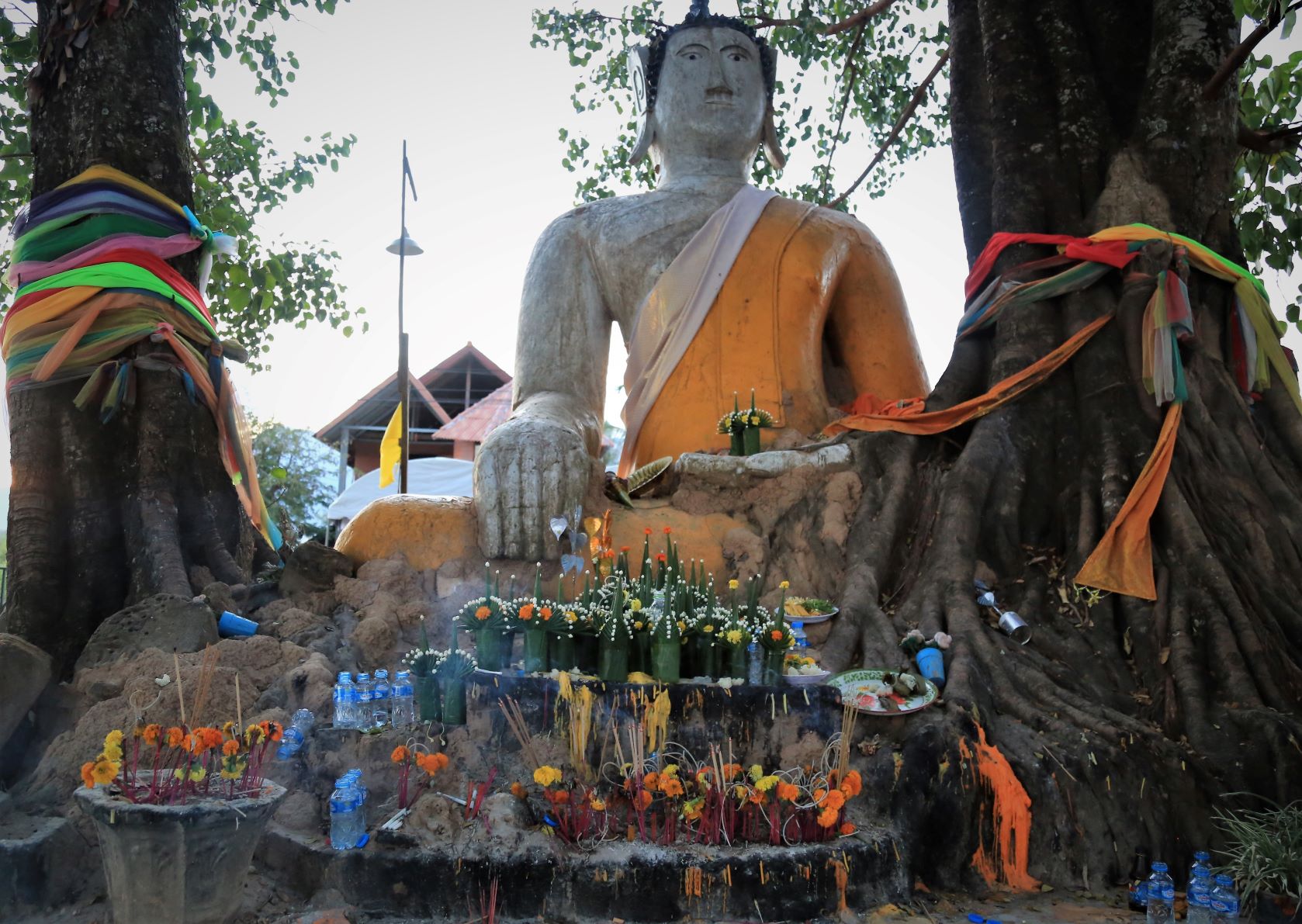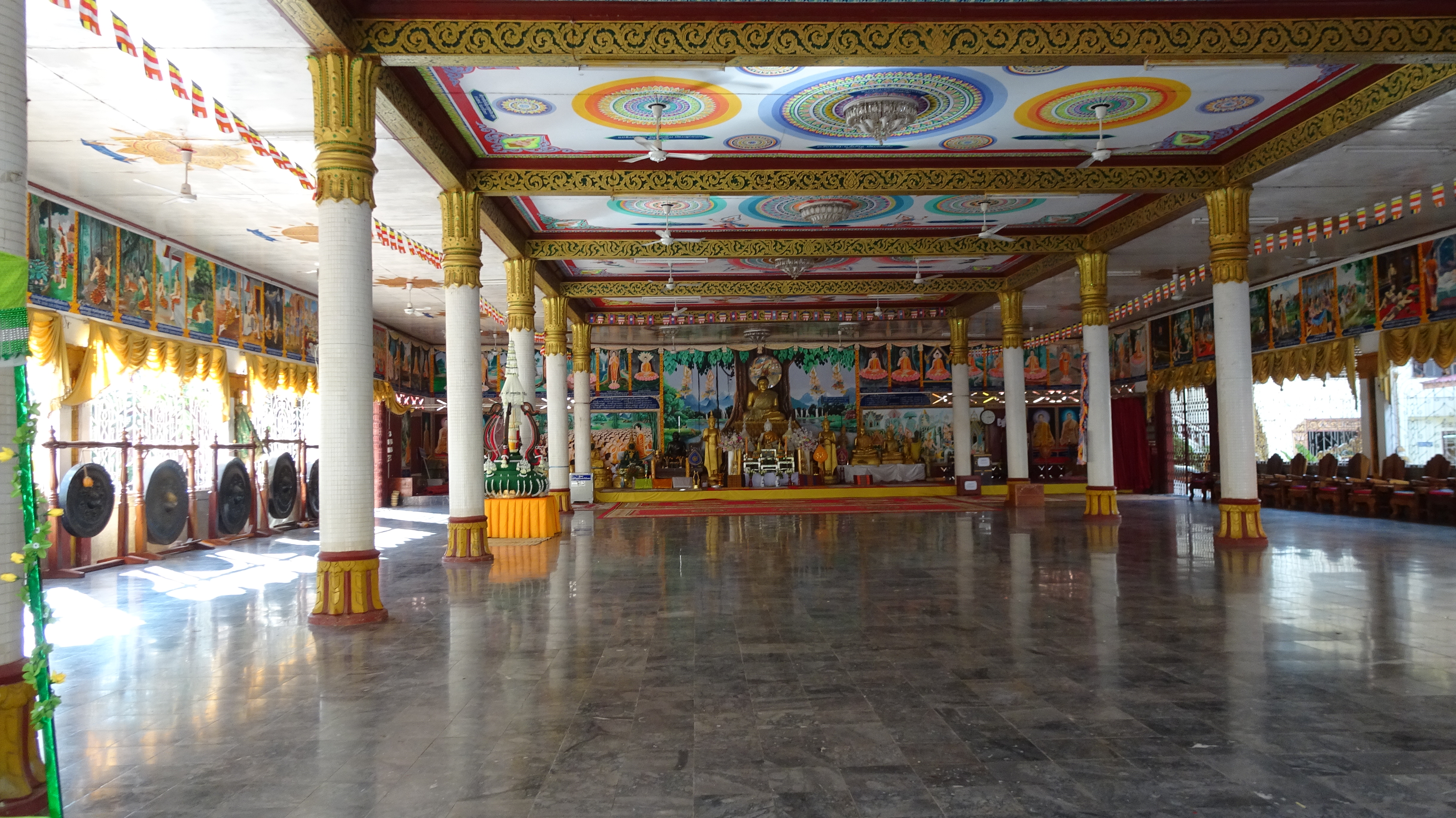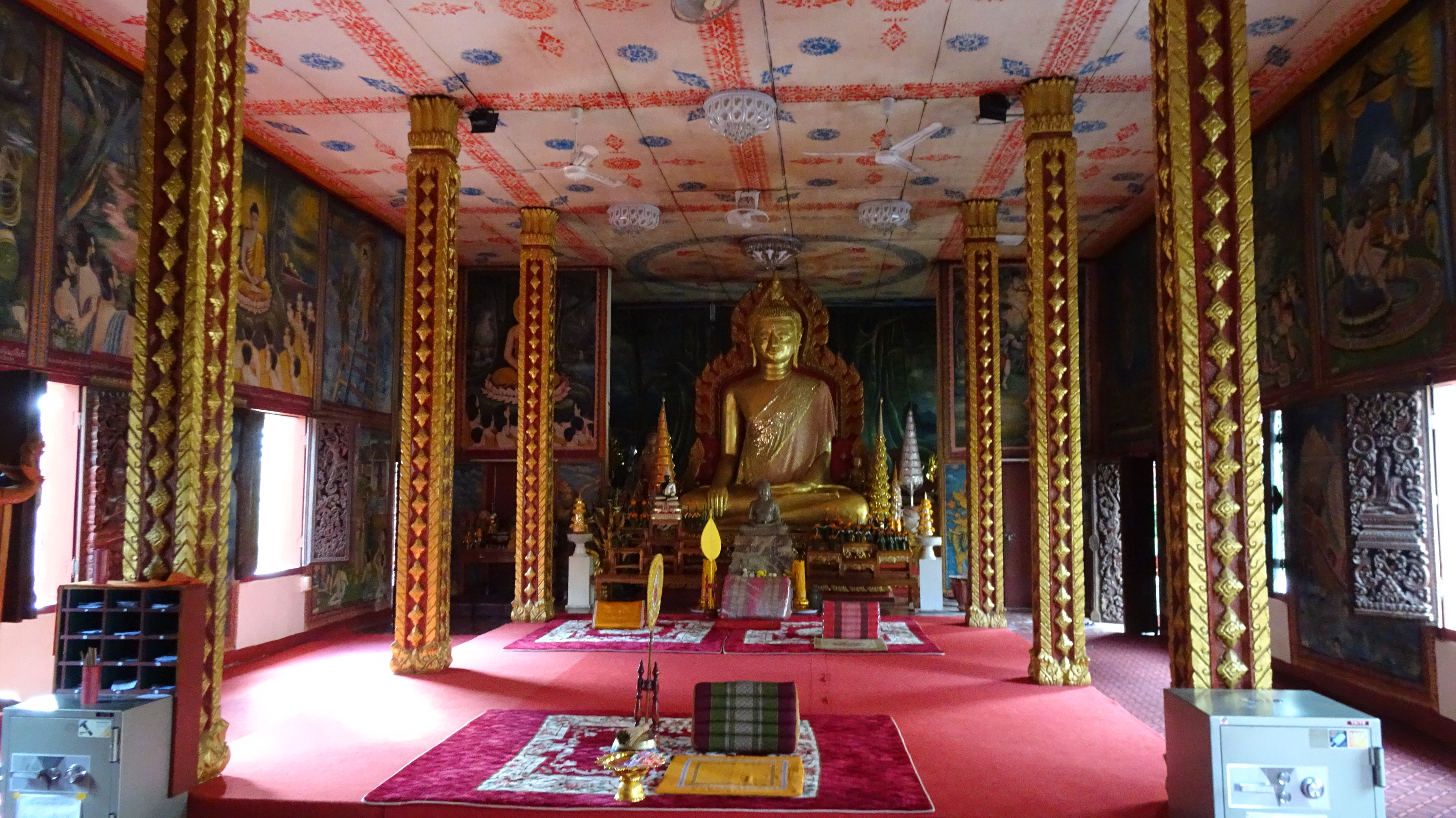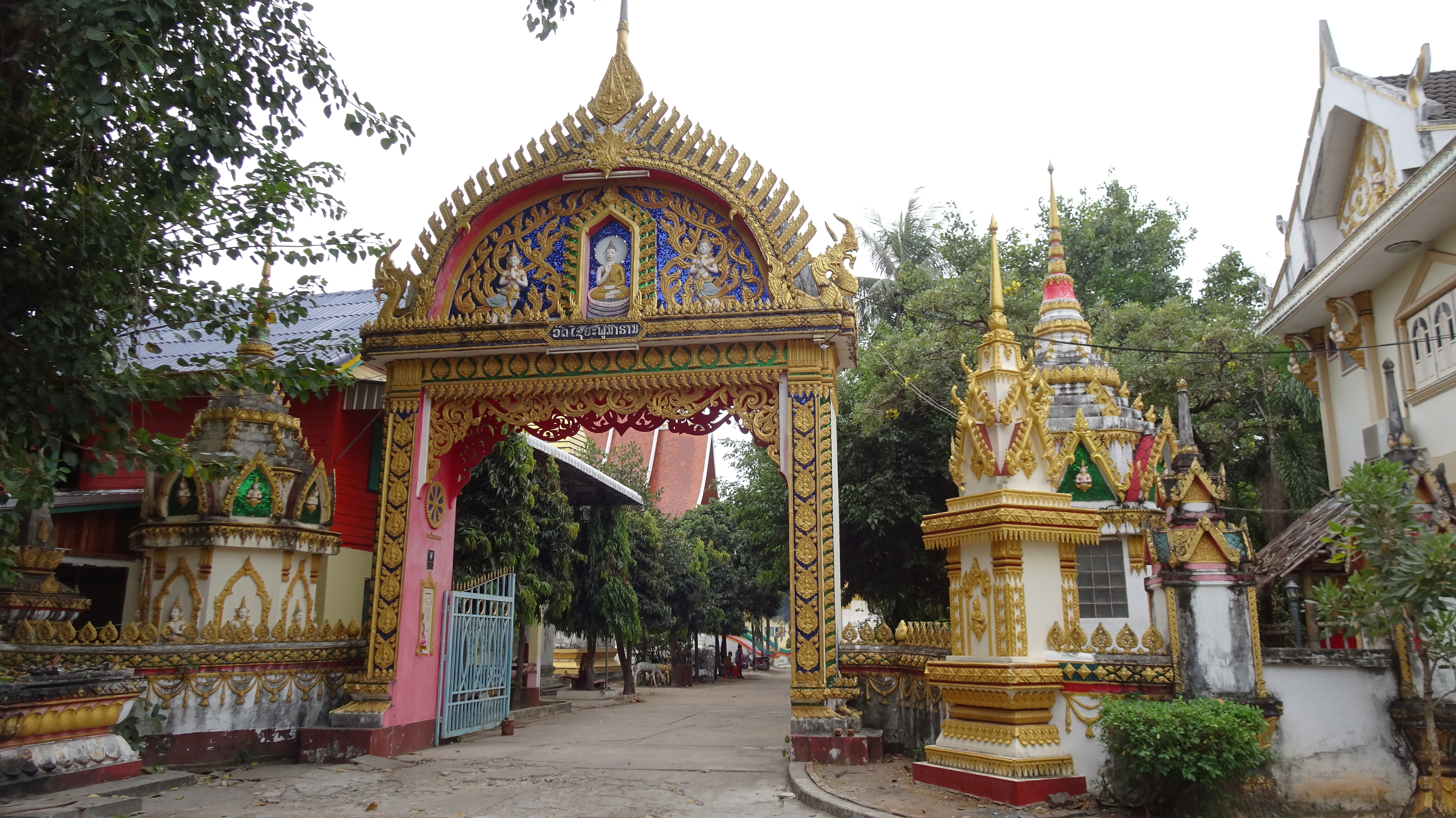 Von den zahlreichen Sehenswürdigkeiten in und außerhalb der Stadt besuchen wir letztendlich die zwei wohl wichtigsten: Die rund 20 Meter hohe, oben auf dem Berg sitzende Buddhafigur, 7 Kilometer nördlich hinter der Japanischen Brücke und nach dem Mittagsimbiss (schon in deutlich kleinerer 3er-Gruppe) den Tempel Wat Luang neben der Französischen Brücke, der eine buddhistische Schule und eine Bibliothek beherbergt und vor dem eine weiße, glockenförmige Stupa steht, die die Asche von Katay Don Sasorit enthält.