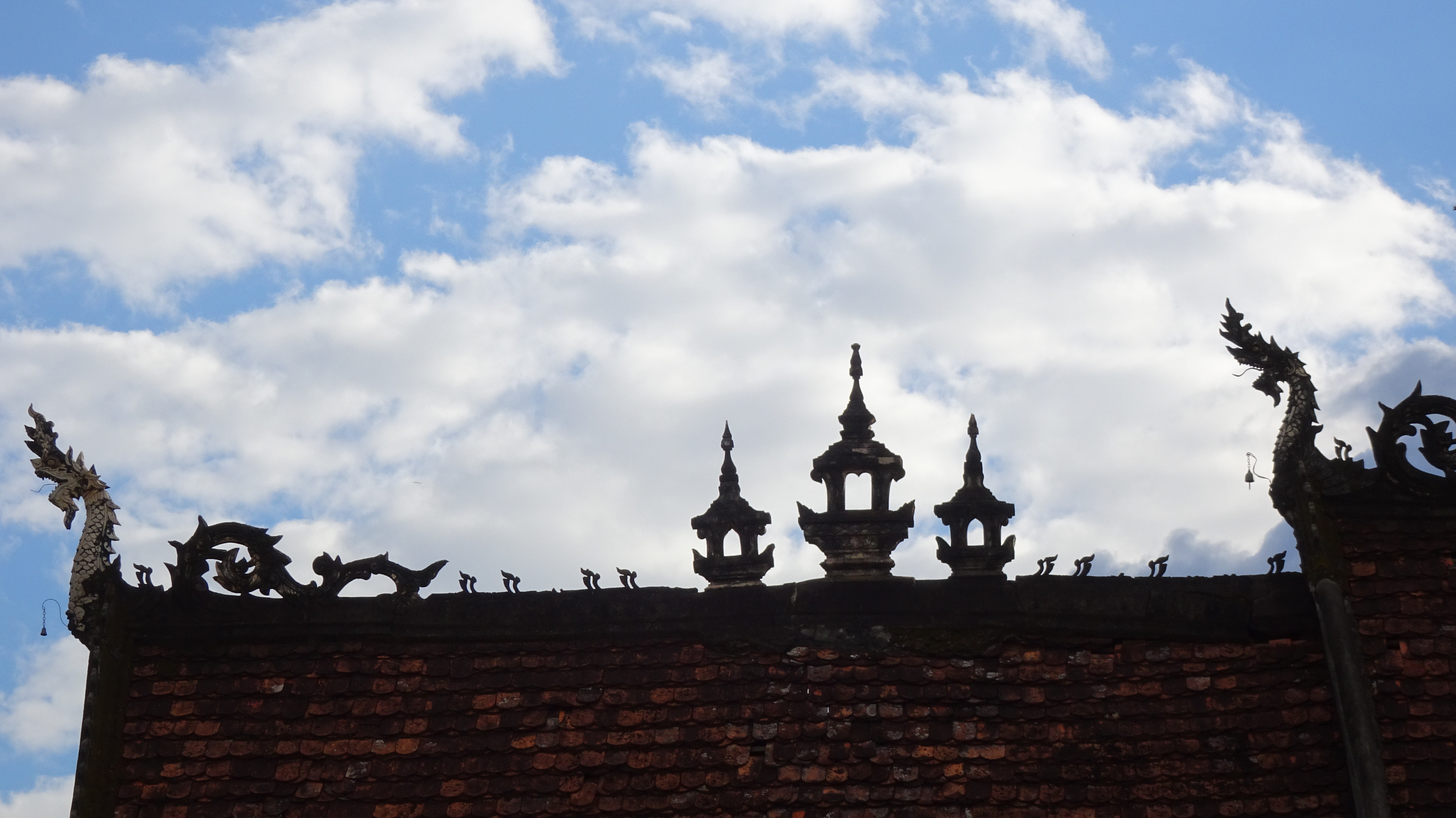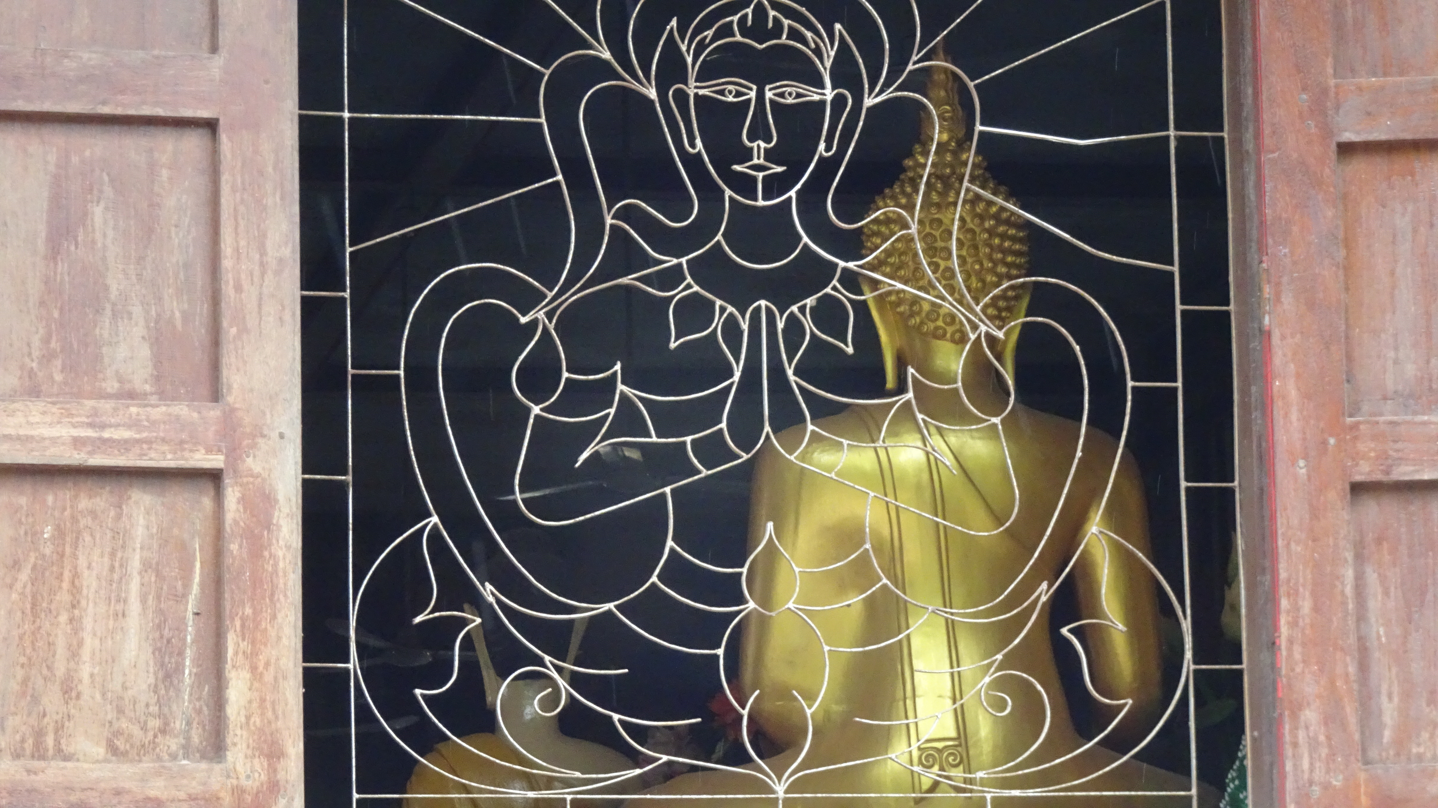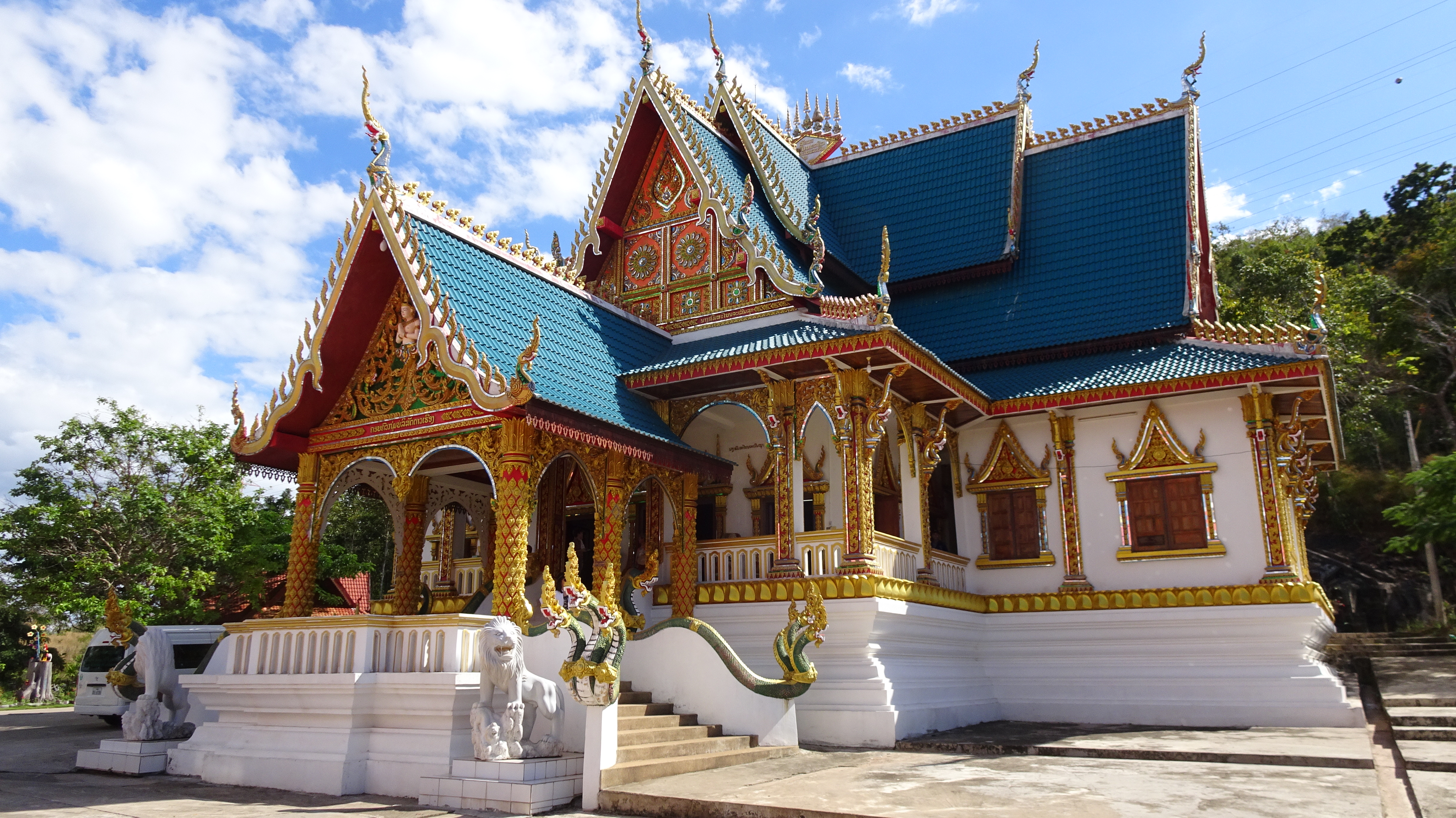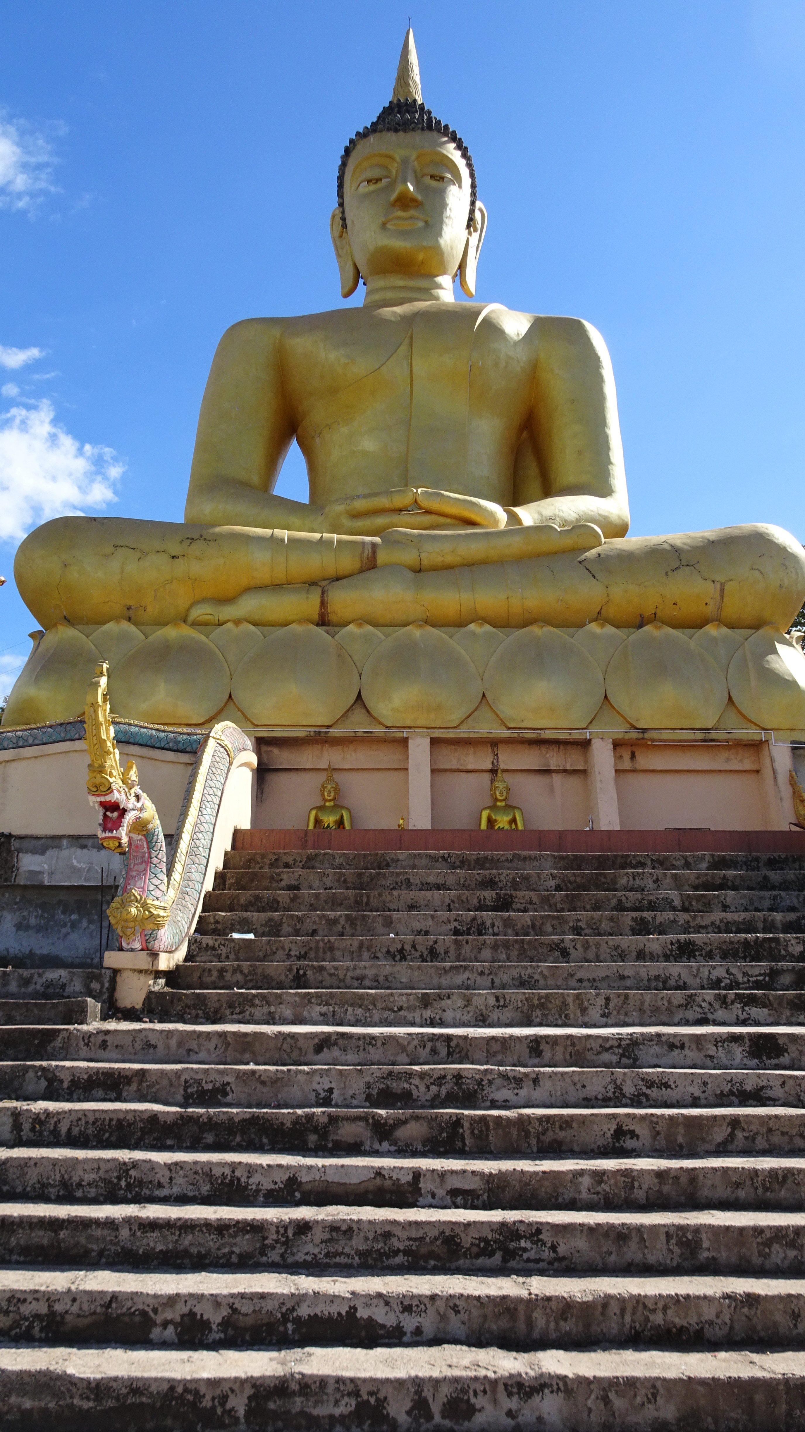 Die Rückfahrt in die Stadt ist dann insgesamt auch nicht kürzer als die Hinfahrt, aber es geht immerhin mal wieder „tendenziell bergab“. Außer zum Buddha, zu dem führt die Straße einige Höhenmeter hinauf. Wir sind ein bißchen froh, daß Kham uns da hinaufbugsiert und wir so die unendlich lange Treppe in der Mittagshitze nur vom Weiten sehen.
