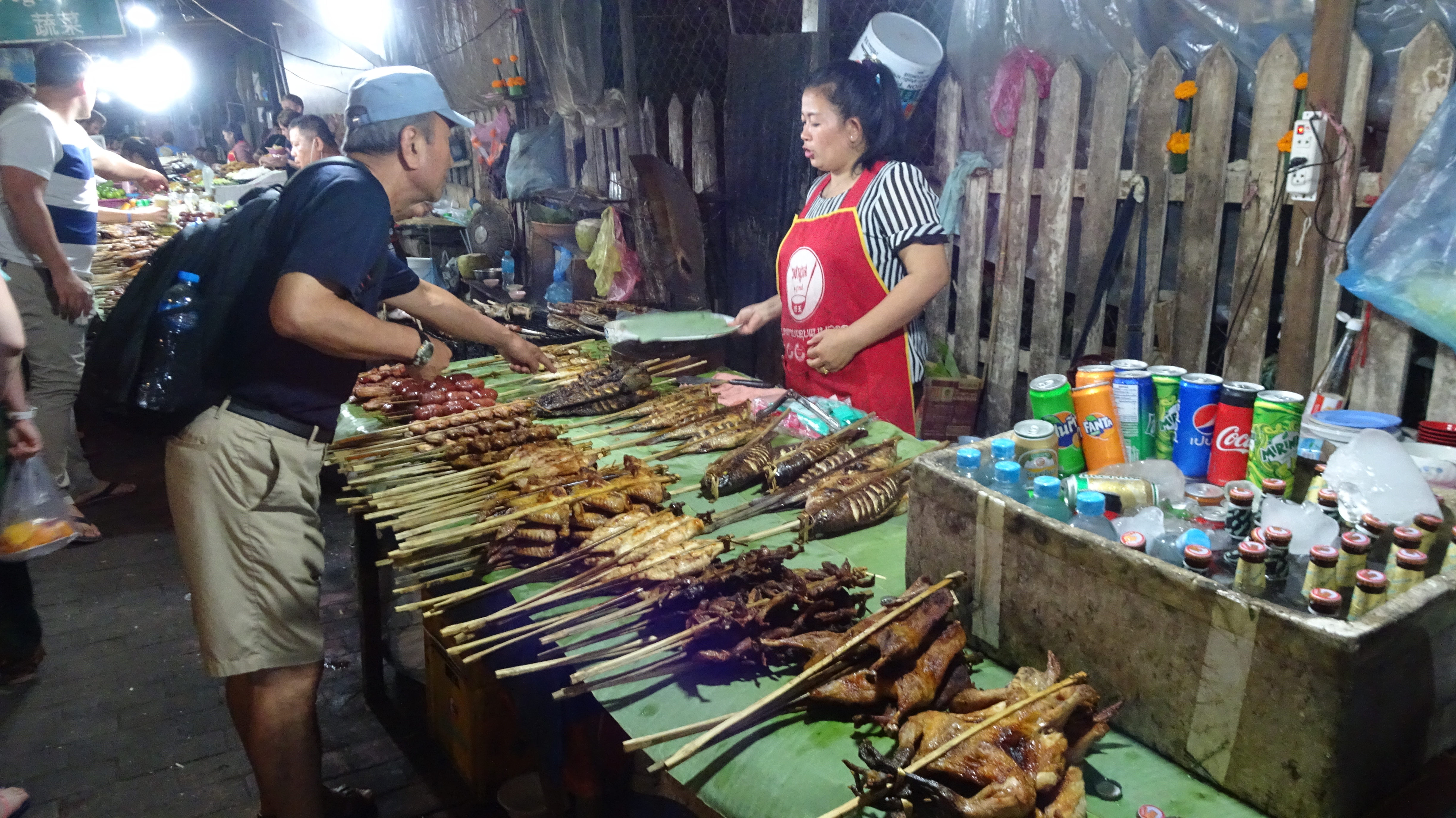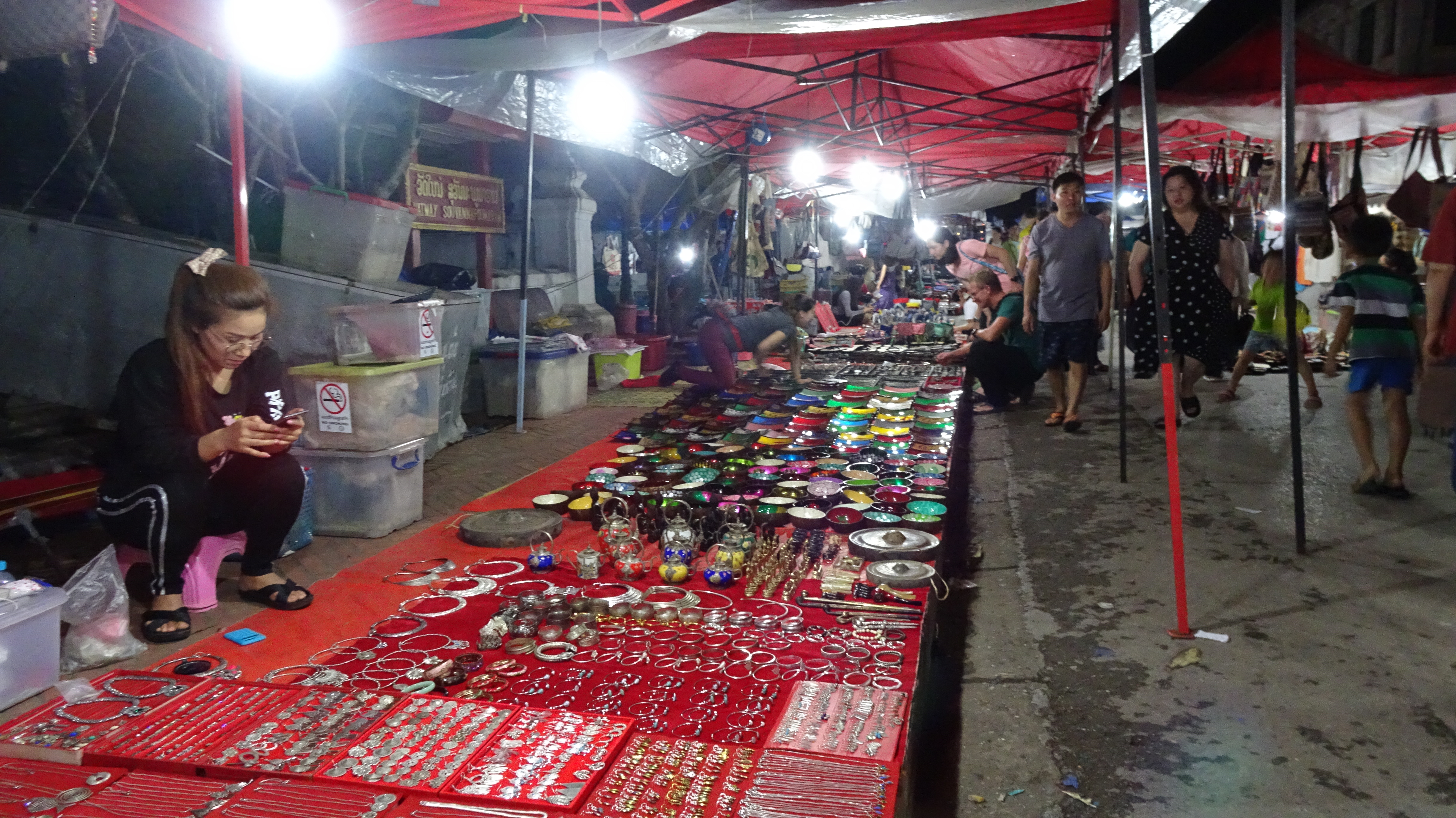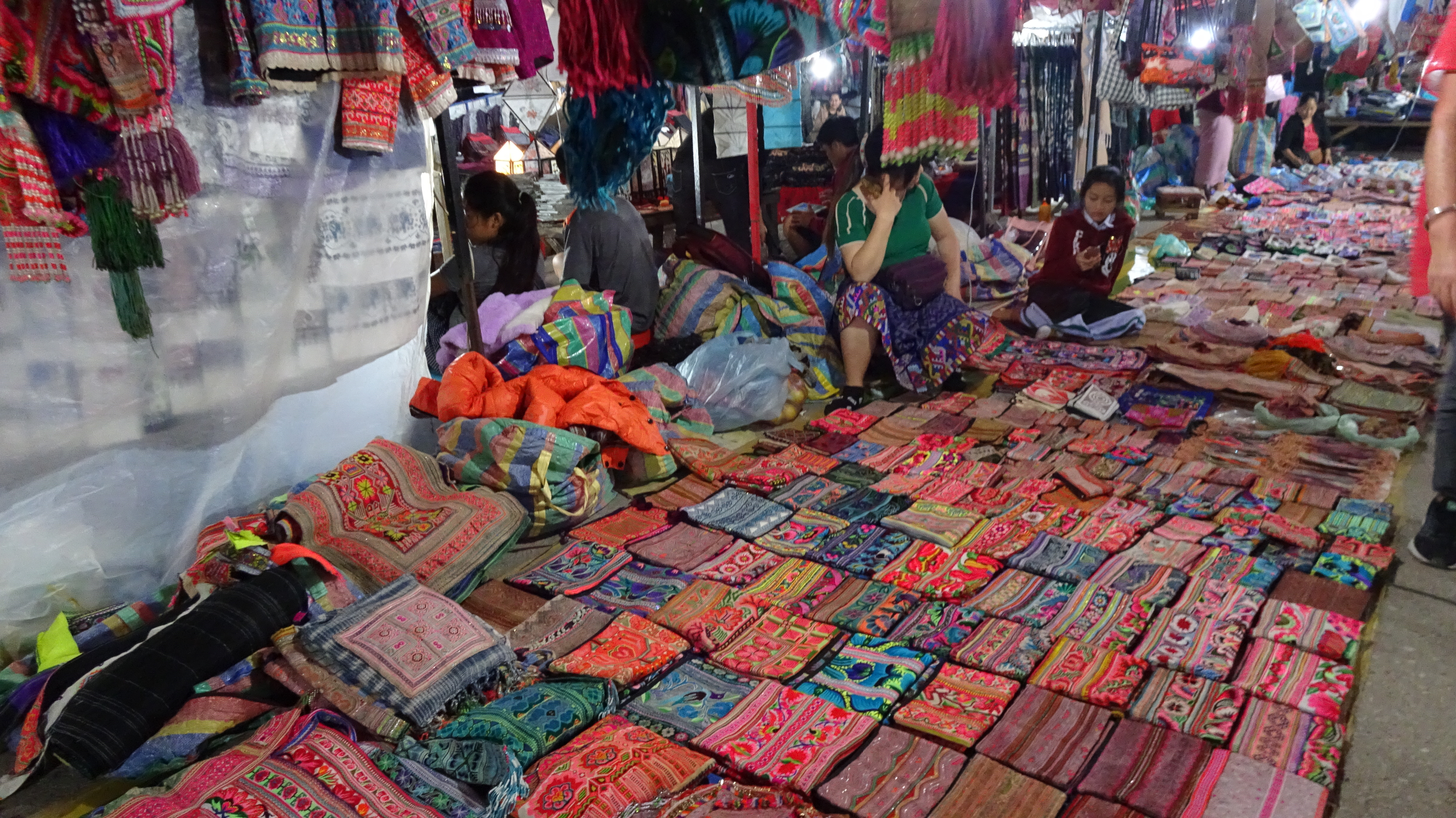 Und weil wir danach weiter genießen wollten tauchten wir unmittelbar am Ausgang des Kögigspalastes in den legendären Nachtmarkt am Fuße des Phousi-Berges in der Thanon Sisavangvong, der Hauptstraße der Altstadt. Dort werden jeden Abend (ca. 18 bis 22 Uhr) zwischen dem Königspalast und der Querstraße Thanon Setthathirat von Hand gefertigte Textilien, Souvenirs und Lebensmittel angeboten. Viele der Händlerinnen gehören dem Volk der Hmong an, die für ihre qualitativ hochwertigen Web-, Stickerei- und Näharbeiten bekannt sind.