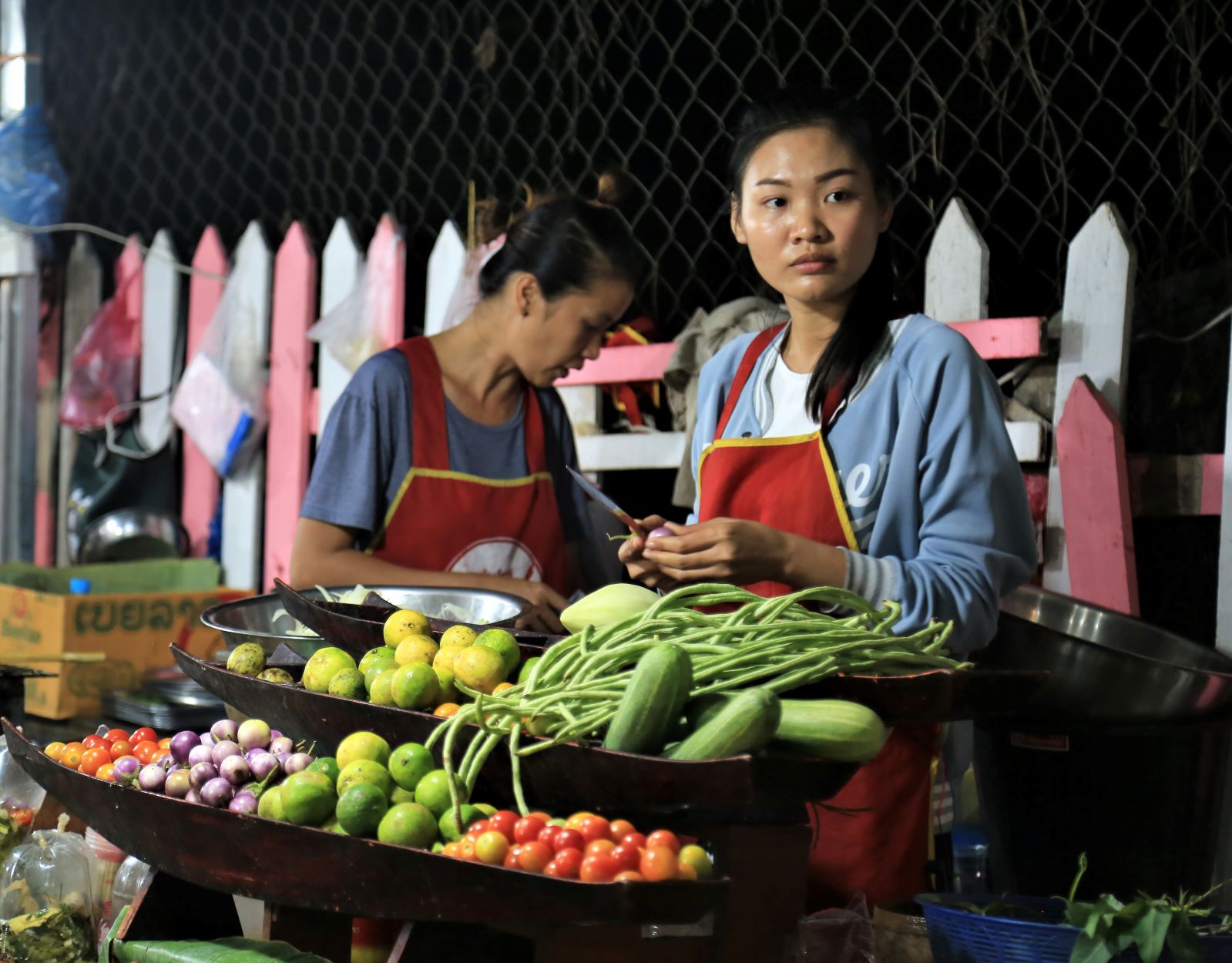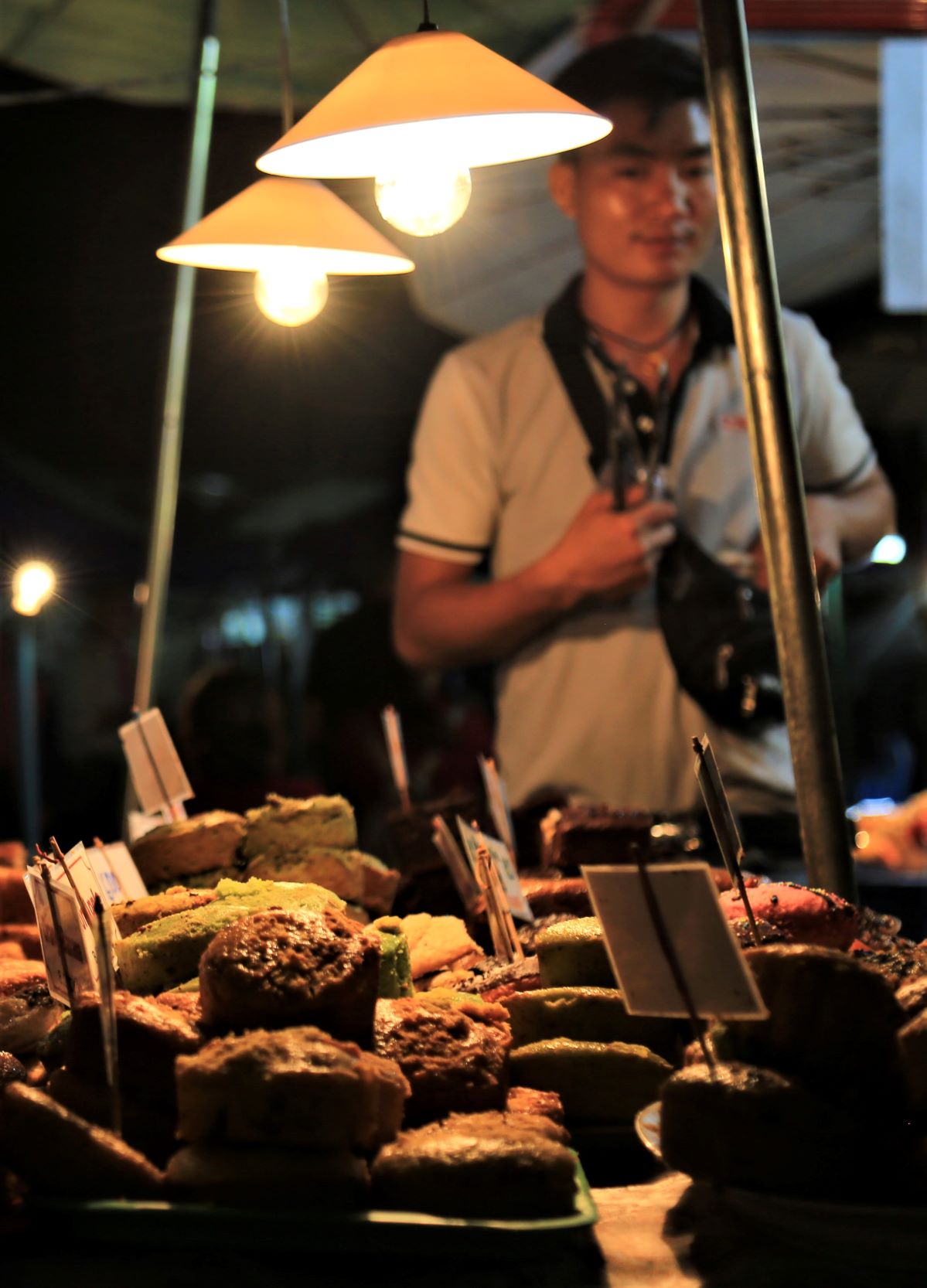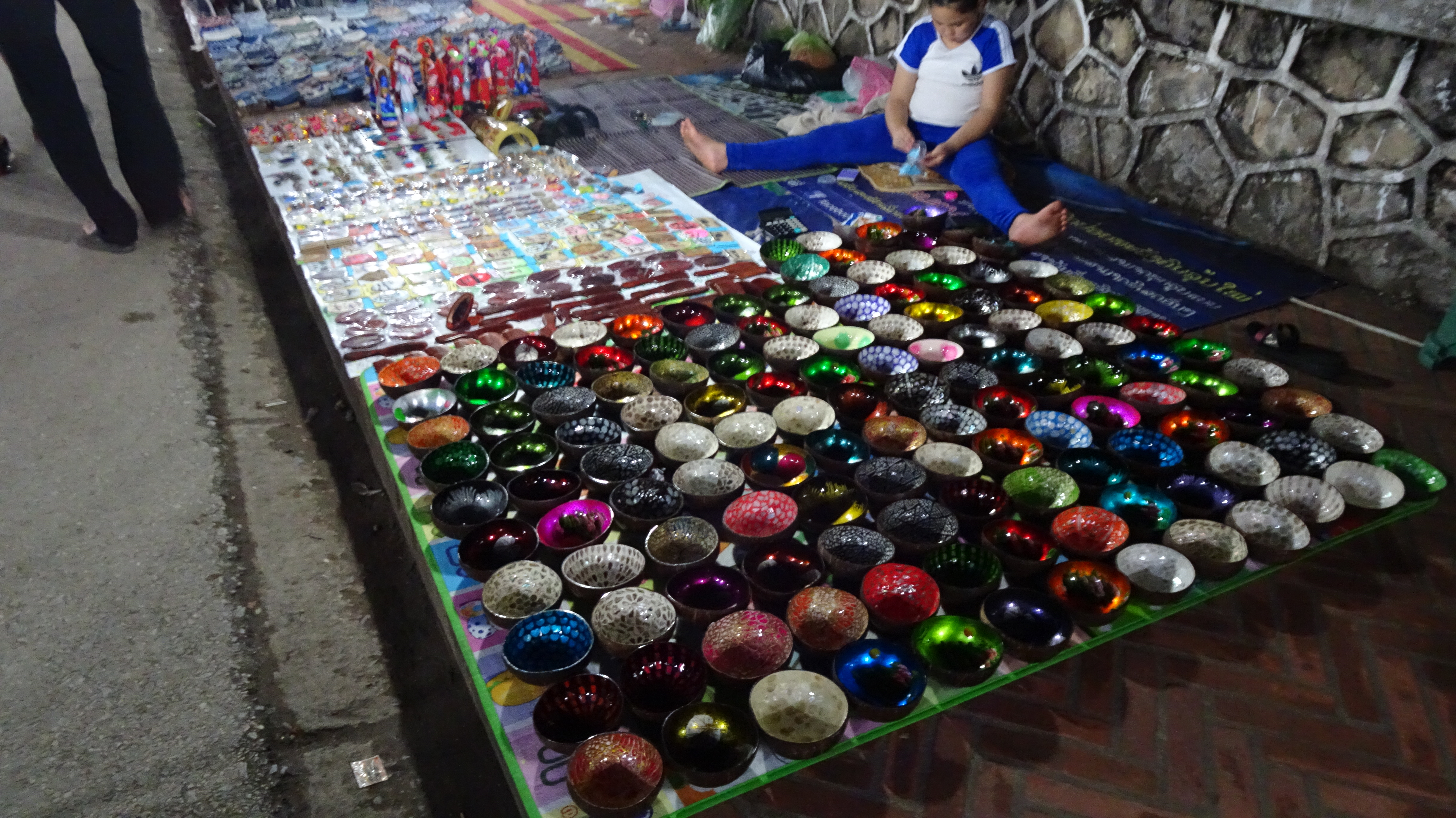 Und weil wir danach weiter genießen wollten tauchten wir unmittelbar am Ausgang des Kögigspalastes in den legendären Nachtmarkt am Fuße des Phousi-Berges in der Thanon Sisavangvong, der Hauptstraße der Altstadt. Dort werden jeden Abend (ca. 18 bis 22 Uhr) zwischen dem Königspalast und der Querstraße Thanon Setthathirat von Hand gefertigte Textilien, Souvenirs und Lebensmittel angeboten. Viele der Händlerinnen gehören dem Volk der Hmong an, die für ihre qualitativ hochwertigen Web-, Stickerei- und Näharbeiten bekannt sind.