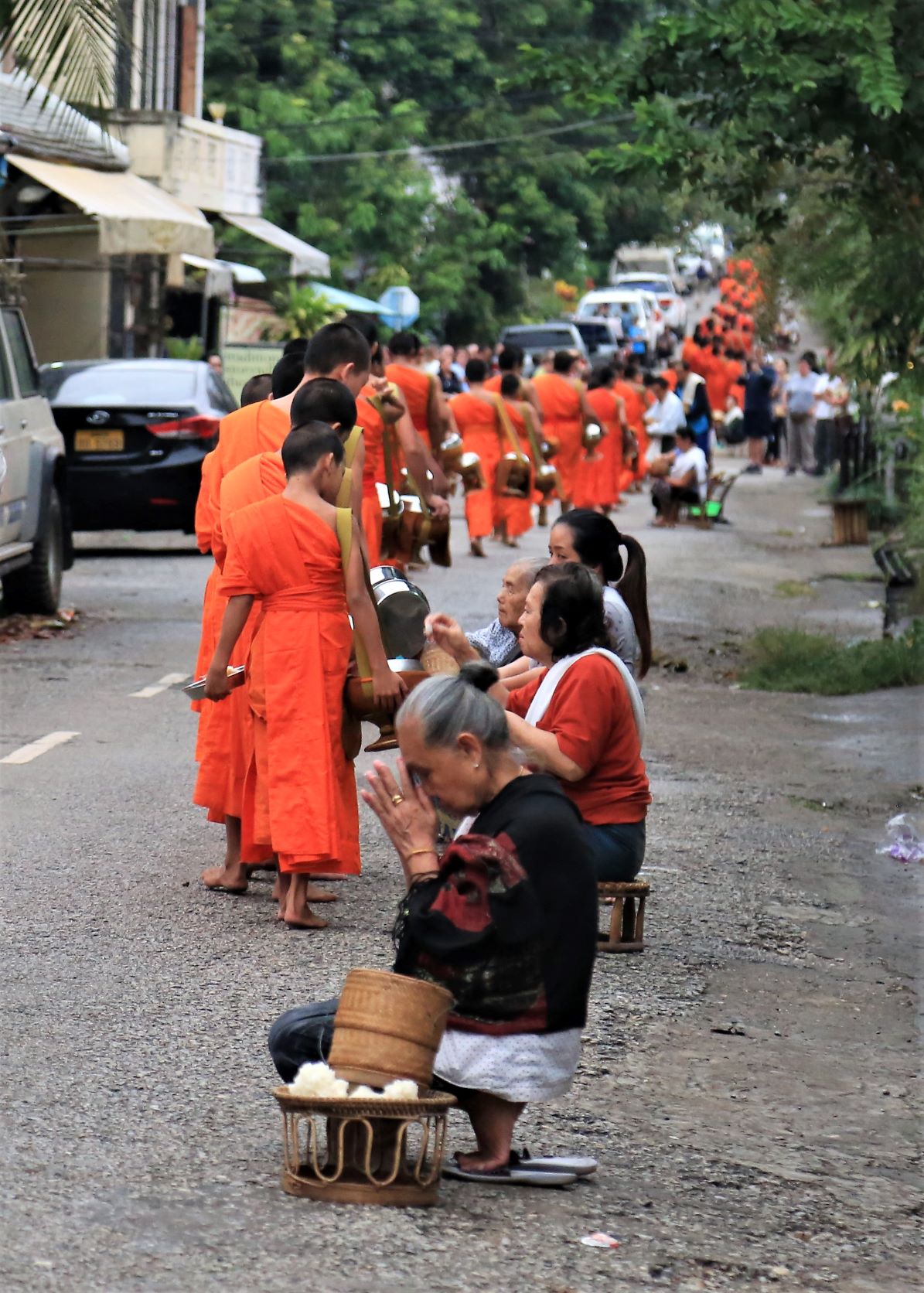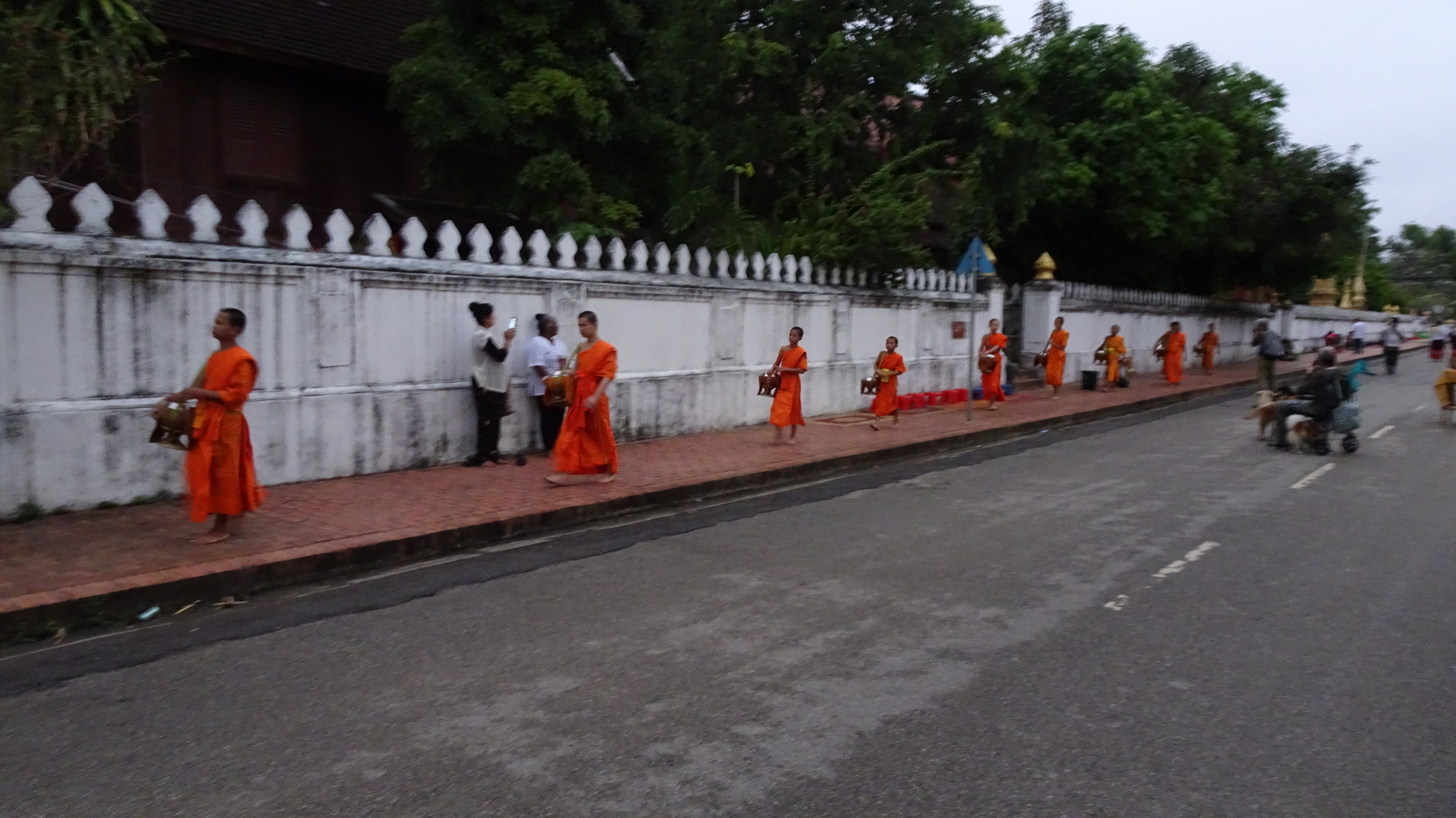 Jeden Morgen verlassen Hunderte von ihnen pünktlich mit dem Sonnenaufgang ihre Tempel, mit nichts am Leib außer ihren organgefarbenen Roben und ihren Almosenschalen. Mit Dutzenden Tempeln und bis zu dreißig Ordensbrüdern in jedem kann man sich vorstellen, wie viele Mönche Tag für Tag an dieser Prozession teilnehmen.
