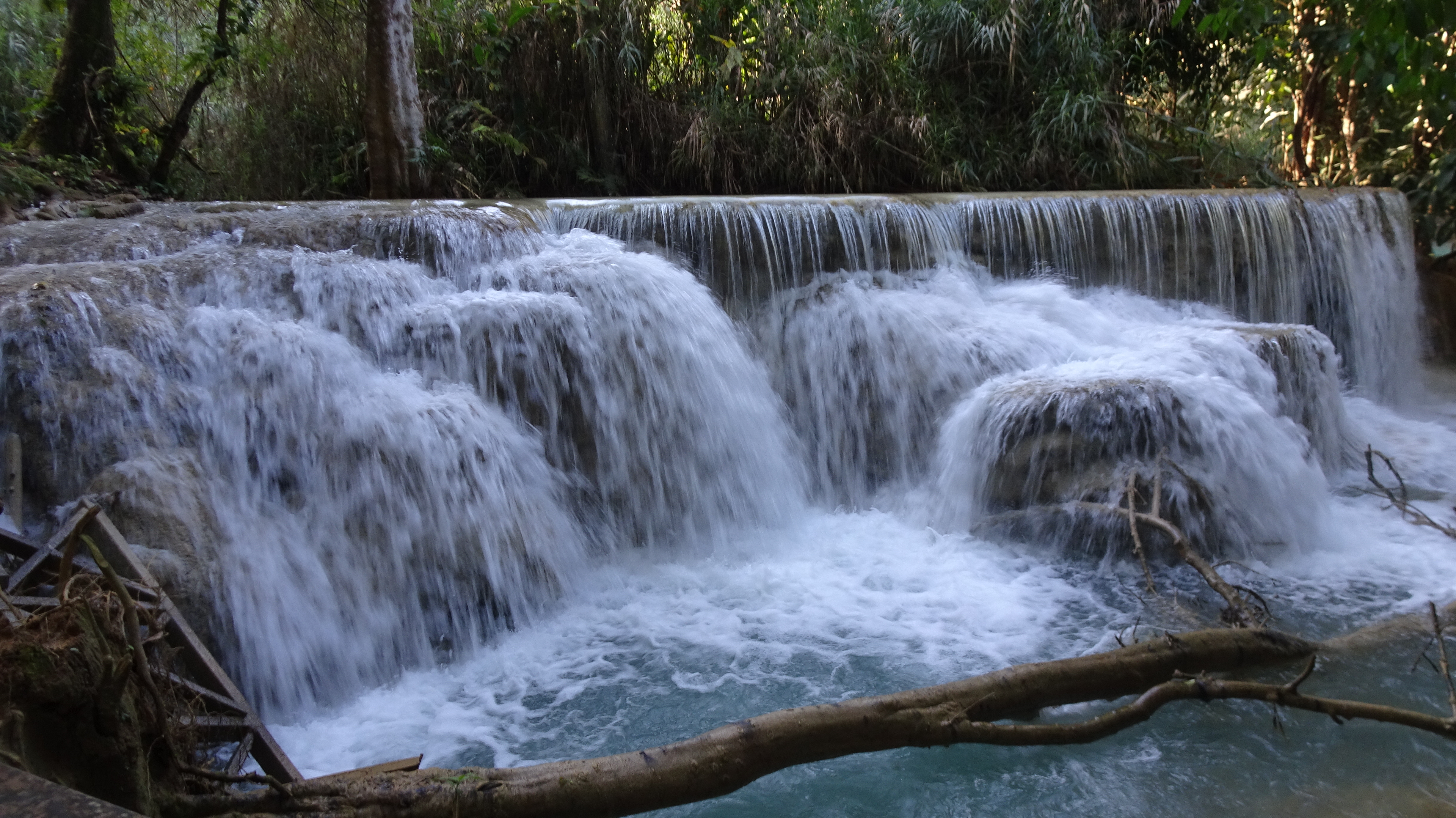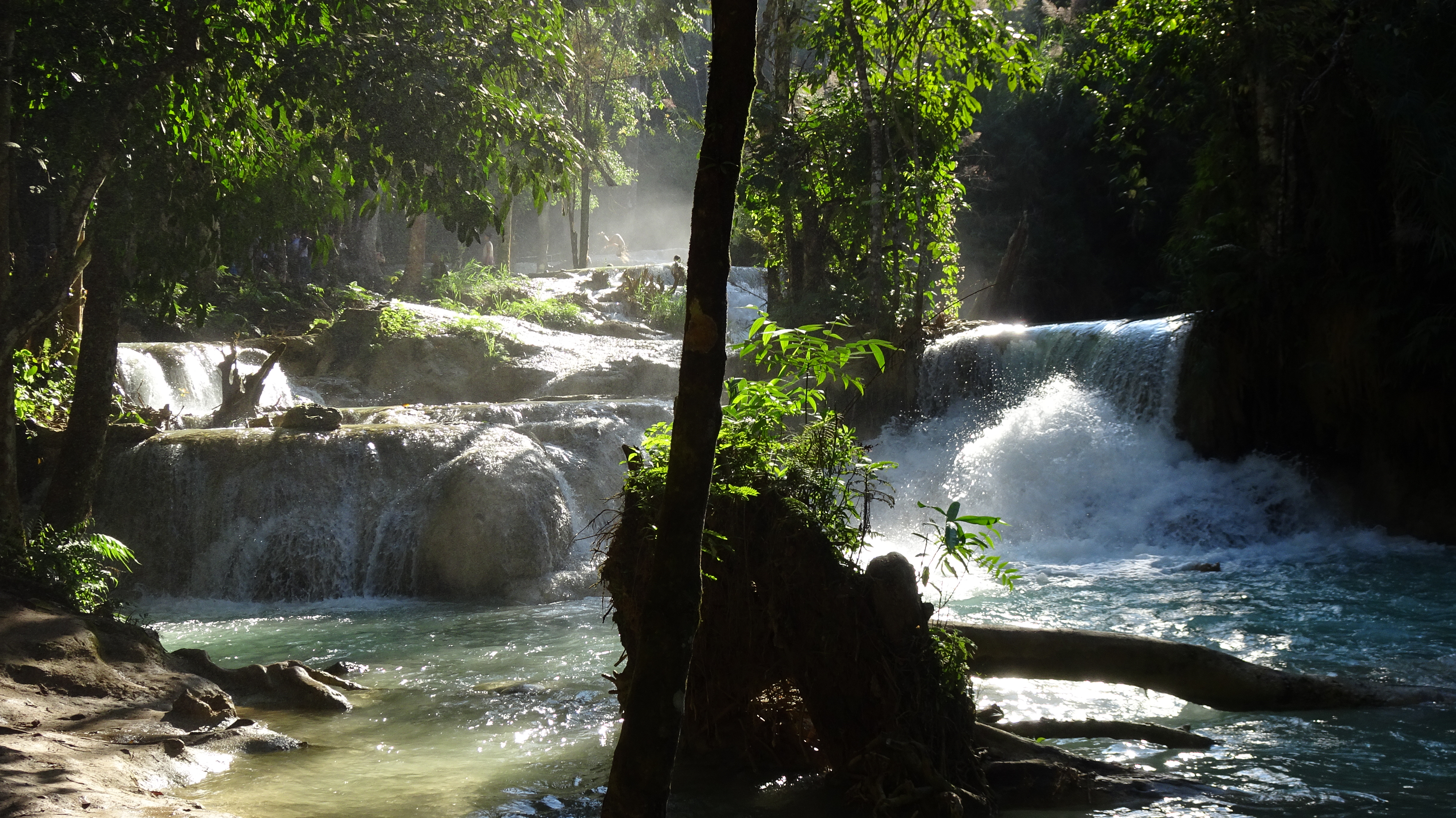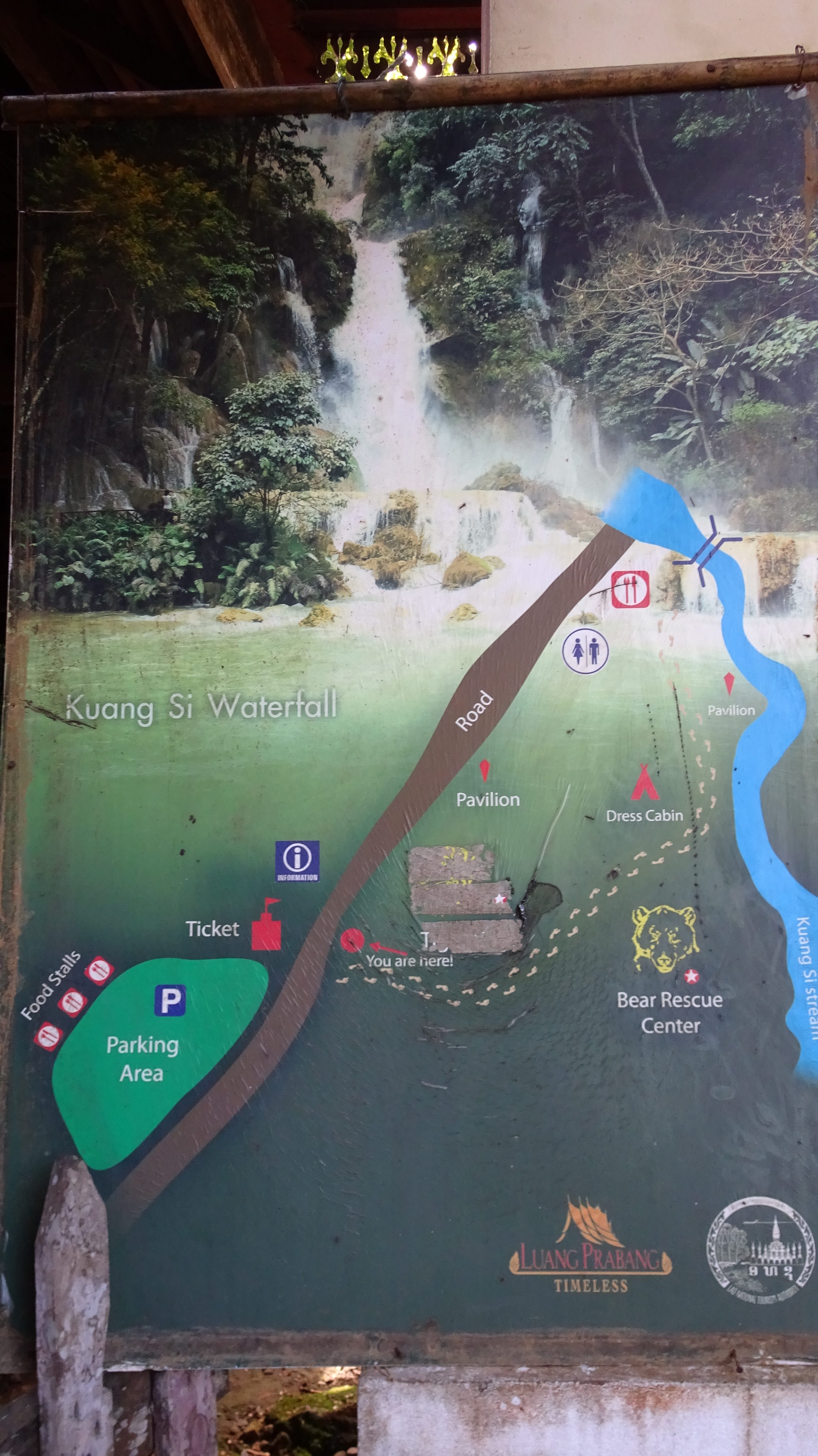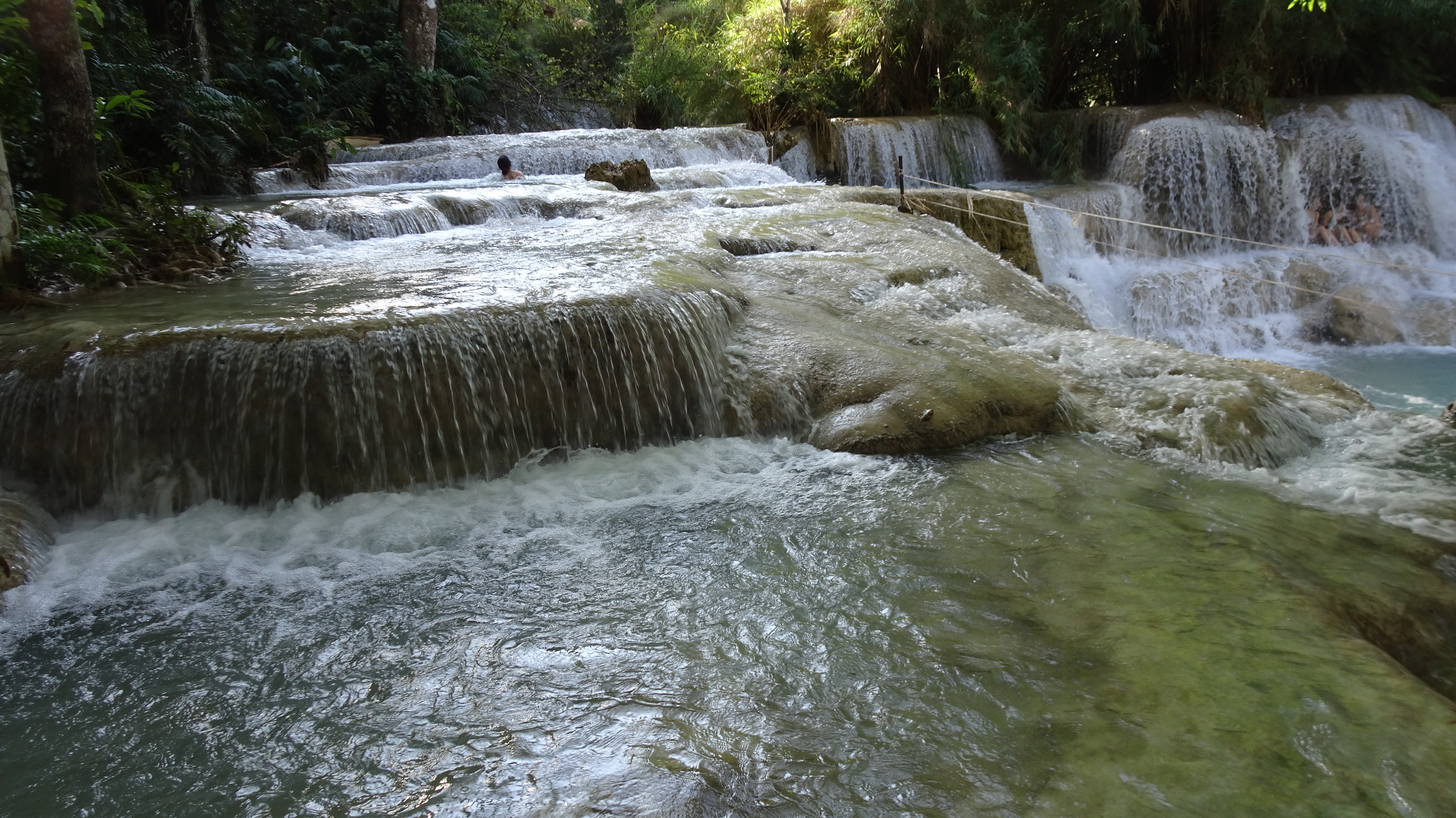 „Kuang Si (andere Schreibweisen sind Kuang Xi oder Kouang Si), auch bekannt als Tat Kuang Si (laotisch ຕາດກວາງຊີ; Tat steht in Lao für Wasserfall), ist ein mehrstufiger Wasserfall. Er liegt circa 30 km südwestlich im Naturschutzgebiet Tat Kuang Si Park und gehört zu den touristischen Hauptattraktionen der Region. Die Besucherströme beweisen das.