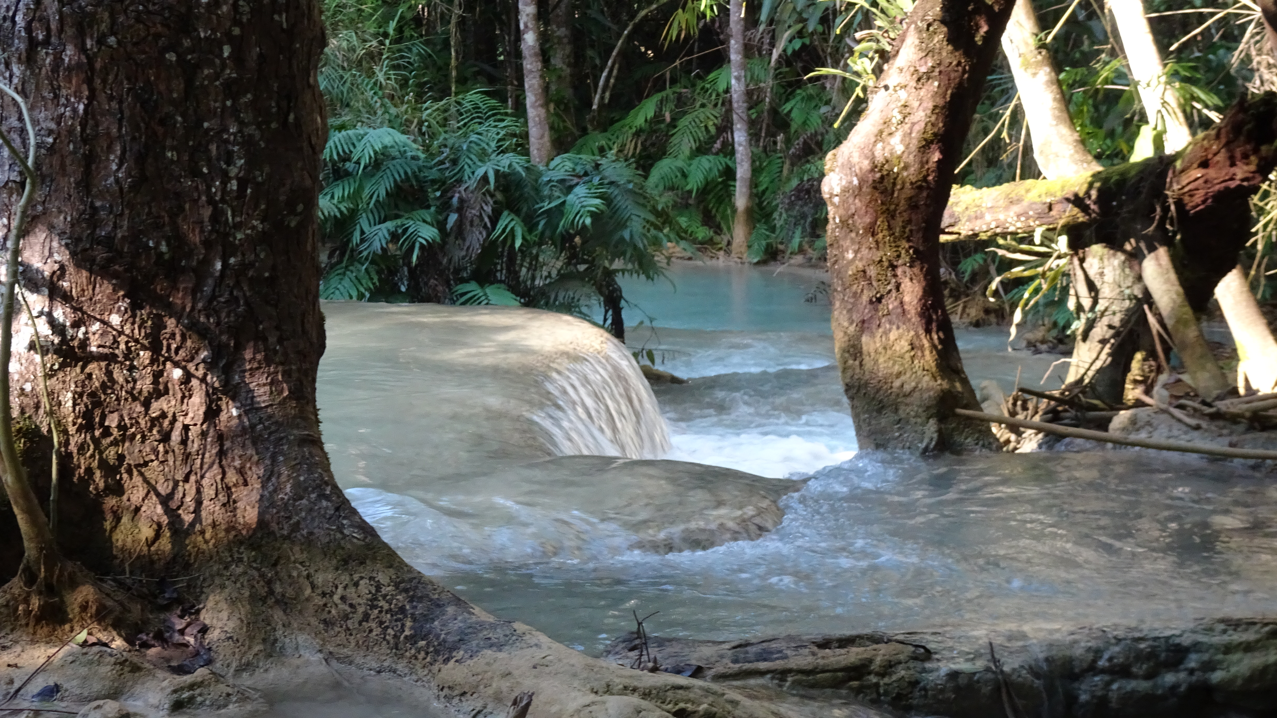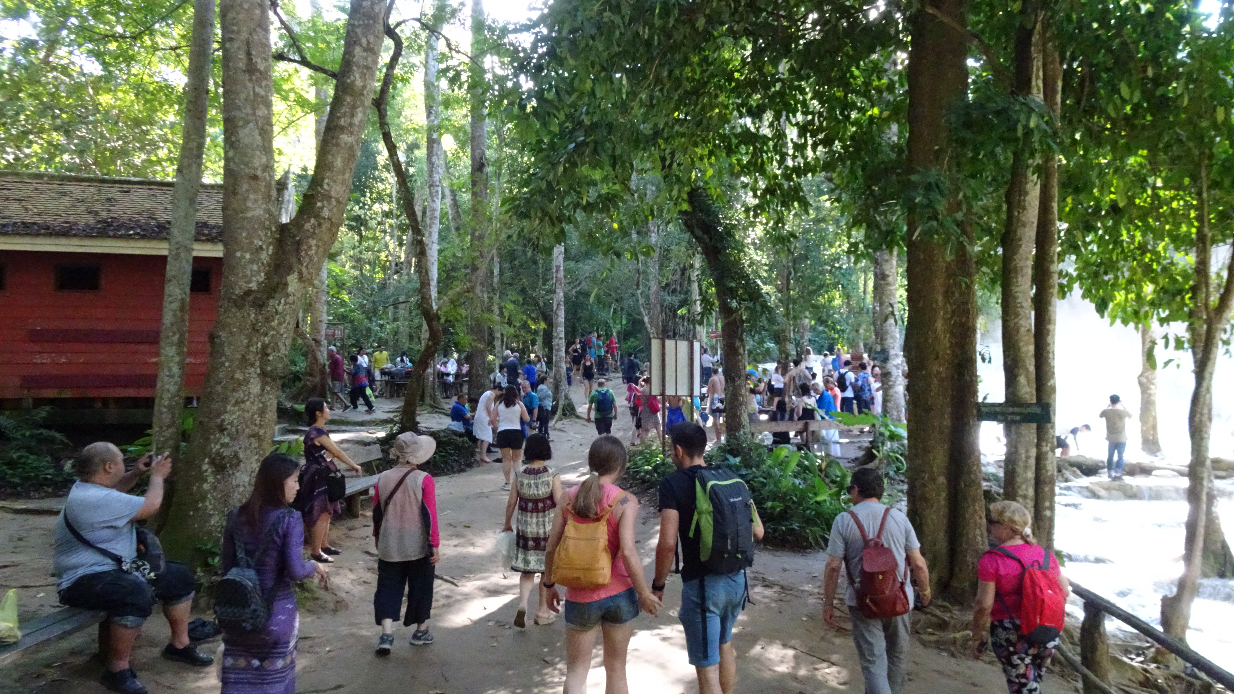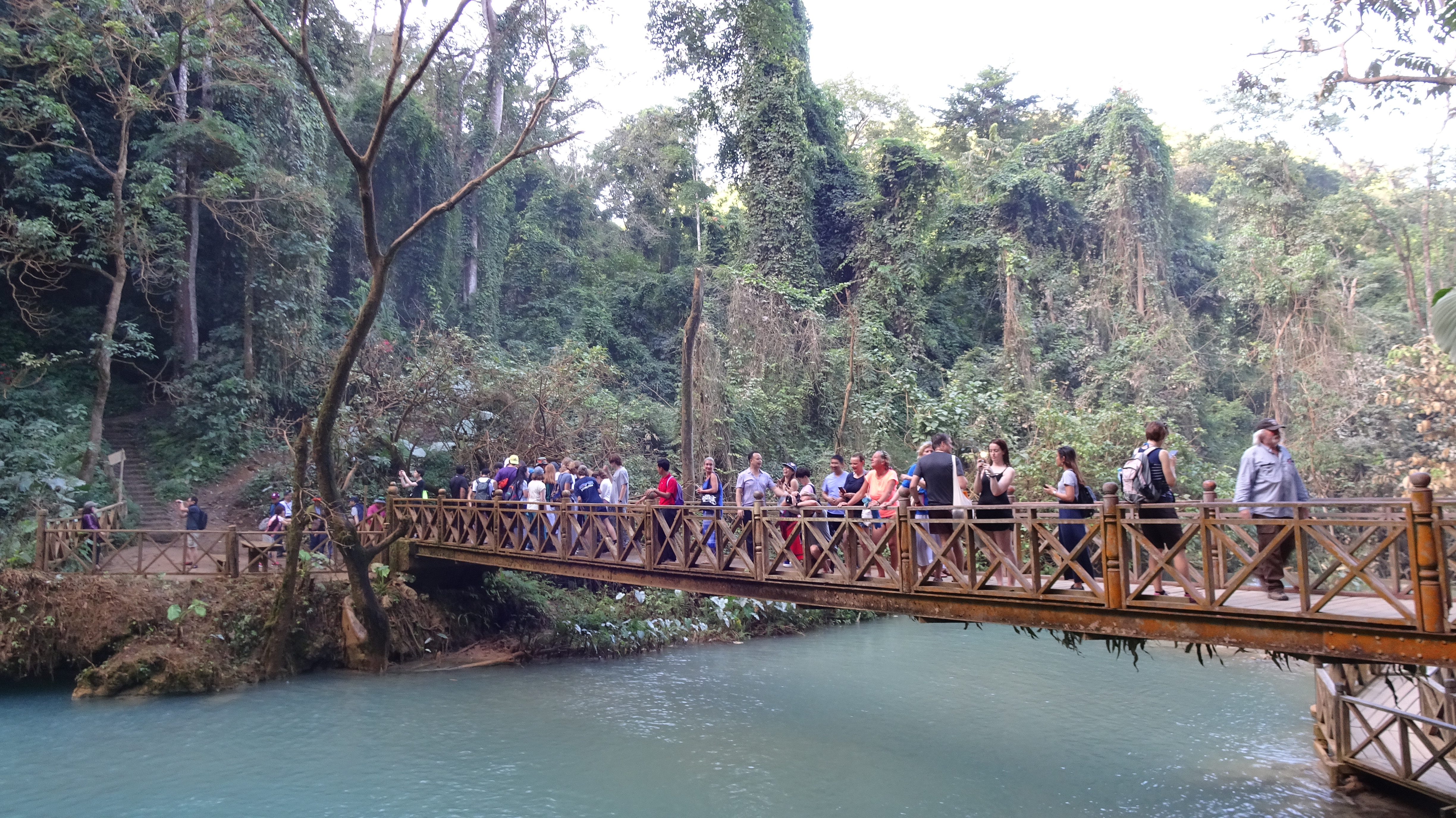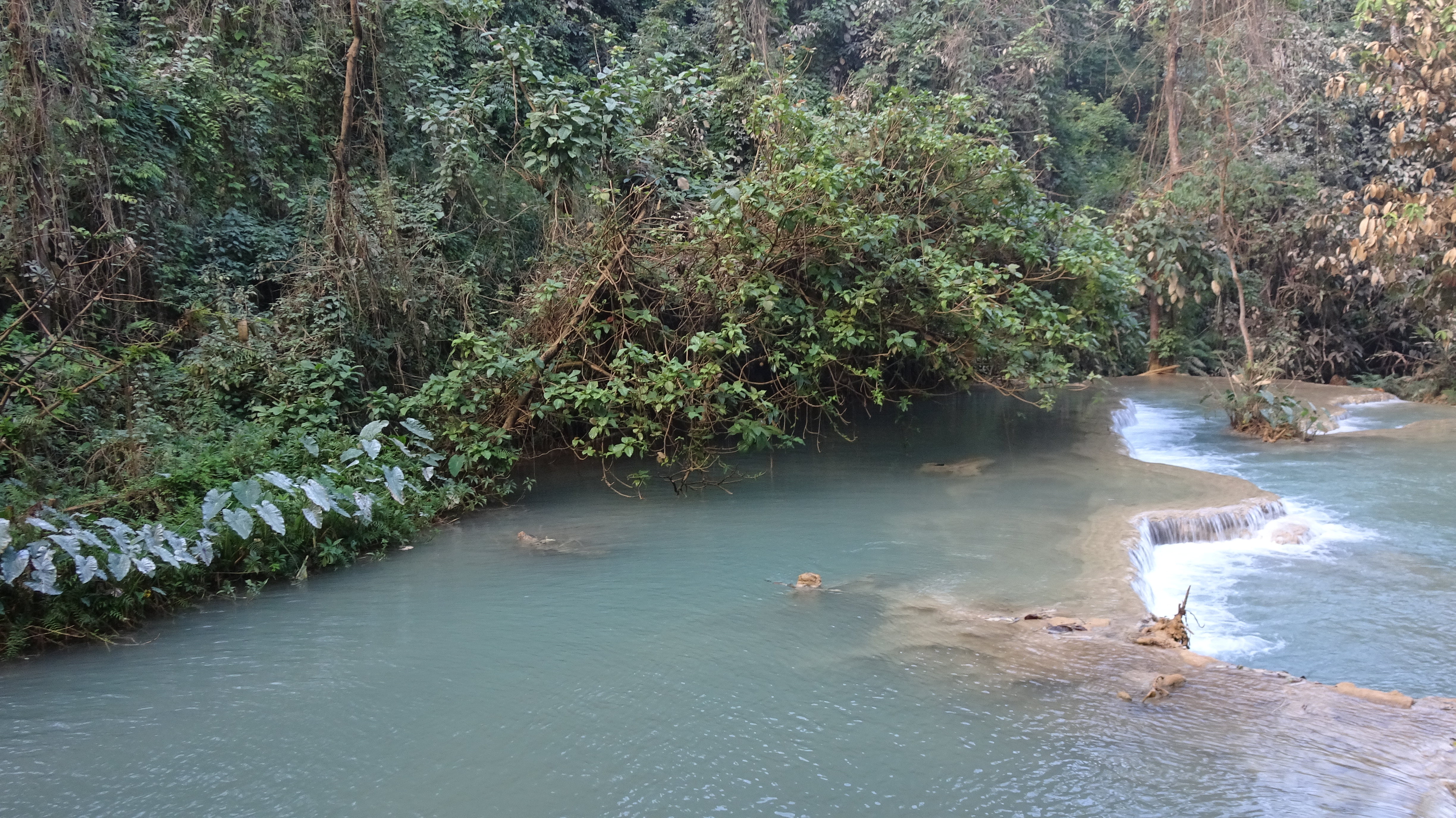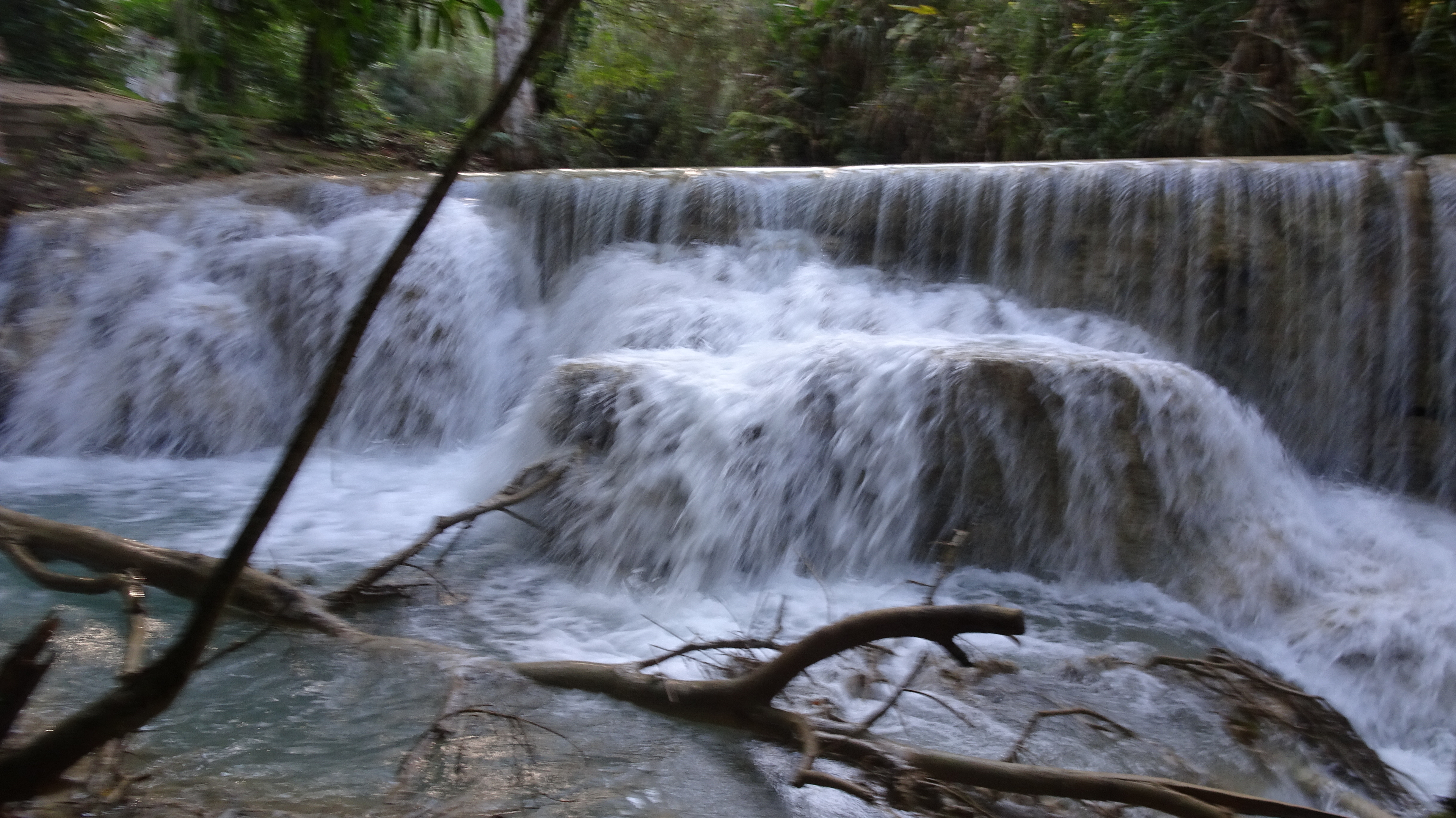 „Kuang Si (andere Schreibweisen sind Kuang Xi oder Kouang Si), auch bekannt als Tat Kuang Si (laotisch ຕາດກວາງຊີ; Tat steht in Lao für Wasserfall), ist ein mehrstufiger Wasserfall. Er liegt circa 30 km südwestlich im Naturschutzgebiet Tat Kuang Si Park und gehört zu den touristischen Hauptattraktionen der Region. Die Besucherströme beweisen das.