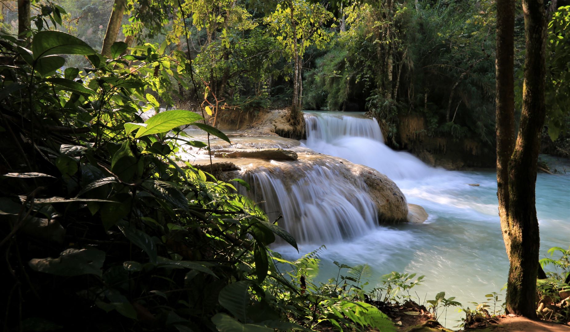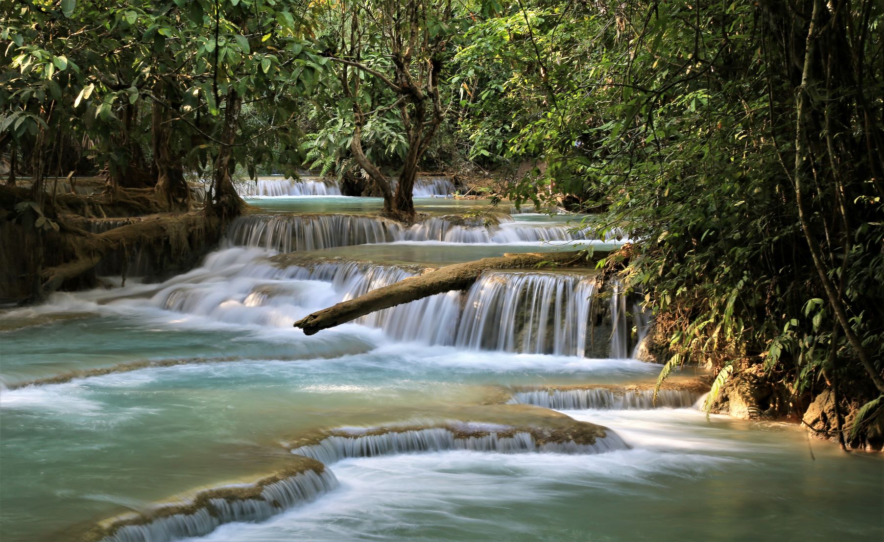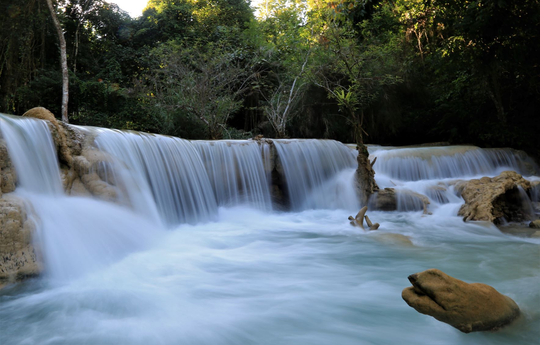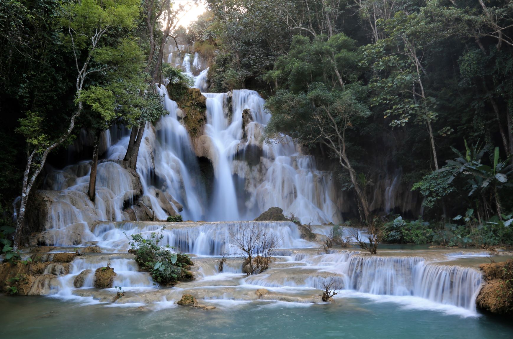 „Kuang Si (andere Schreibweisen sind Kuang Xi oder Kouang Si), auch bekannt als Tat Kuang Si (laotisch ຕາດກວາງຊີ; Tat steht in Lao für Wasserfall), ist ein mehrstufiger Wasserfall. Er liegt circa 30 km südwestlich im Naturschutzgebiet Tat Kuang Si Park und gehört zu den touristischen Hauptattraktionen der Region. Die Besucherströme beweisen das.