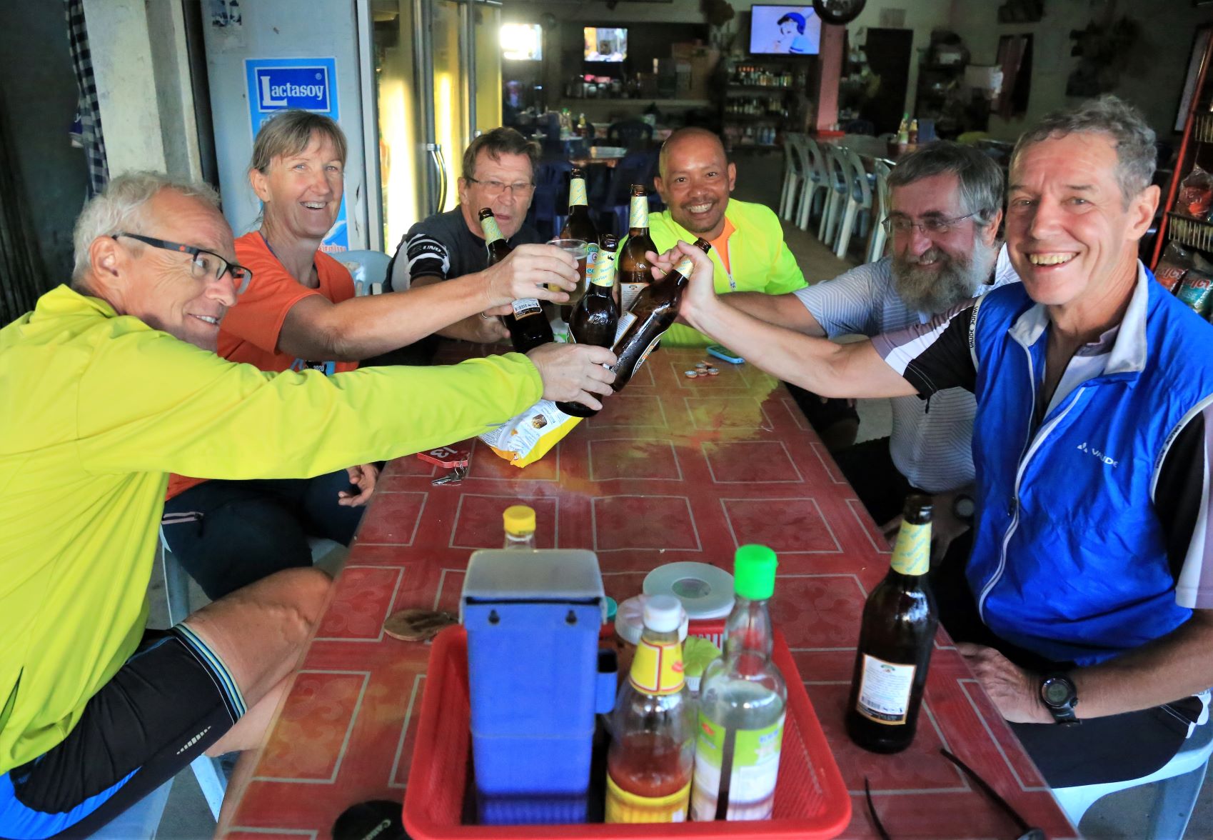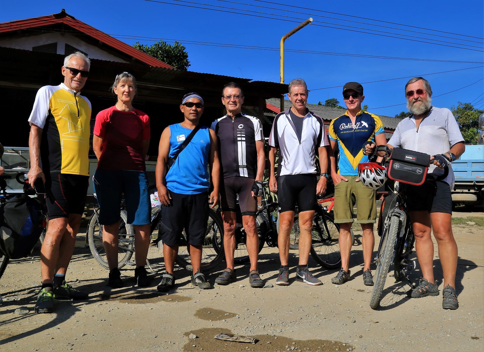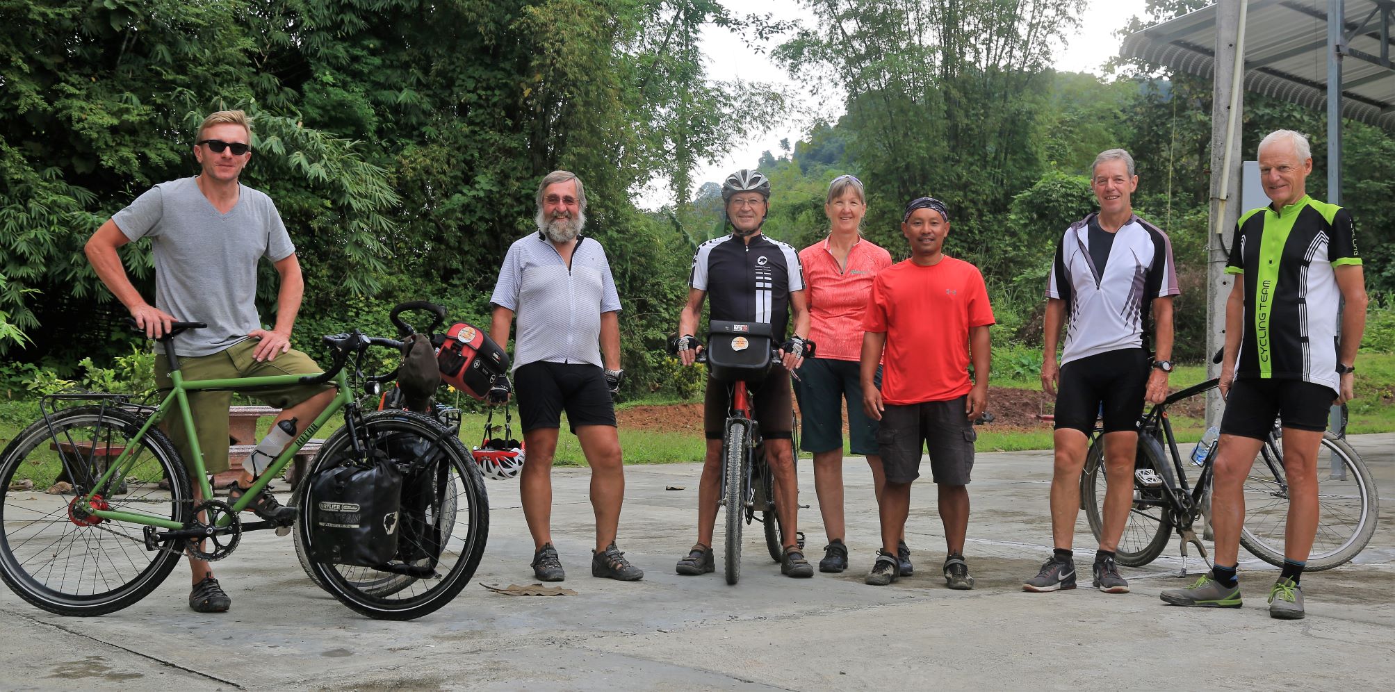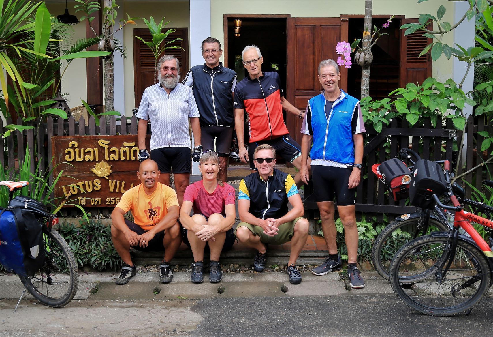 In Laos sind wir nun als kleine Gruppe unterwegs, 1 Radlerin und 4 Radler sowie 2 Reiseleiter. Ab Vientiante kommen dann weitere Teilnehmer dazu. Es gibt keine Diskussion mehr, wer mit wem am Tisch sitzt. Die Stimmung ist gut.