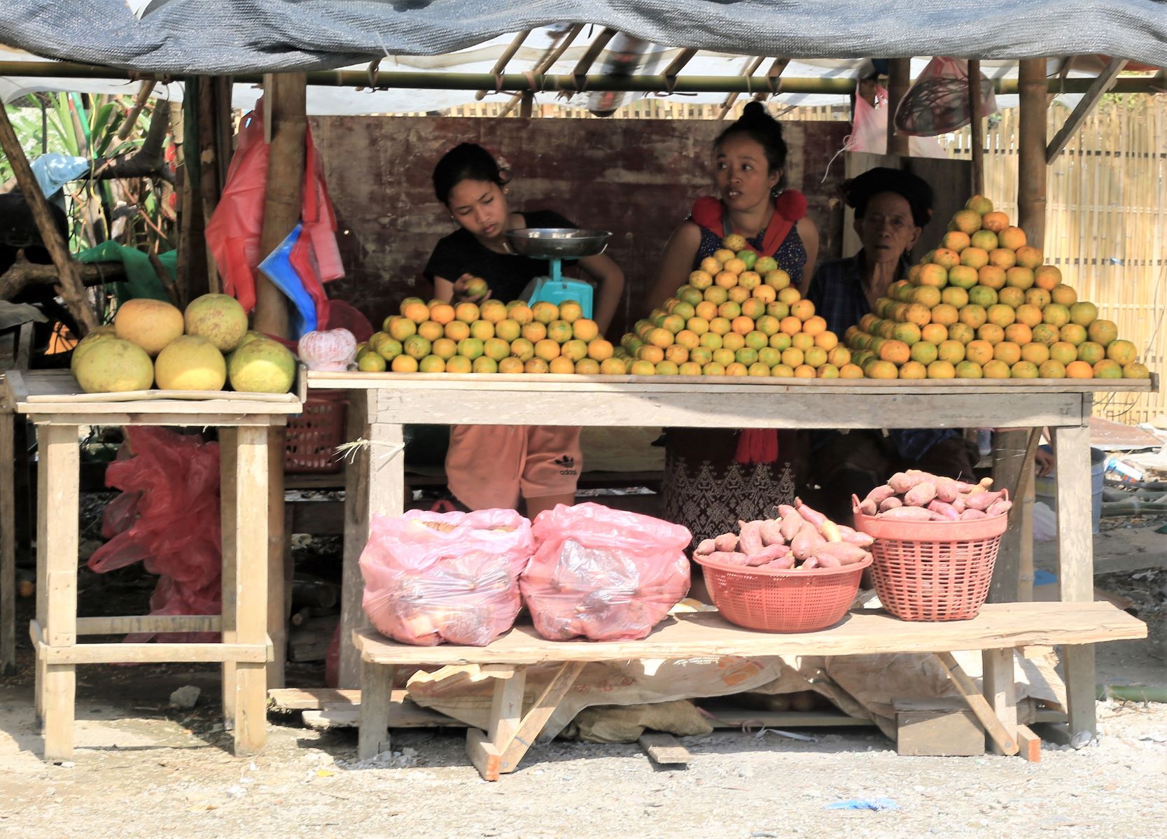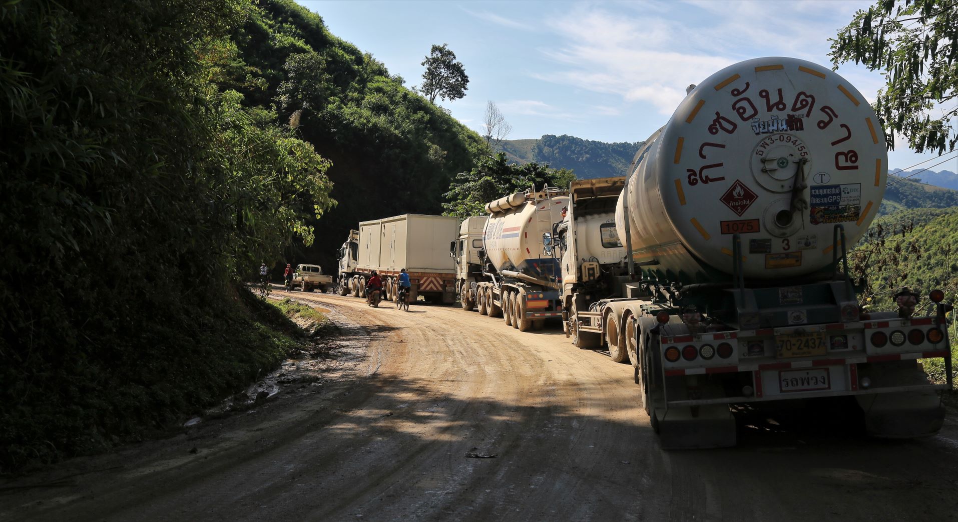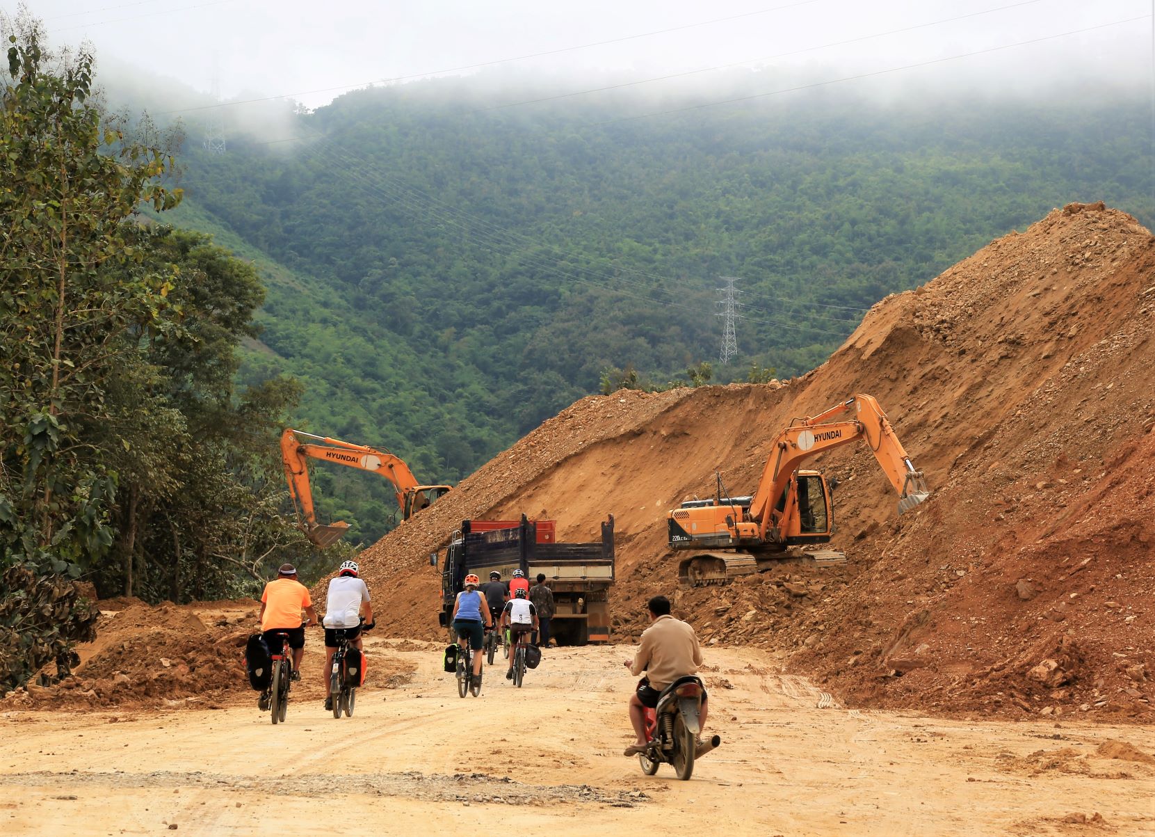 Etwas Wehmut schwingt mit als wir Luang Prabang und das nebelverhangene Mekongtal verlassen.  Der erste Pass ist zum Aufwärmen, im wahrsten Sinne des Wortes, denn der Morgendunst ist längst verzogen und die Sonne heizt uns ordentlich ein. Danach kurze Abfahrten, gefolgt von welligen Abschnitten entlang des Nam Kham Flusses, holprige Passagen durch diverse Baustellen und schon sind wir mitten im Aufstieg zu Pass Nummer Zwei. Jeder radelt, gedankenversunken, seinen eigenen Rhythmus, dennoch treffen wir uns gelegentlich am Fahrzeug von Mr. Kham, der sich als hervorragender Begleiter herausstellt. Frische Mango und Ananas sind vorbereitet und lassen uns die Strapazen schnell vergessen.