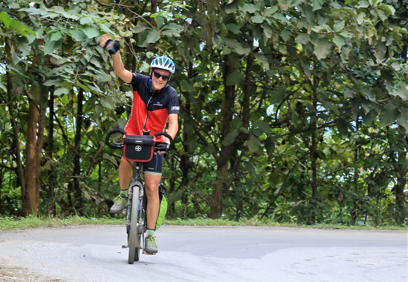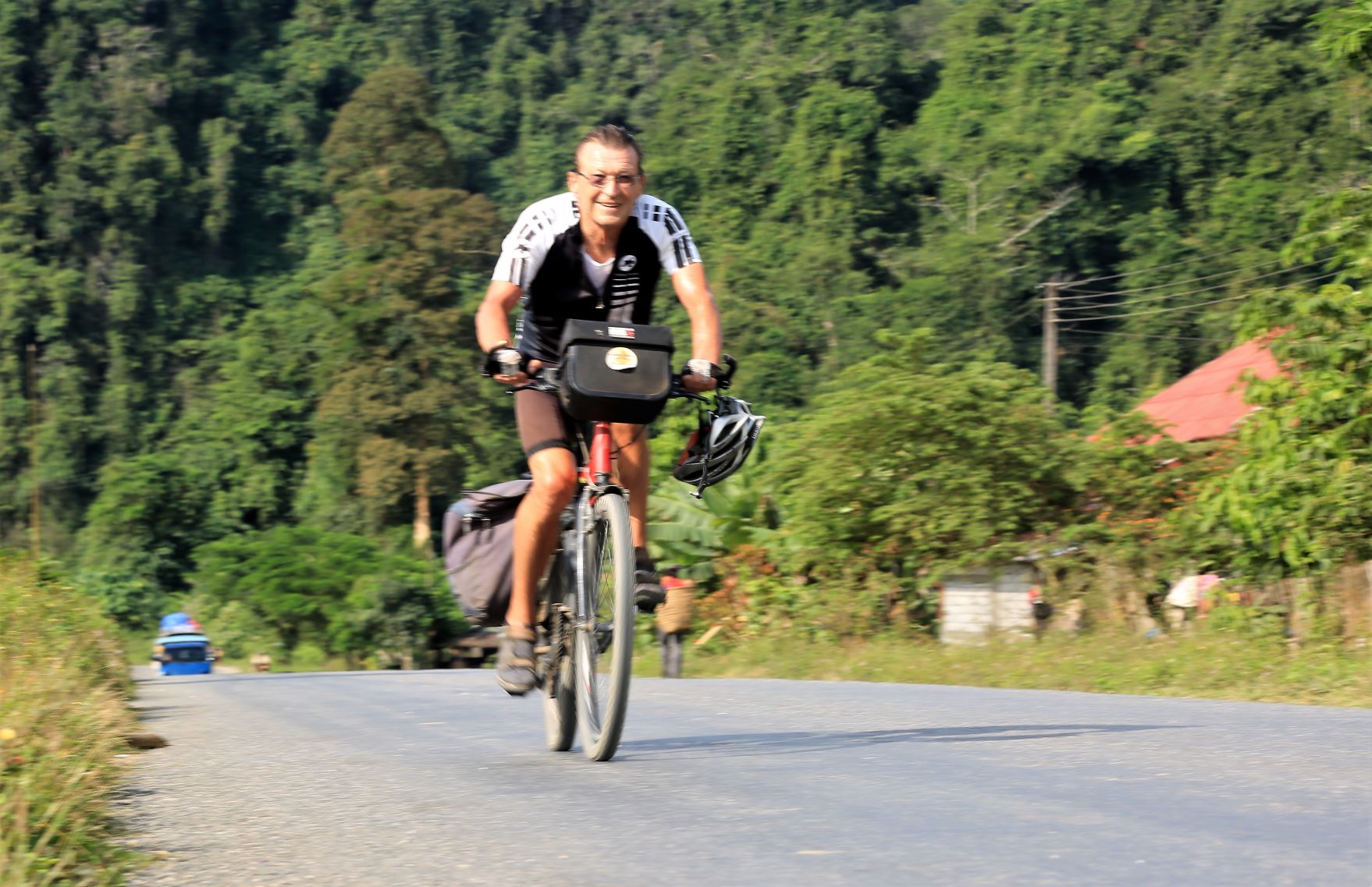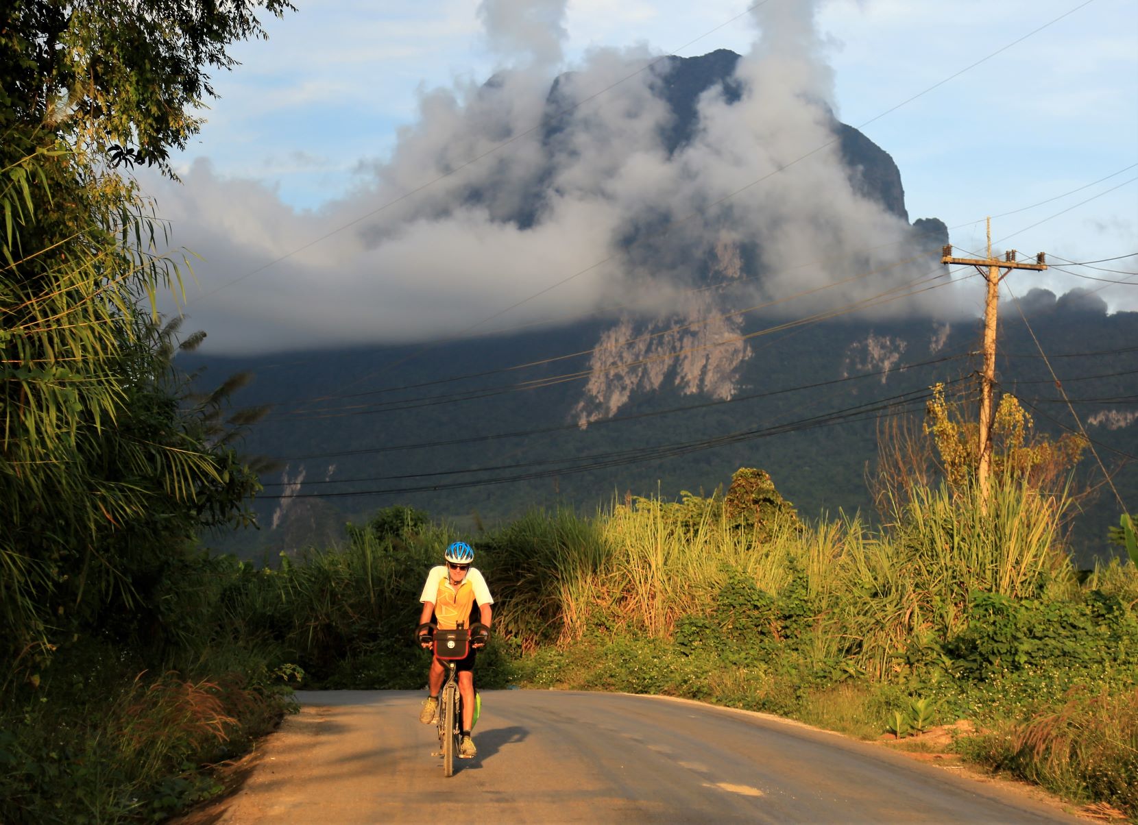 Vom Fahrrad aus betrachtet ist die Grafik längst vergessen und jeder widmet sich ausgiebig seiner persönlichen Herz- und Trittfrequenz. Welch grandiose Landschaft zieht heute an uns vorbei … bizarr verwitterte Karstformationen, dichte, tropische Wälder aber auch an Hänge geklebte Dörfer bewohnt von freundlichen Kindern, die uns schon von weitem ein schallendes ‚Sabaidee‘ entgegenschmettern und ihre kleinen Hände weit auf die Straße strecken, damit der Radfahrer sie im Vorbeifahren abklatsche.