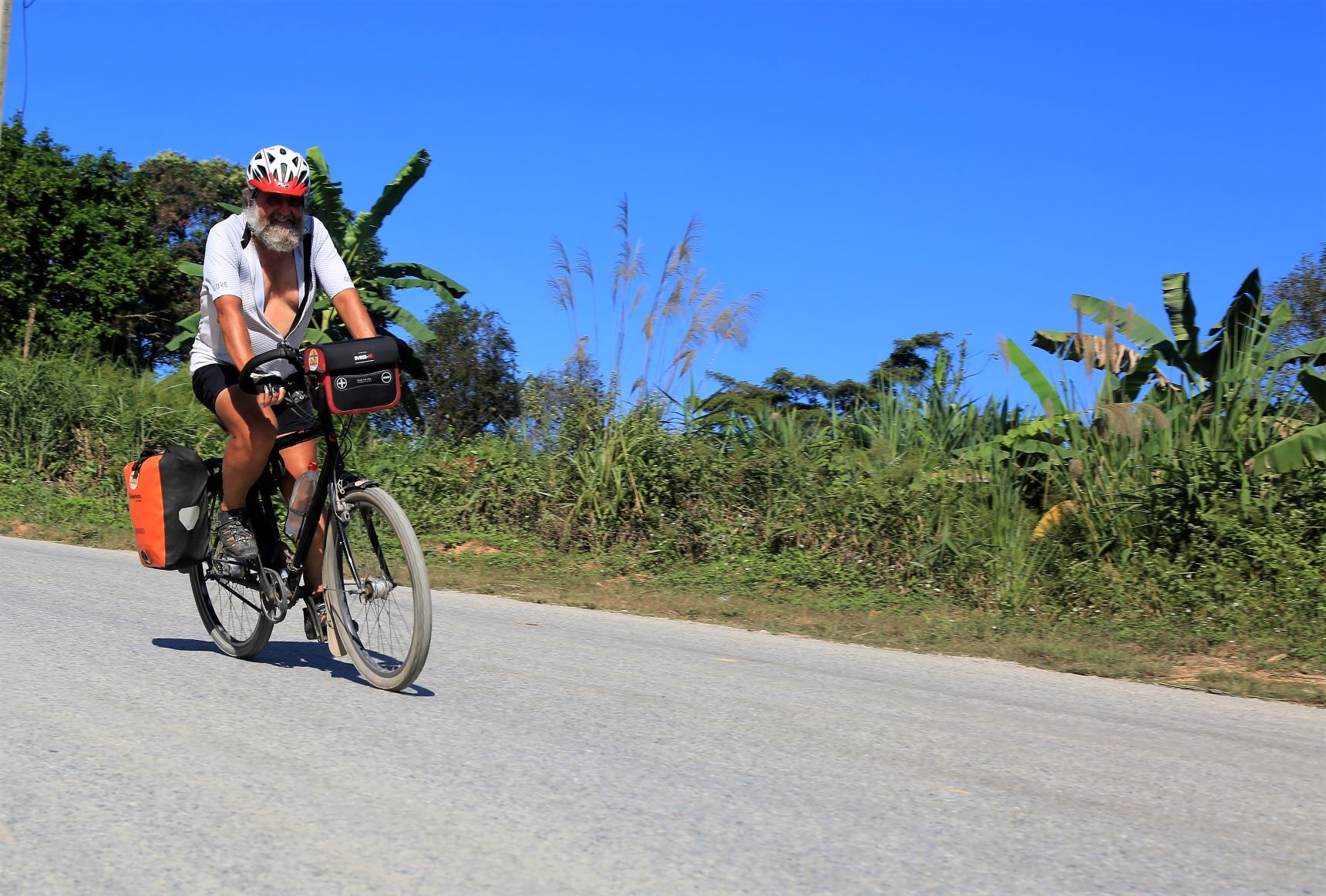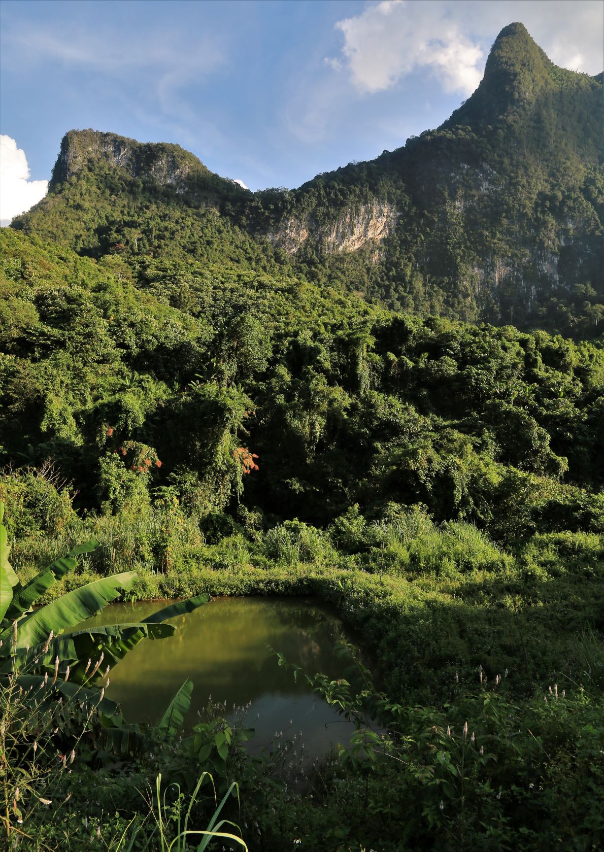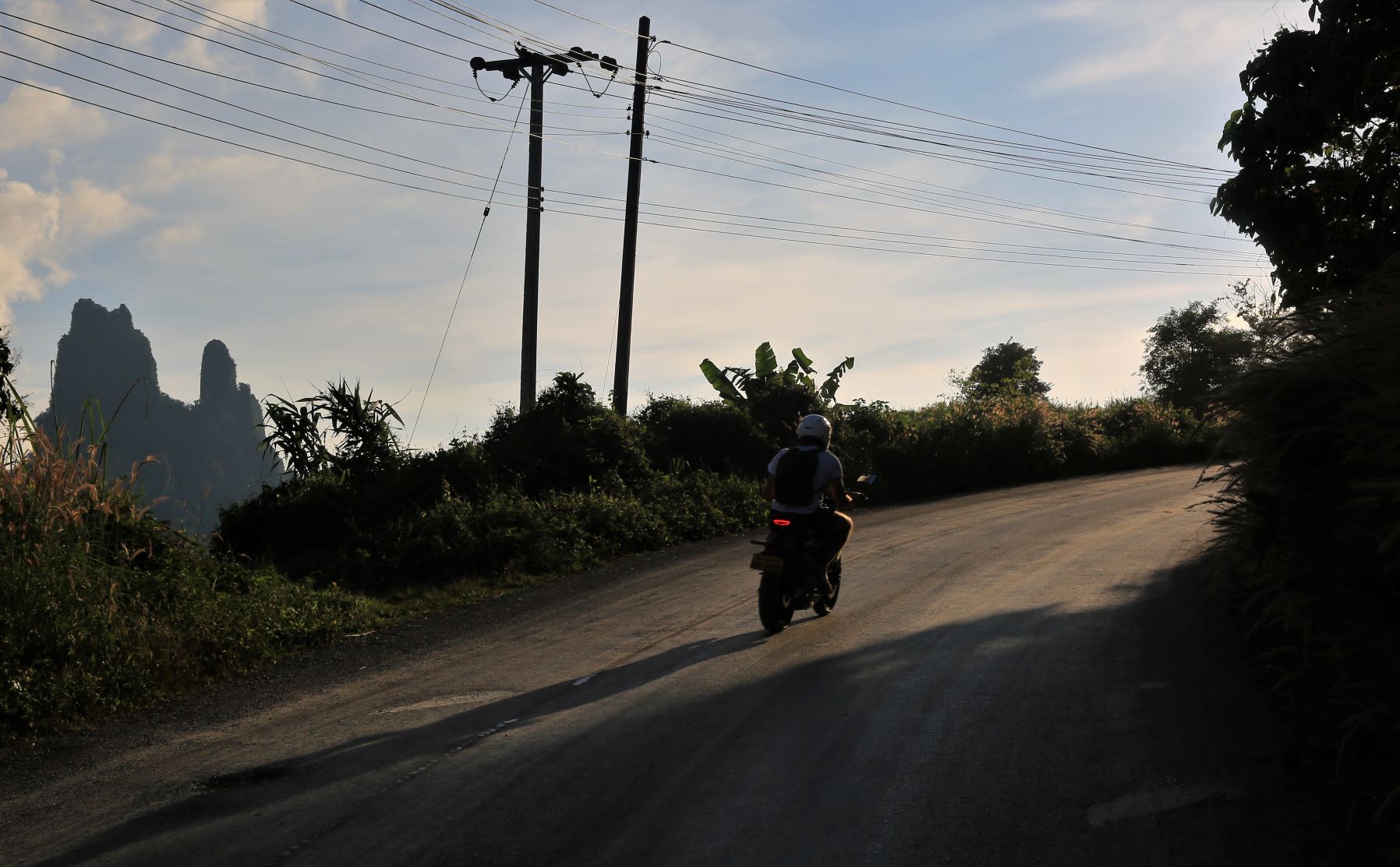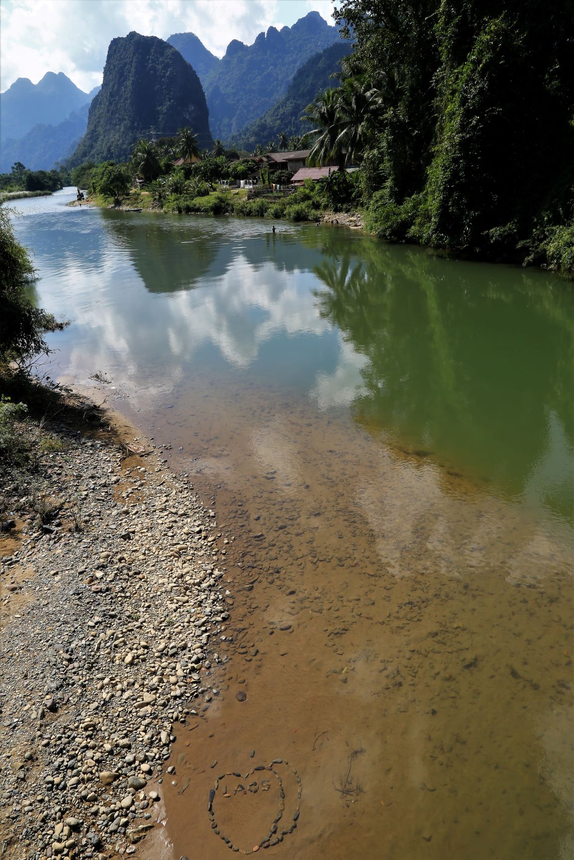 Vom Fahrrad aus betrachtet ist die Grafik längst vergessen und jeder widmet sich ausgiebig seiner persönlichen Herz- und Trittfrequenz. Welch grandiose Landschaft zieht heute an uns vorbei … bizarr verwitterte Karstformationen, dichte, tropische Wälder aber auch an Hänge geklebte Dörfer bewohnt von freundlichen Kindern, die uns schon von weitem ein schallendes ‚Sabaidee‘ entgegenschmettern und ihre kleinen Hände weit auf die Straße strecken, damit der Radfahrer sie im Vorbeifahren abklatsche.