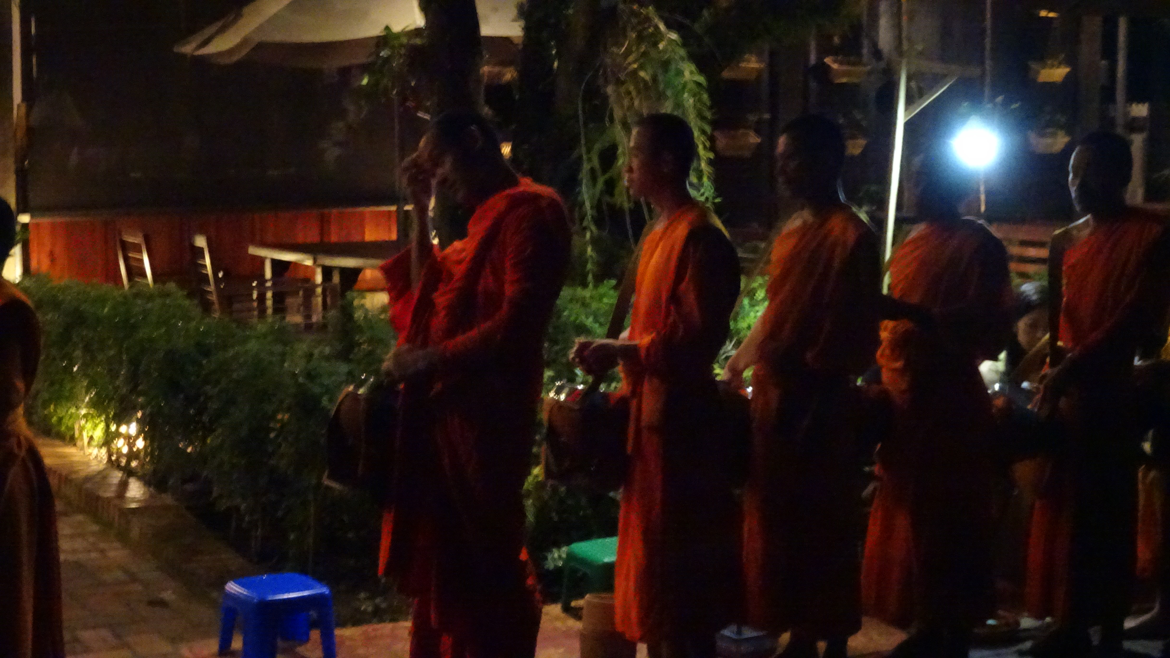 Die Mönche, die jeden Morgen ihre Runde durch Luang Prabang drehen und sich ihre Almosenschalen von den Buddhisten füllen lassen, haben keine andere Essensquelle als dieses Ritual, welches in Laos als „Tak Bat“ bekannt ist. Sie sind darauf angewiesen, dass sie ihre Schalen mit genügend Essen für den Tag gefüllt bekommen. Sobald sie ihre tägliche Route gelaufen sind und ihre Almosen entgegengenommen haben, kehren sie in ihre Tempel zurück und frühstücken. Die letzte Mahlzeit, die ihnen erlaubt ist, muss vor zwölf Uhr mittags eingenommen werden, den Rest des Tages wird gefastet.“