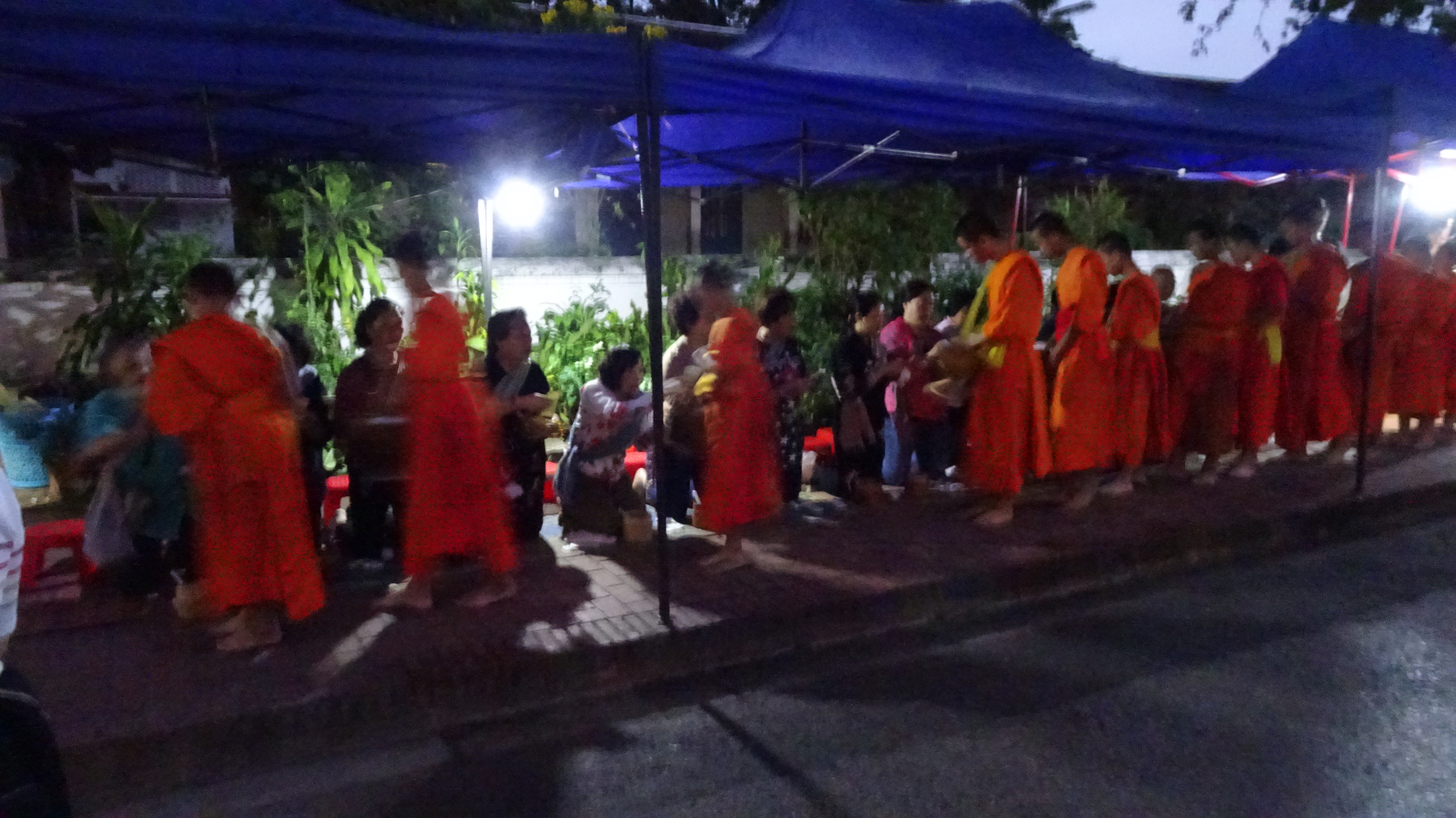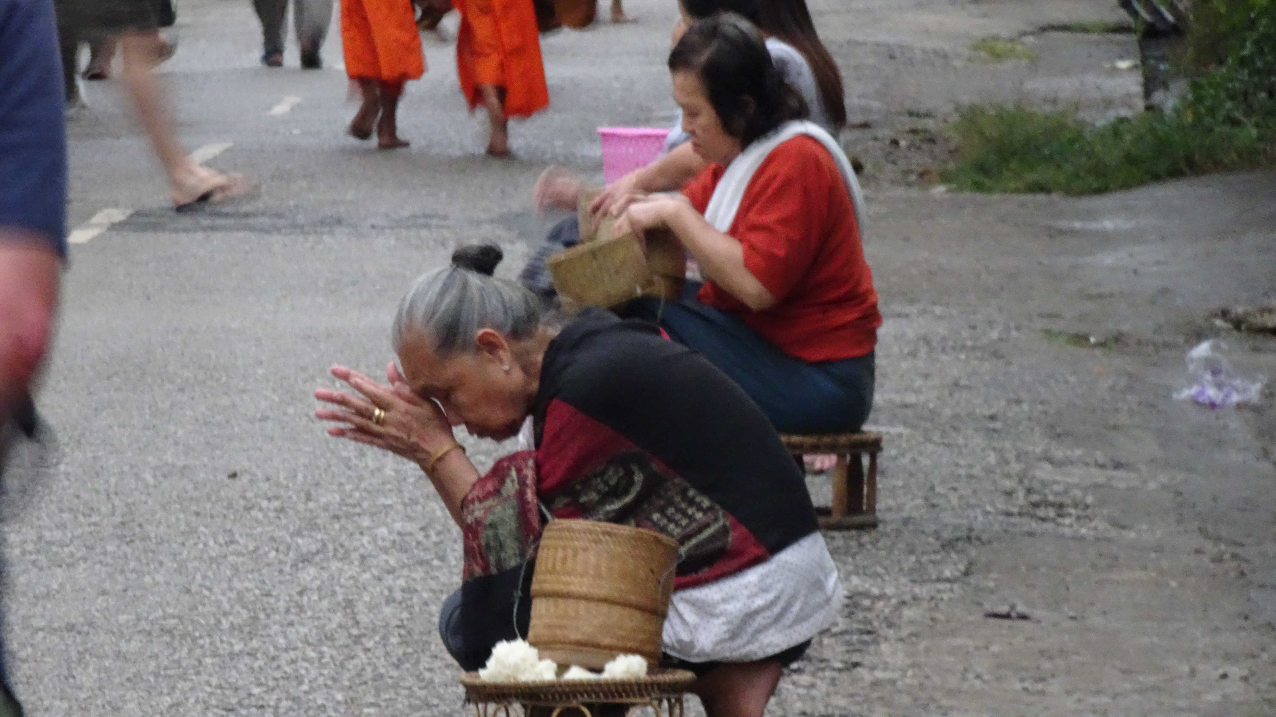 Die wartenden Buddhisten, die auf ihren Knien auf dem Fußweg sitzen, haben ihre Almosen vor sich ausgebreitet. Sobald sich die Mönche nähern, begrüßen die Betenden sie mit über der Brust zusammengefalteten Händen, um dann ihre Almosen zu überreichen. Die meisten Einheimischen geben ihnen eine große Kelle gekochten Reis in ihre Schale, während die angereisten Buddhisten hauptsächlich Obst überreichen.