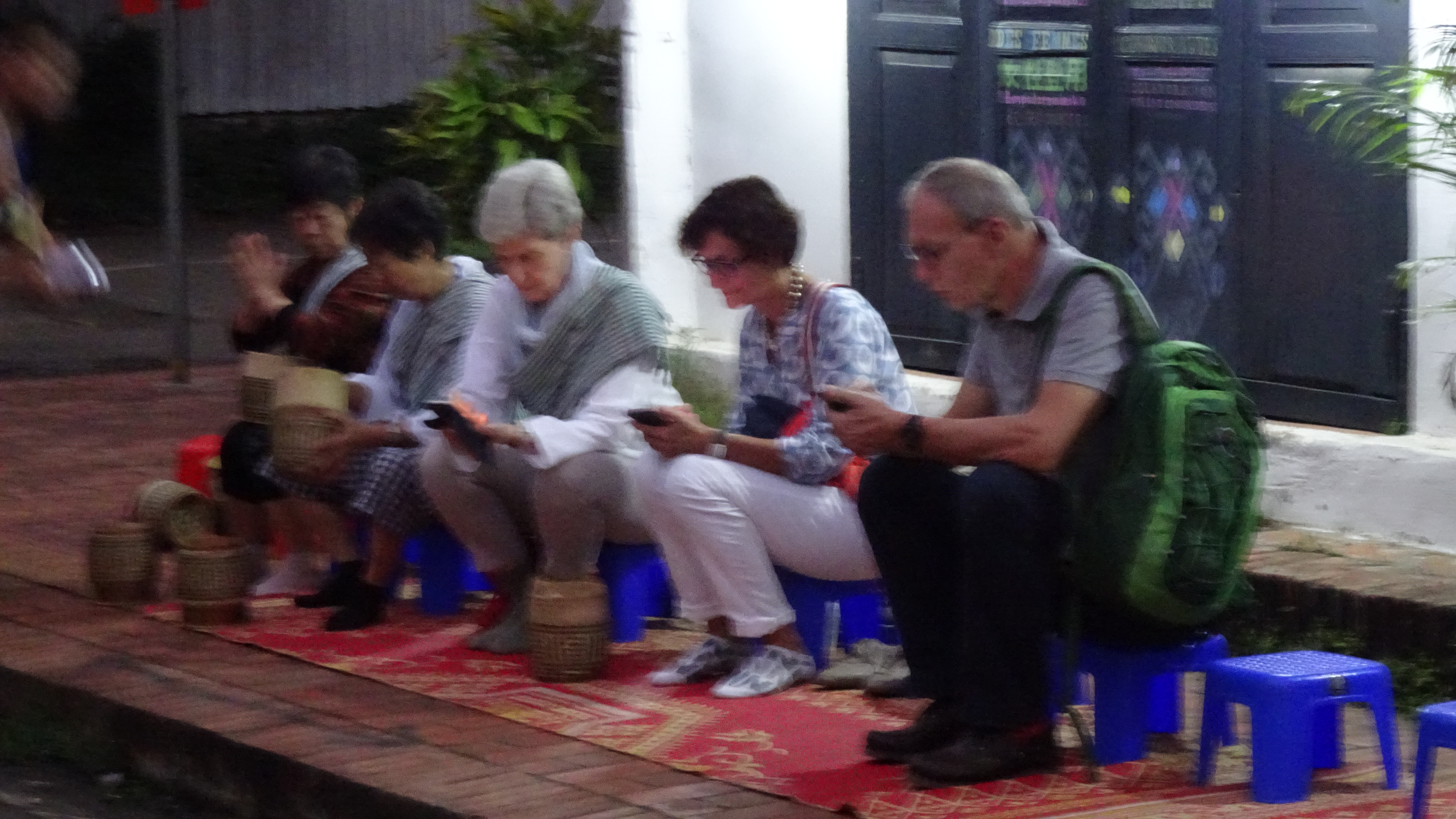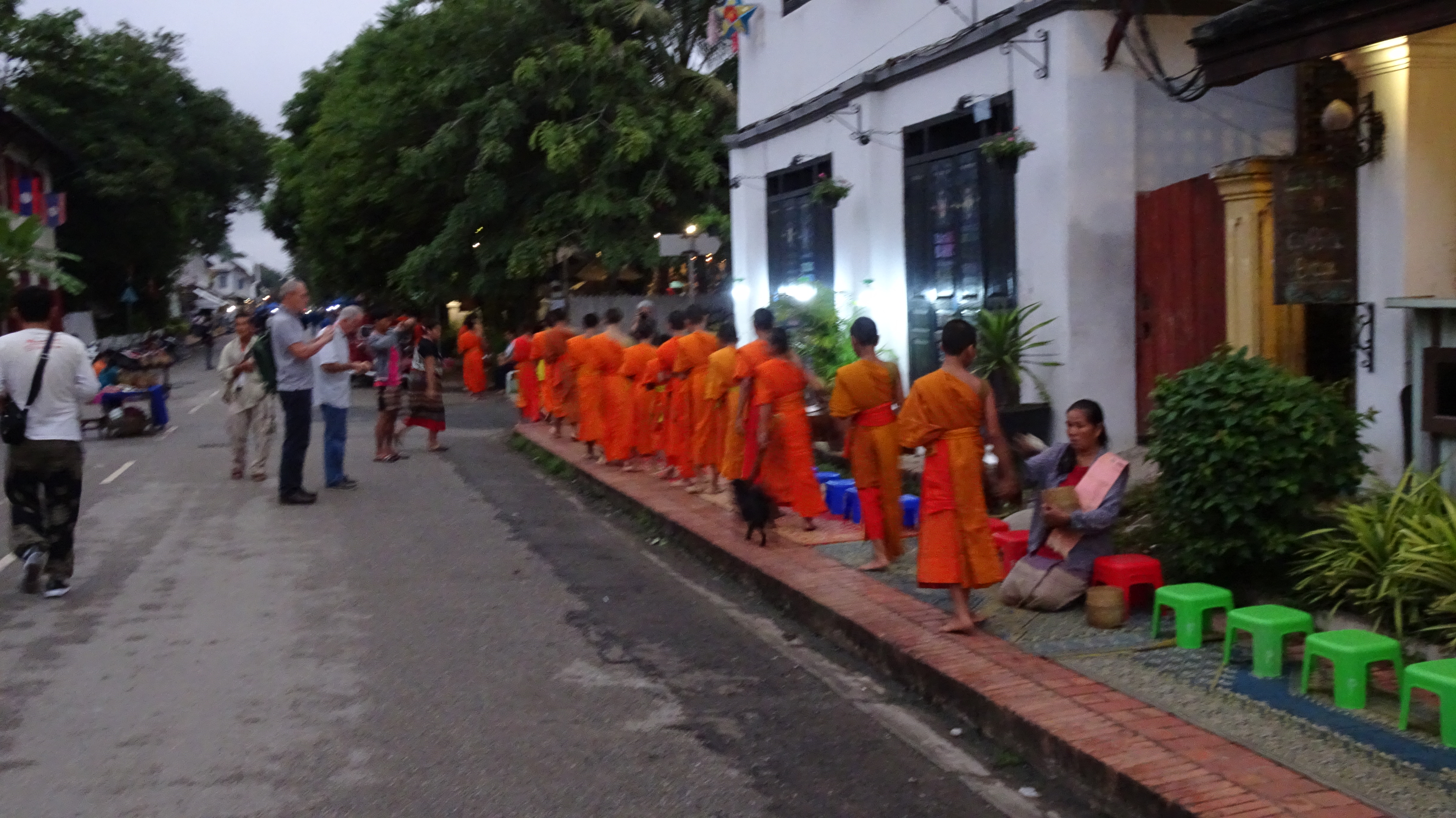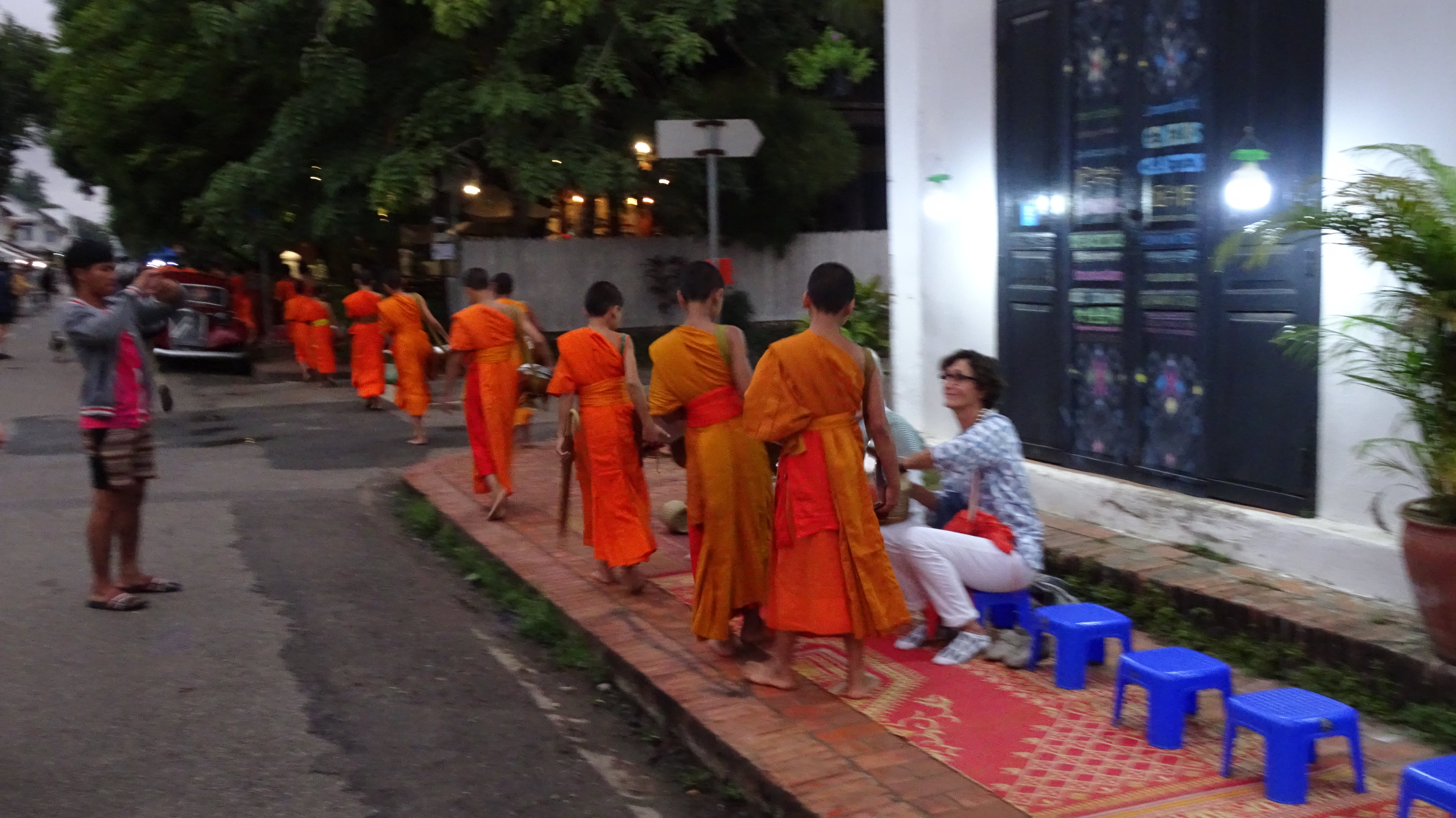 Während wir nur Beistehende sind, sind Dutzende Touristen mit uns gekommen, die nicht nur zusehen, sondern an diesem besonderen Brauch teilnehmen. Buddhisten aus aller Welt kommen tagtäglich nach Luang Prabang, um sich im Gegenzug für Almosen den speziellen Dank Buddhas zu verdienen. Es heißt, dass die Buddhisten, die Almosen überreichen, mit besonderem Glück und gutem Karma belohnt werden.