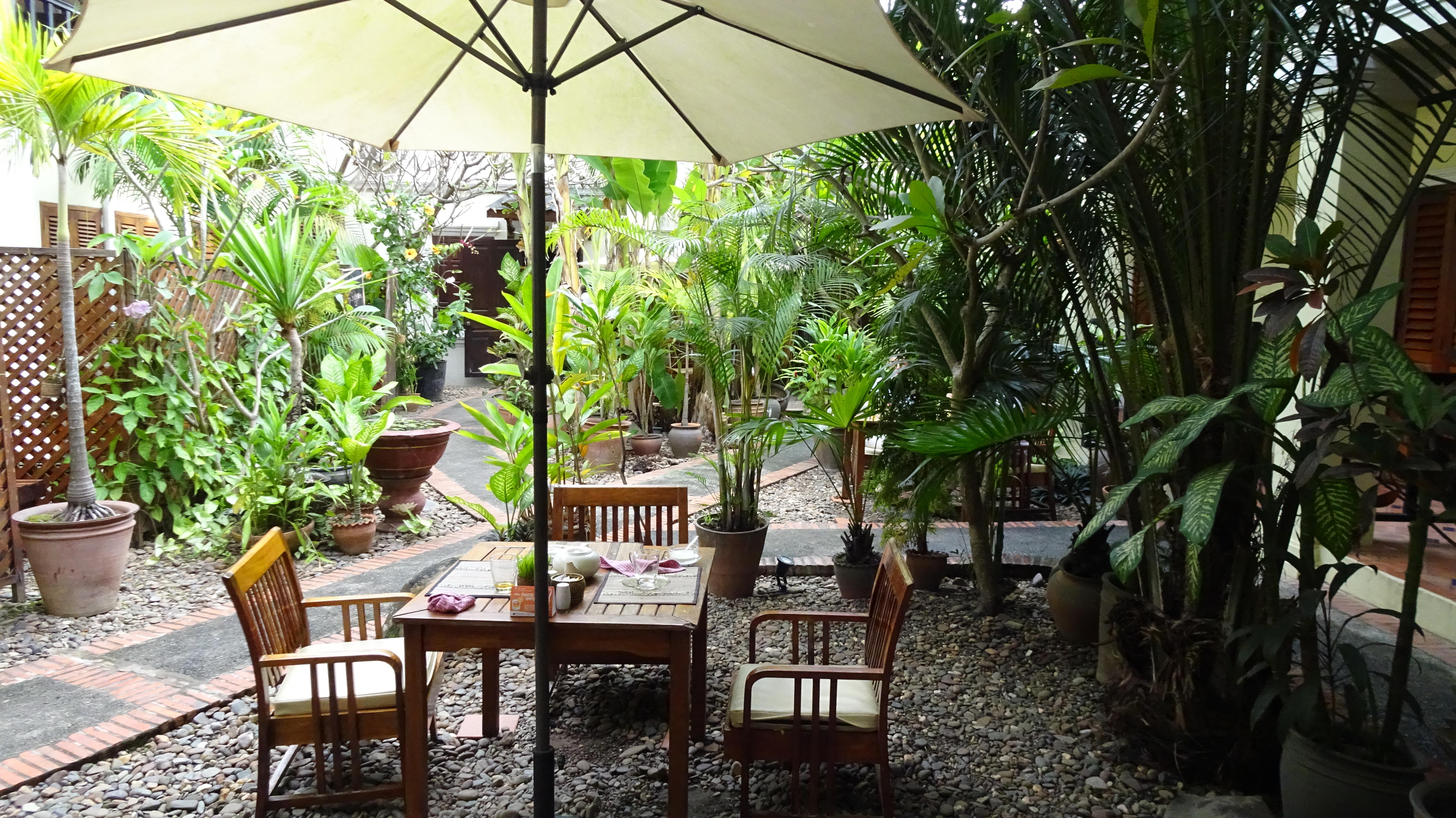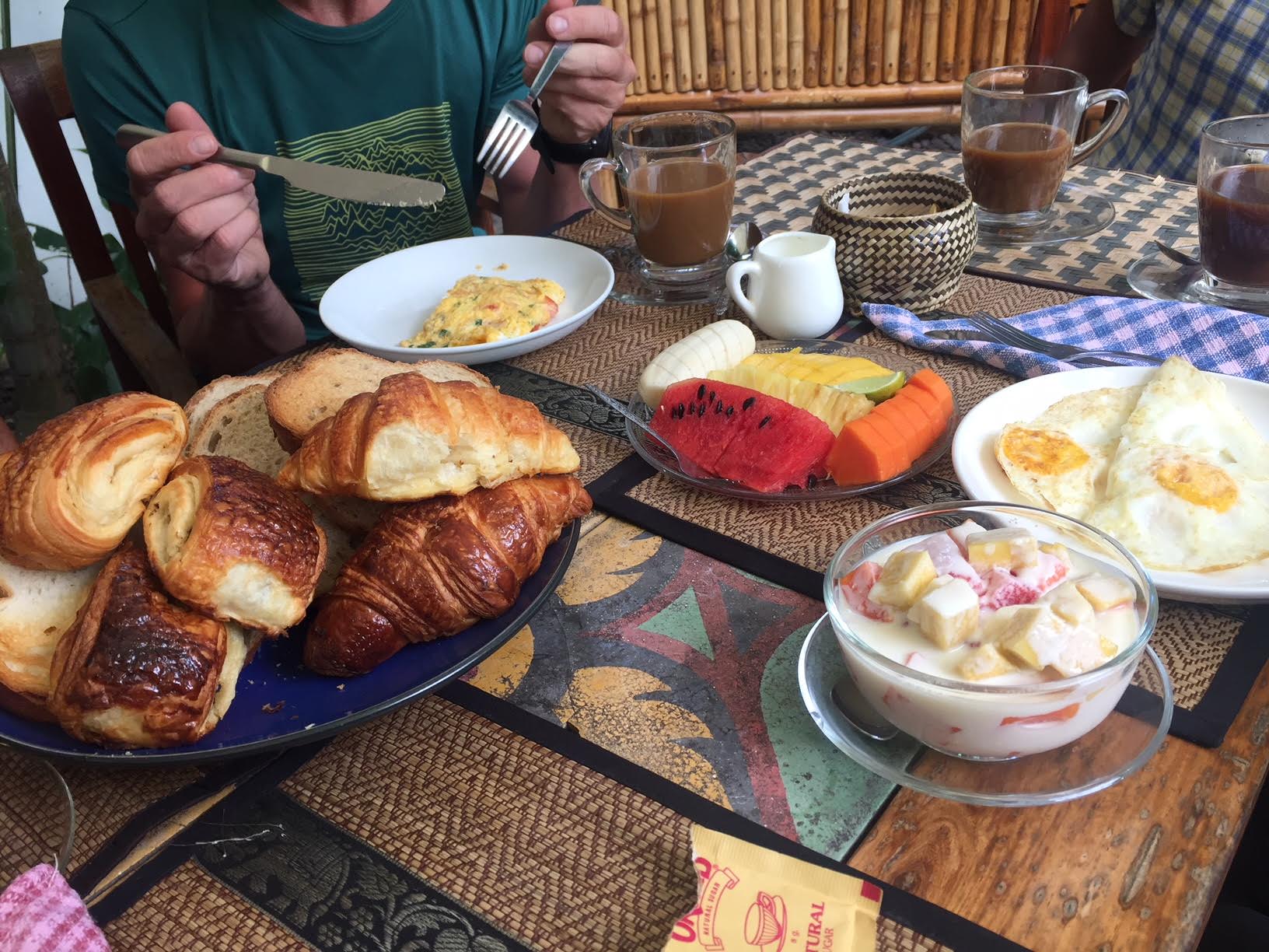 Wir genießen unser Frühstück im grünen Innenhof des Hotels und schlemmen seit langem mal nicht mit Nudelsuppe, sondern mit Spiegeleiern, Croissants, Country Bread, Butter, Marmelade, Kaffee, Tee und frischem Obst (Ananas, Mangos, Papayas), na, wie ihr halt auch zu Hause. Da kommt uns ein wenig die Hinterlassenschaft der früheren Kolonialmacht zu Gute.