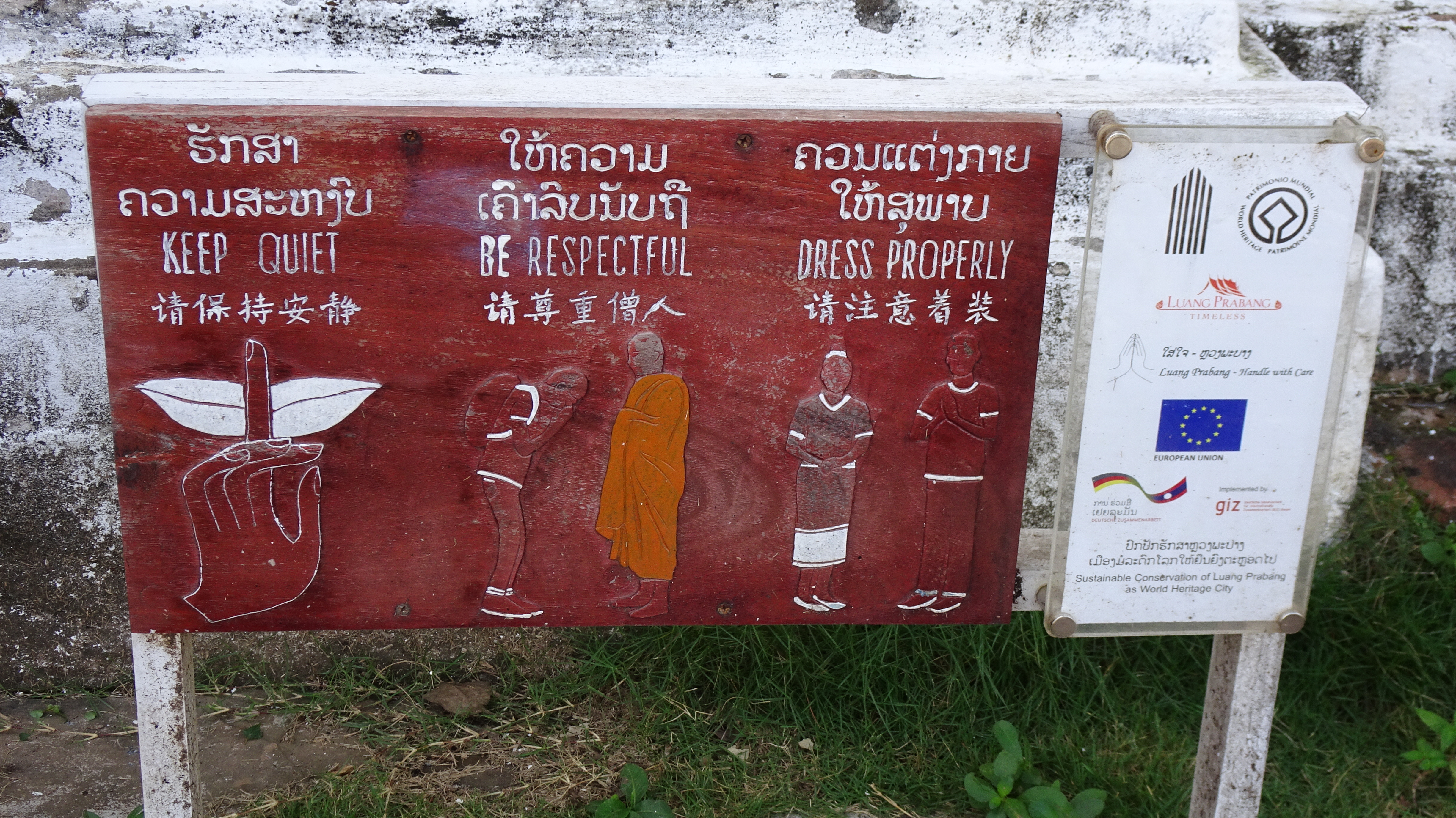 In Luang Prabang haben wir verschiedene Tempelanlagen besucht. Es kommt ein größere Gruppe älterer Touristen und bleibt vor einem Tempel stehen. Der Reiseleiter erklärt spannend die Geschichte, ich lausche interessiert zu. Nun ist genug, er will zum Mittagessen. Da fragt einer: „Können sie noch etwas zum Buddhismus erzählen?“. Wollen die jetzt zum Mittagessen oder wollen Sie noch zwei Stunden hier stehen frage ich mich.