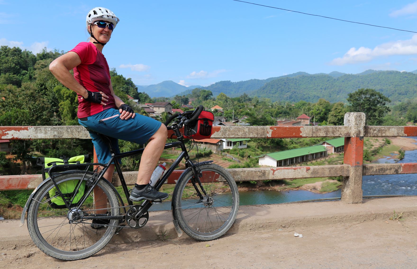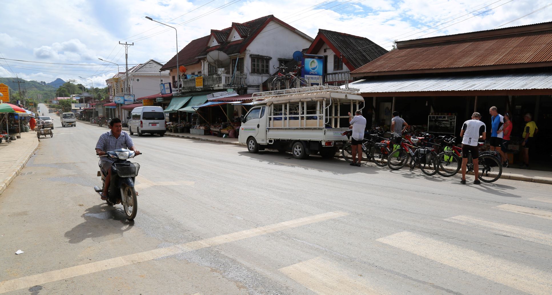 Die Landschaft in Laos ist wunderbar, es lässt sich hier gut radfahren. Ab und zu kommen uns Busse mit Backpackern entgegen. Kunming – Vientiane steht da auf der Frontscheibe geschrieben. Ich bevorzuge lieber das Fahrrad, lasse meine Seele baumeln und träume vor mich hin. Ach du Sch… das Loch in der Straße habe ich voll übersehen. Im letzten Moment konnte ich noch meinen Lenker hoch reißen. Das Vorderrad schafft es unversehrt, das Hinterrad knallt mit voller Wucht ins Loch rein. Glück gehabt, mein Toutterrain hat diesen Fauxpas ohne Schaden überstanden. Es geht weiter, das Hotel ist nur noch wenige Kilometer entfernt. Maria und ich fahren vorne weg, wir drücken mächtig in die Pedale und liefern uns ein Kopf an Kopf Rennen. Peter meint danach sind wir hier an einer Sportveranstaltung? Das abendliche Bier haben wir uns nach dieser herausfordernden Radreise verdient.