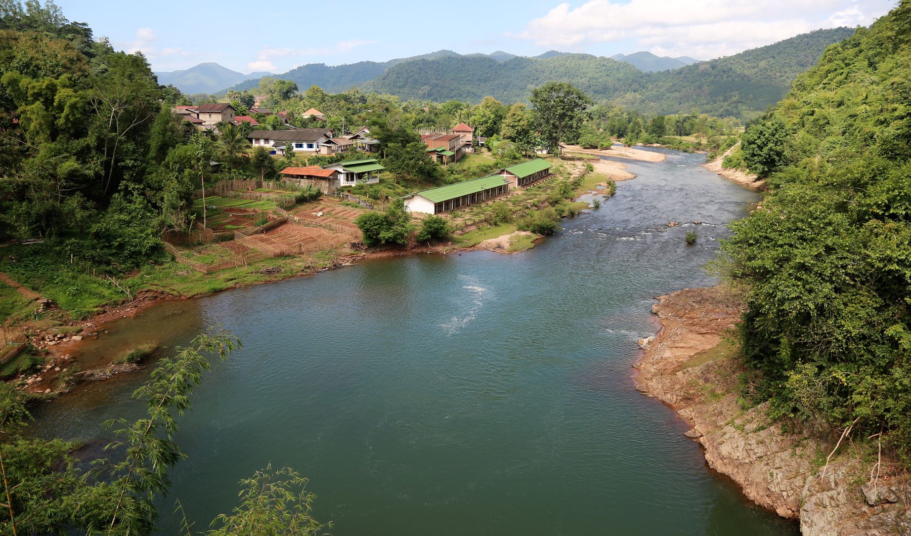 Am Ziel unserer Bootsfahrt gestern von Muang Khua aus tauchten mitten im Grün diese Bucht und darüber das kleine Dorf Muang Ngoy auf.