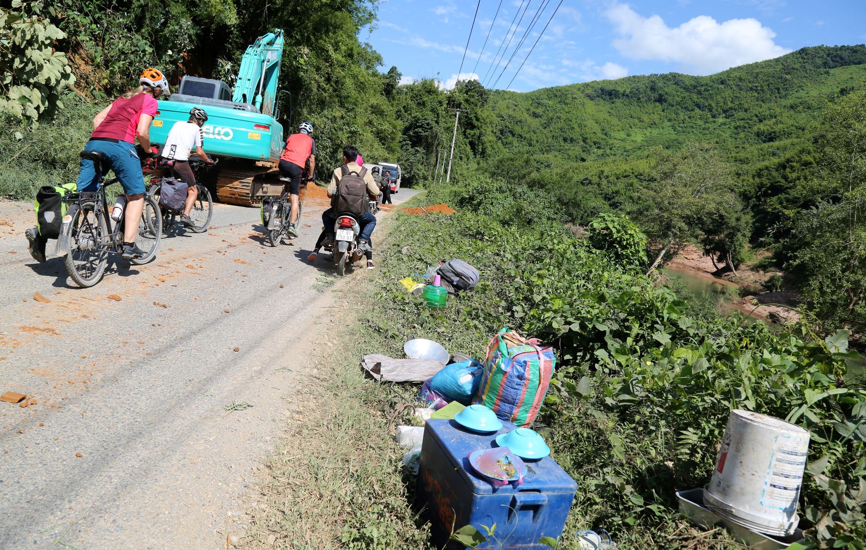 Es bedarf nicht viel zufrieden zu sein … Wohl gestärkt, auf guten tendenziell abfallenden Straßen und durch abwechslungsreiche Landschaften radeln wir mit einem Lächeln im Gesicht einem ersehnten Etappenziel entgegen – die alte Königstadt Luang Prabang. Kleine und große Baustellen (mal wieder ein chinesisches Staudammprojekt) zwingen uns gelegentlich heftig in die Bremsen zu steigen, können allerdings die Stimmung nicht trüben.