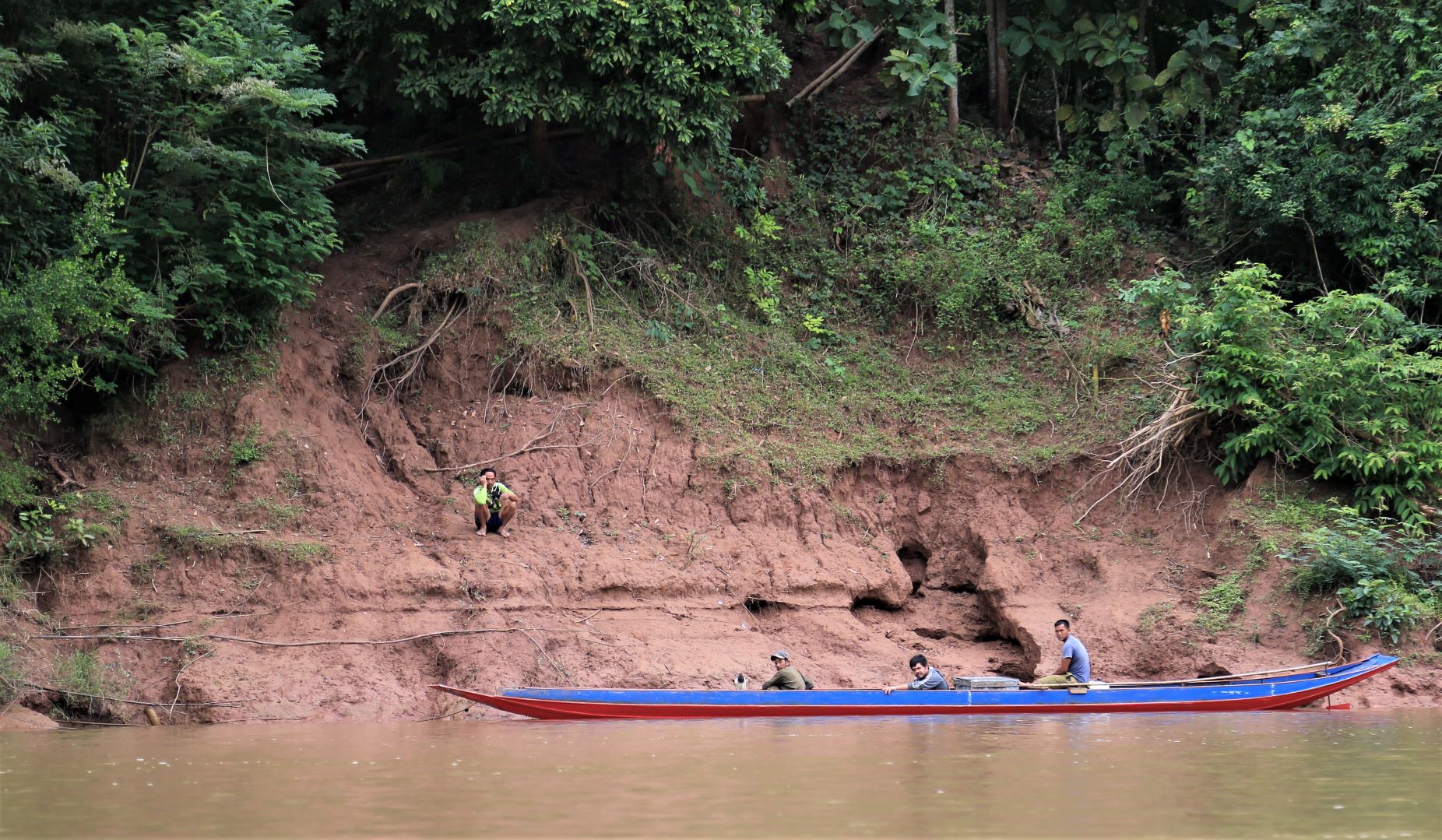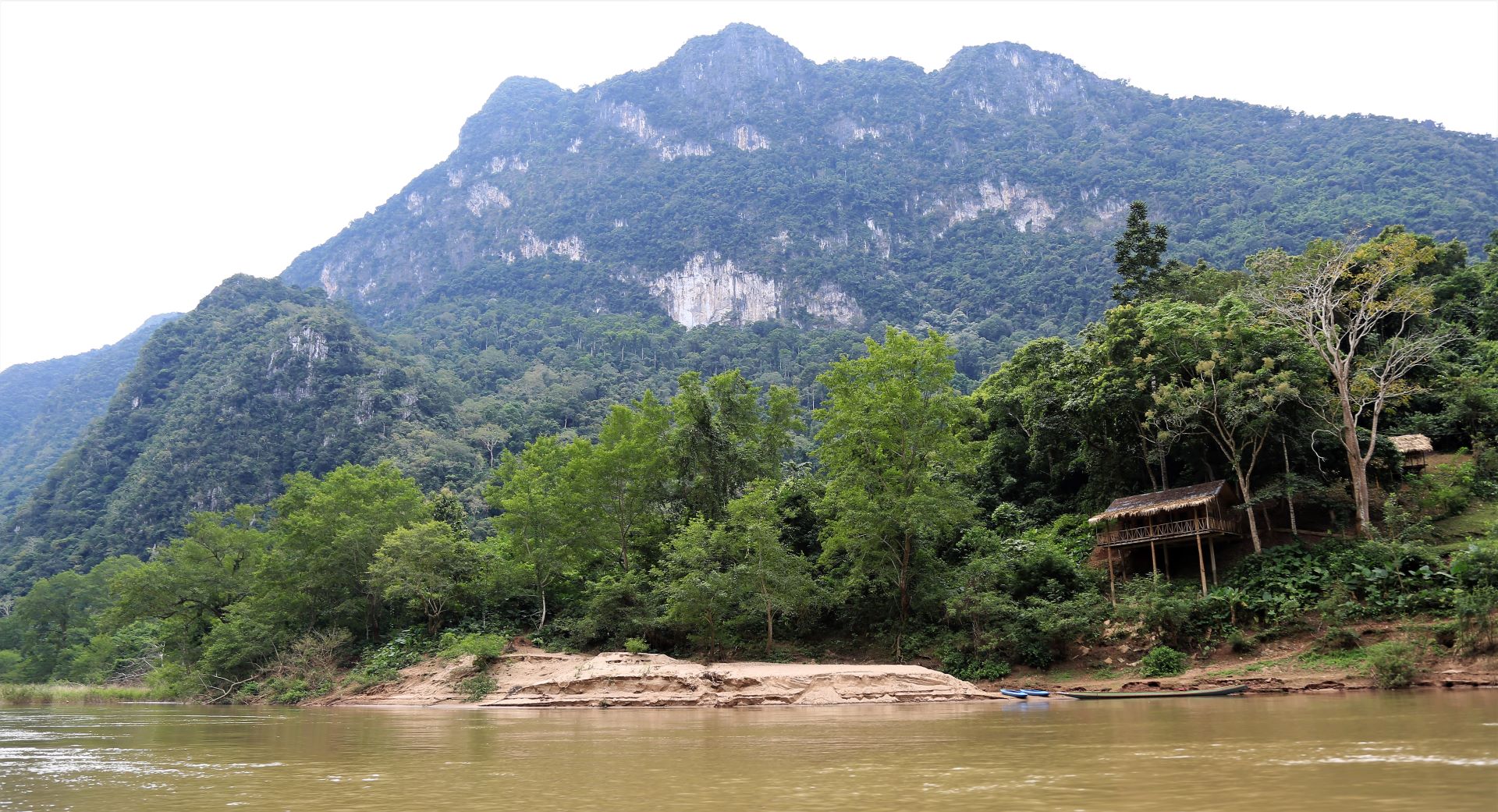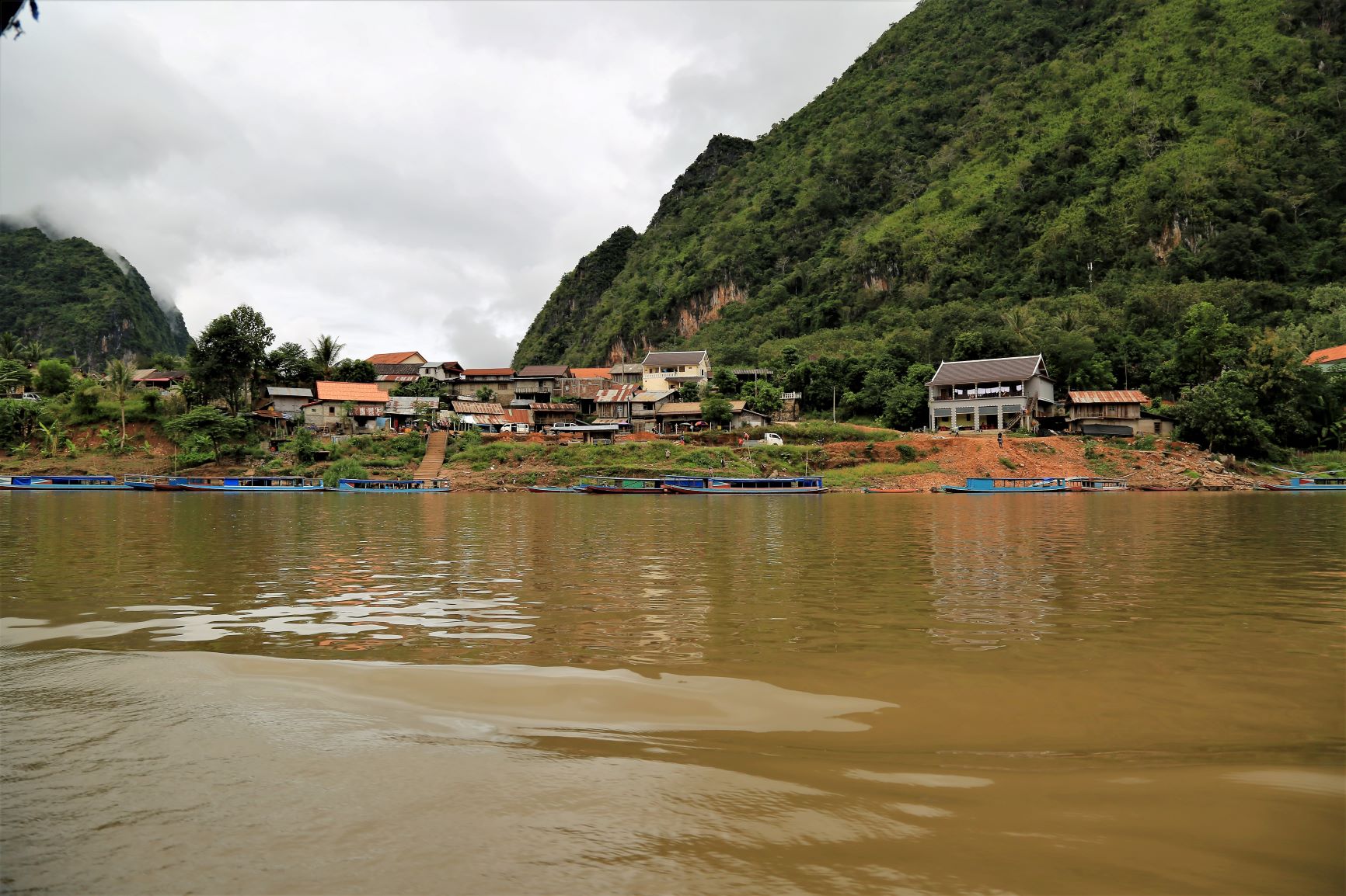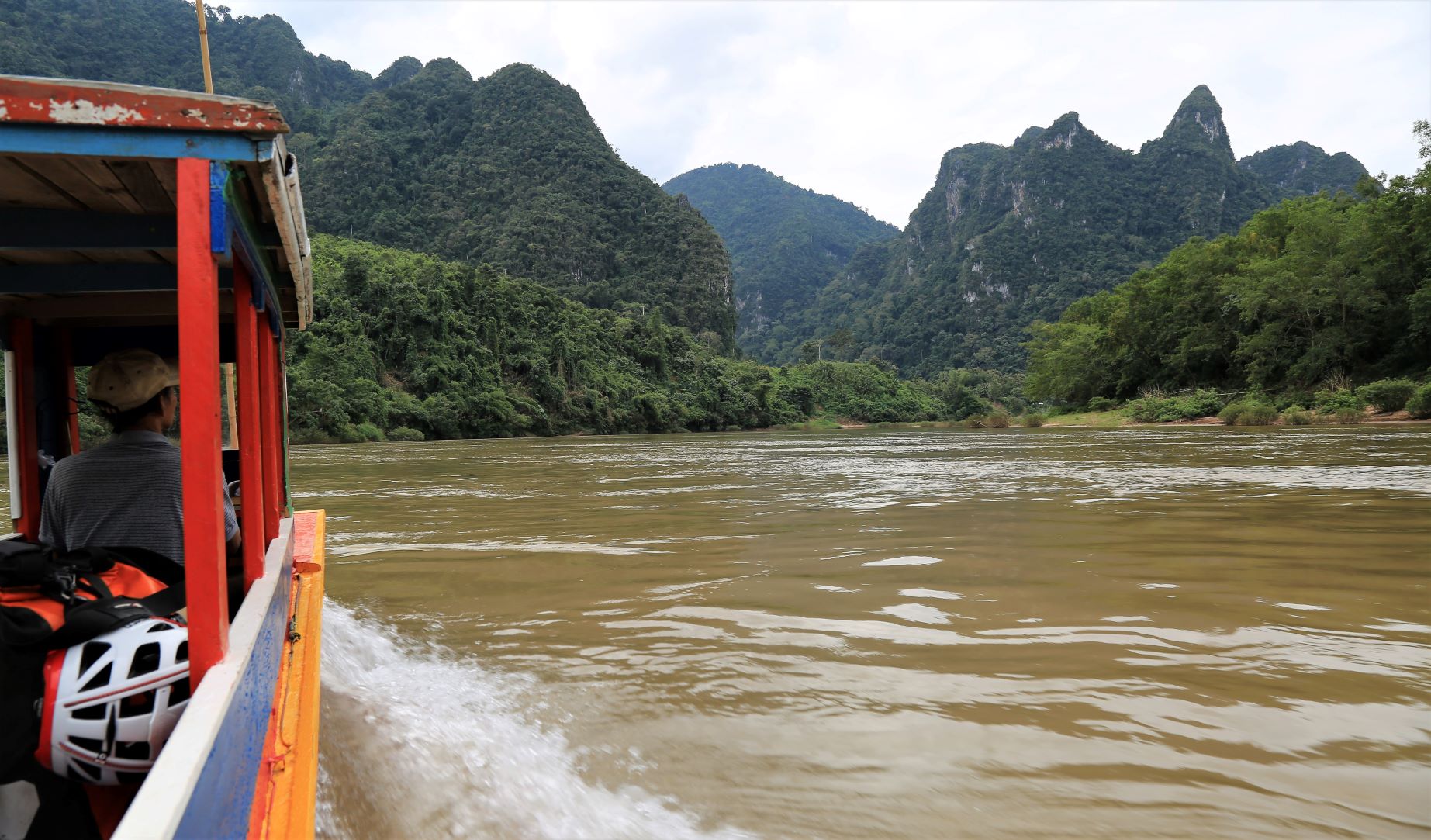 Wir umfahren die quirllige Baustelle mit einem Tuk Tuk und setzen die, nun gemächlichere Fahrt, mit einem anderen Boot nach Muang Ngoy fort. Steile Karstformationen bewaldet bis zum Gipfel bestimmen nun das Landschaftsbild.