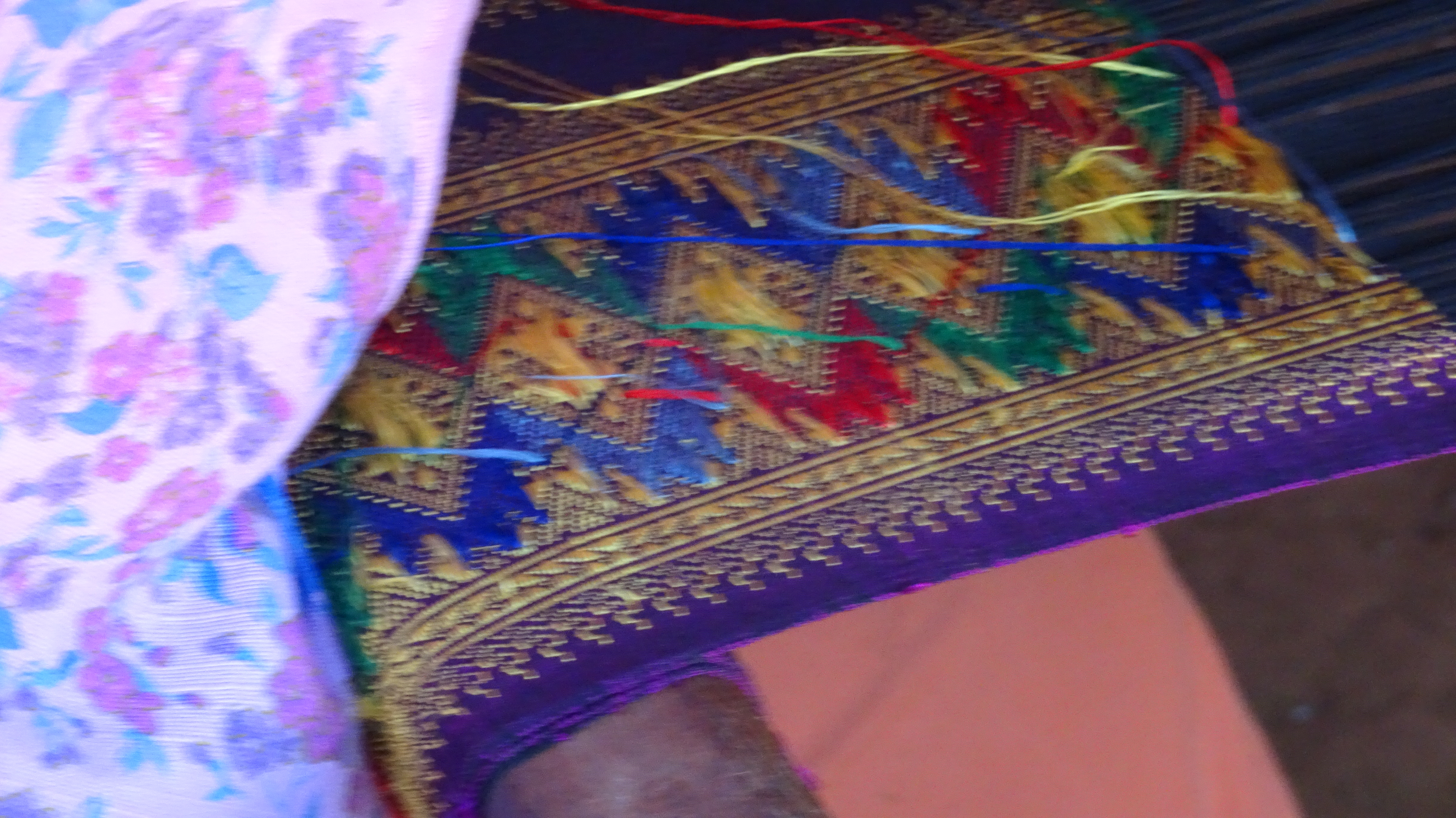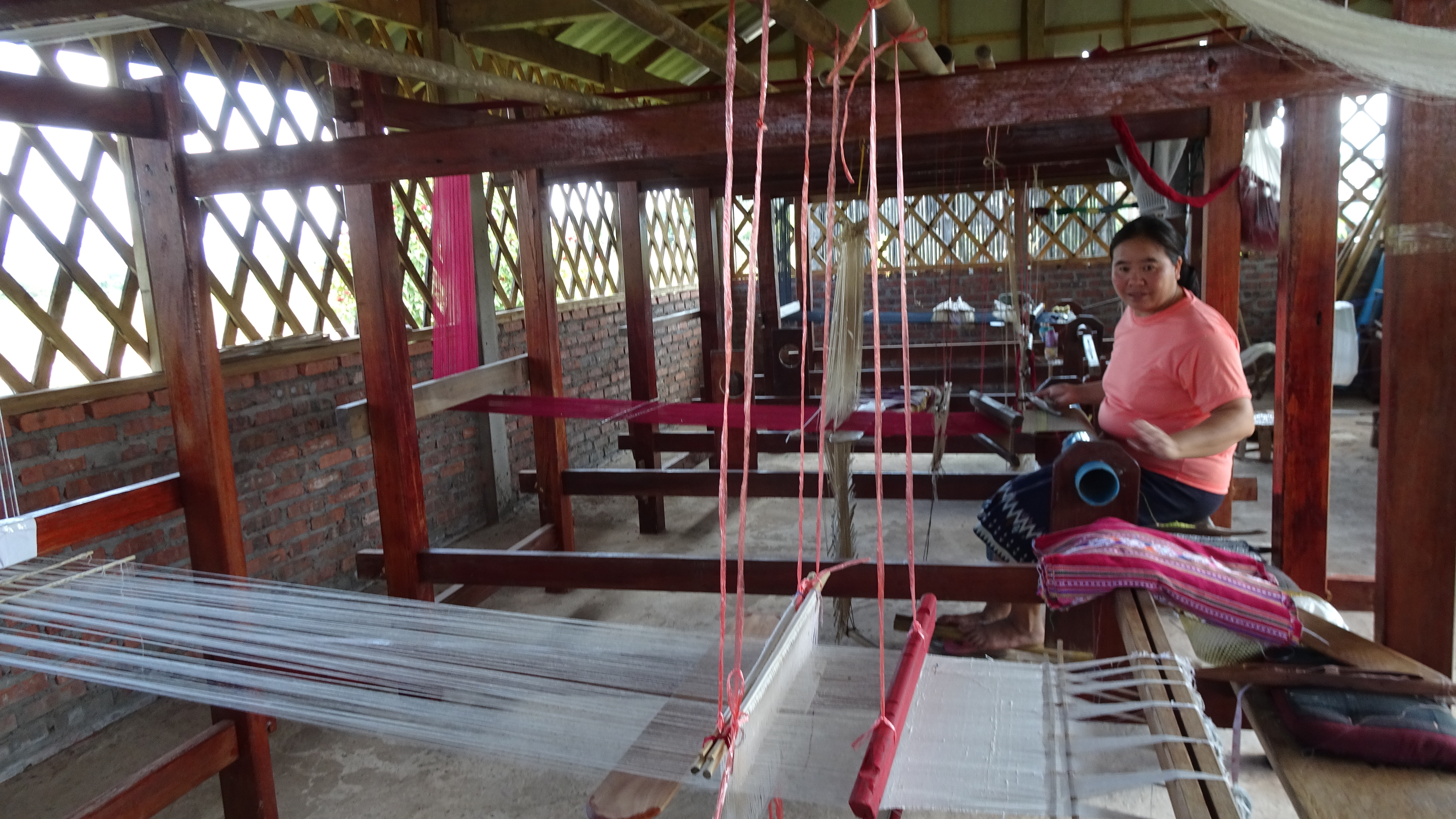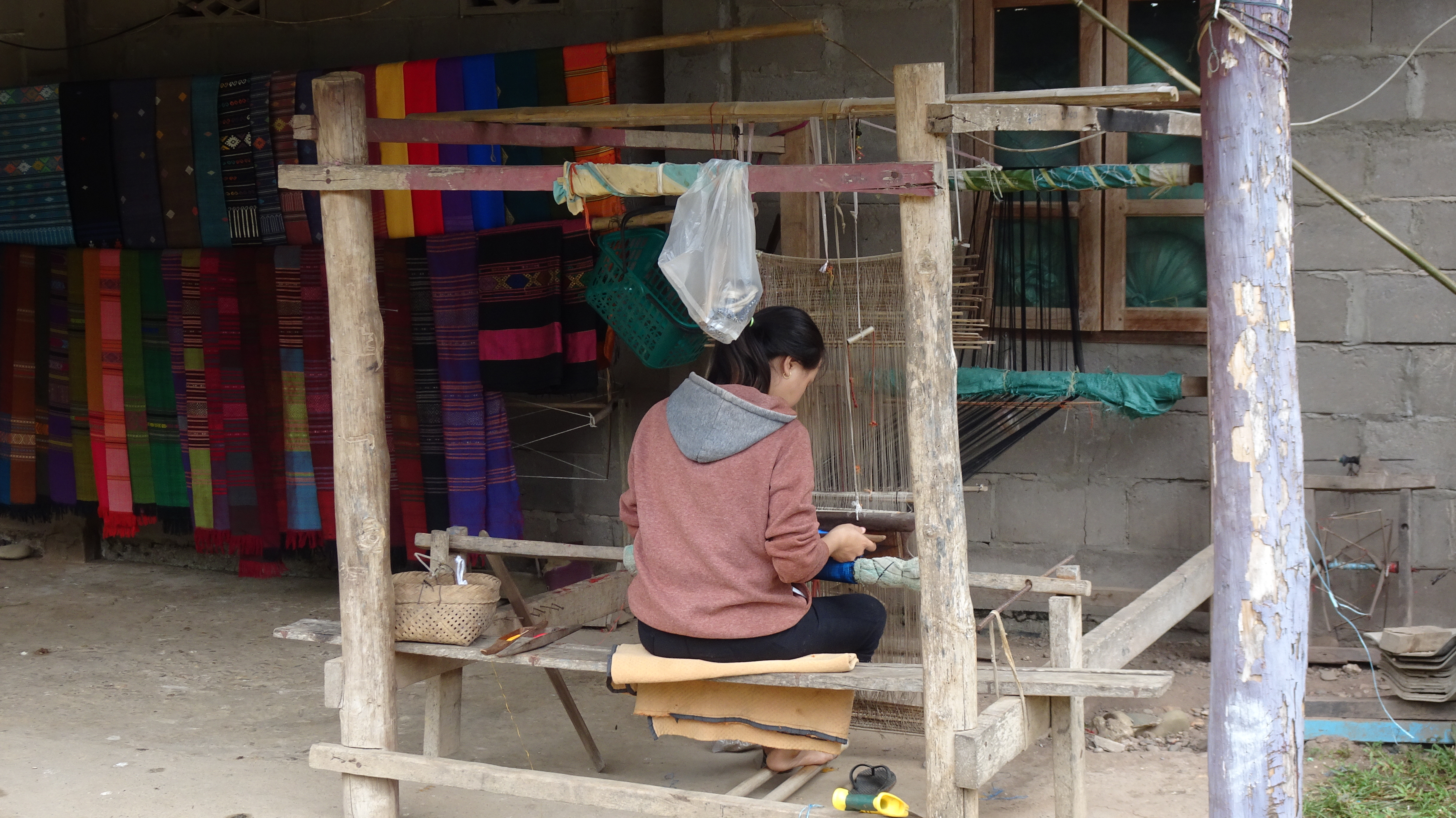 Vom Hügel, auf dem die Stupa steht, ist schon das Dorf Ban Nam Ngaen zu sehen. In ihm leben Familien der Tai Dam und der Tai Daeng. Diese sind keine gläubigen Buddhisten, sondern pflegen ihre Religion individuell in jedem Haus. Ink führt uns kreuz und quer durch die Gassen und Höfe. Wir können zusehen, wie die Frauen an einfachen Webstühlen wunderschöne Muster in Stoffe aus Seide und Baumwolle „zaubern“.