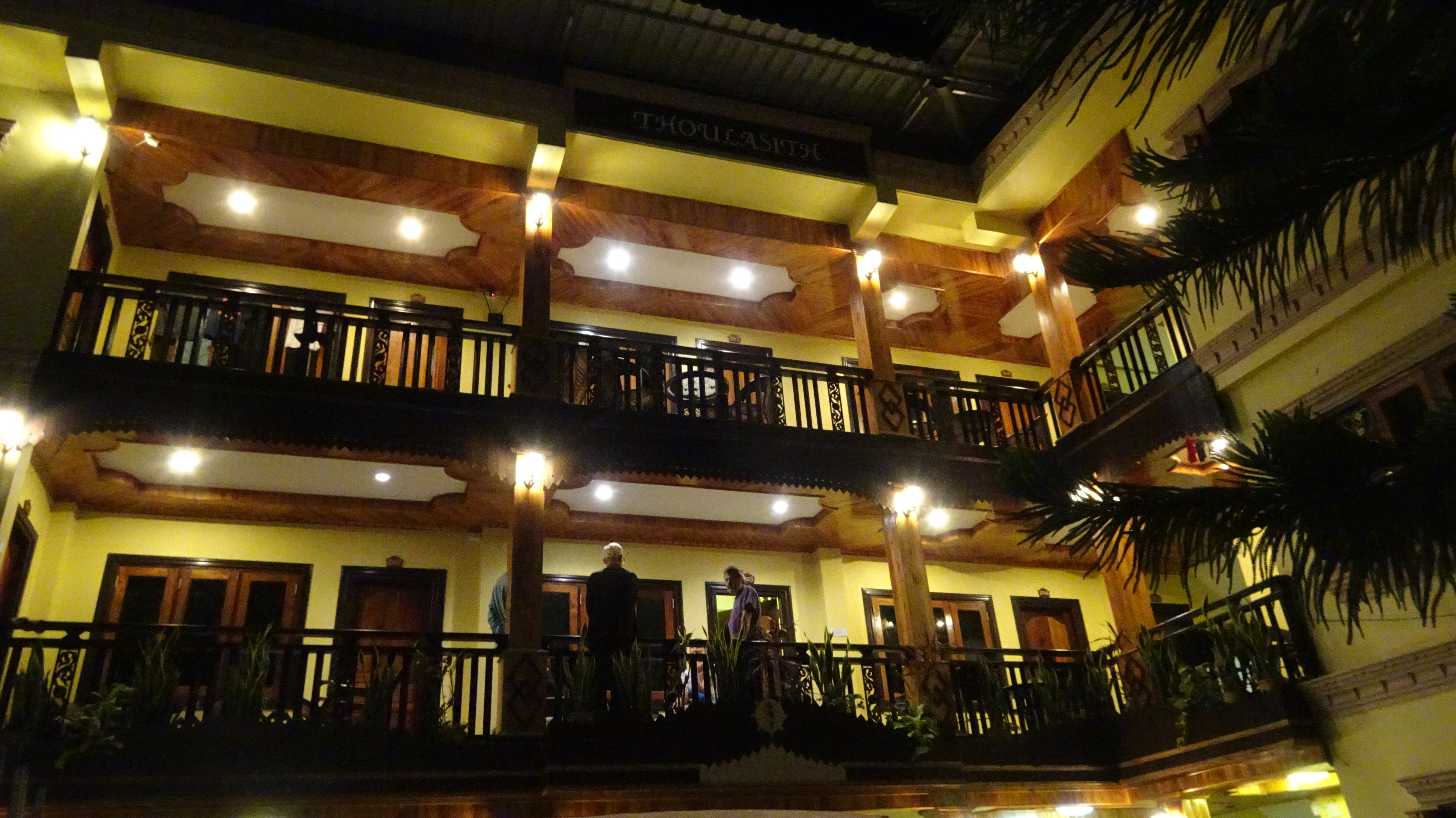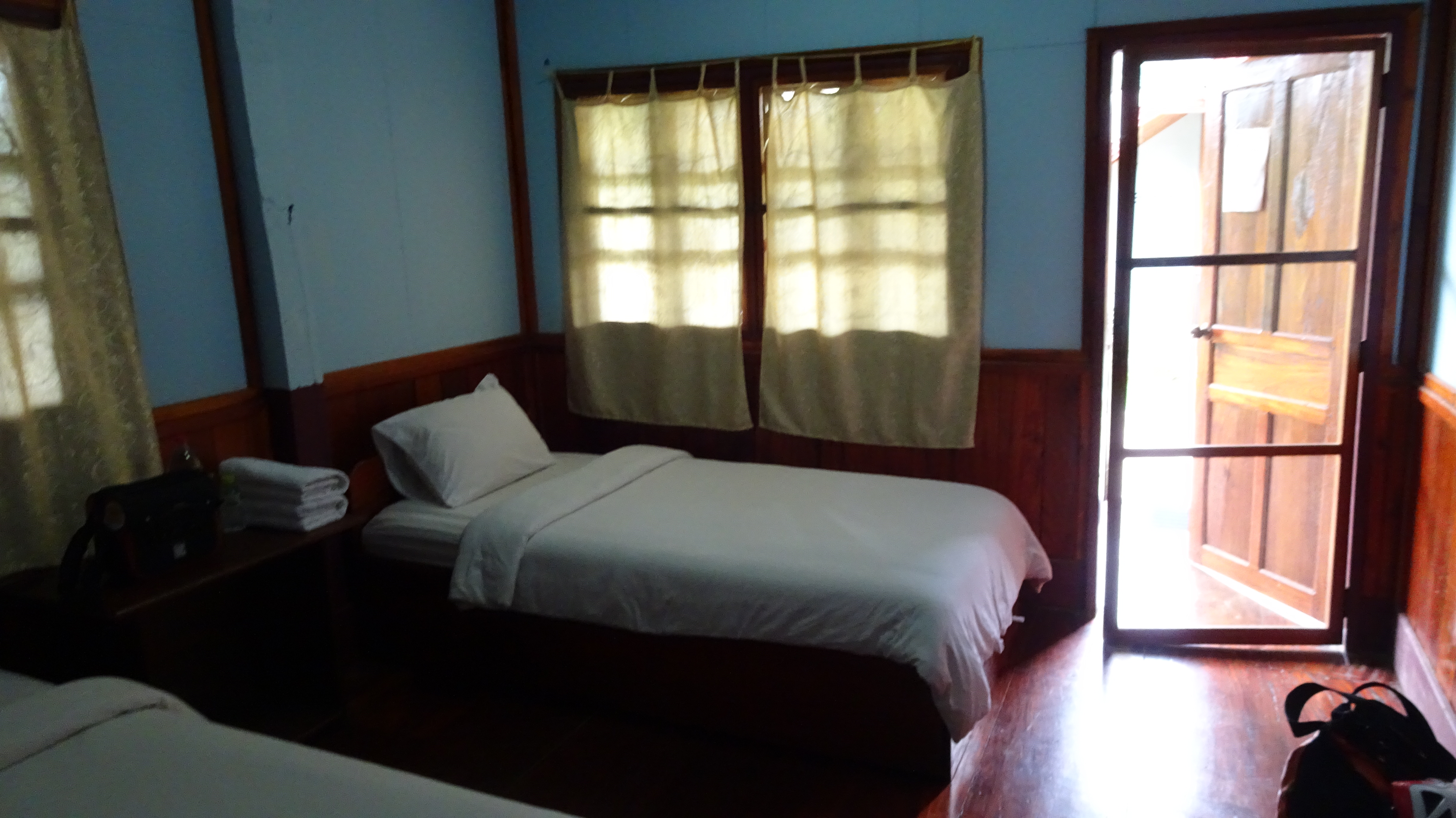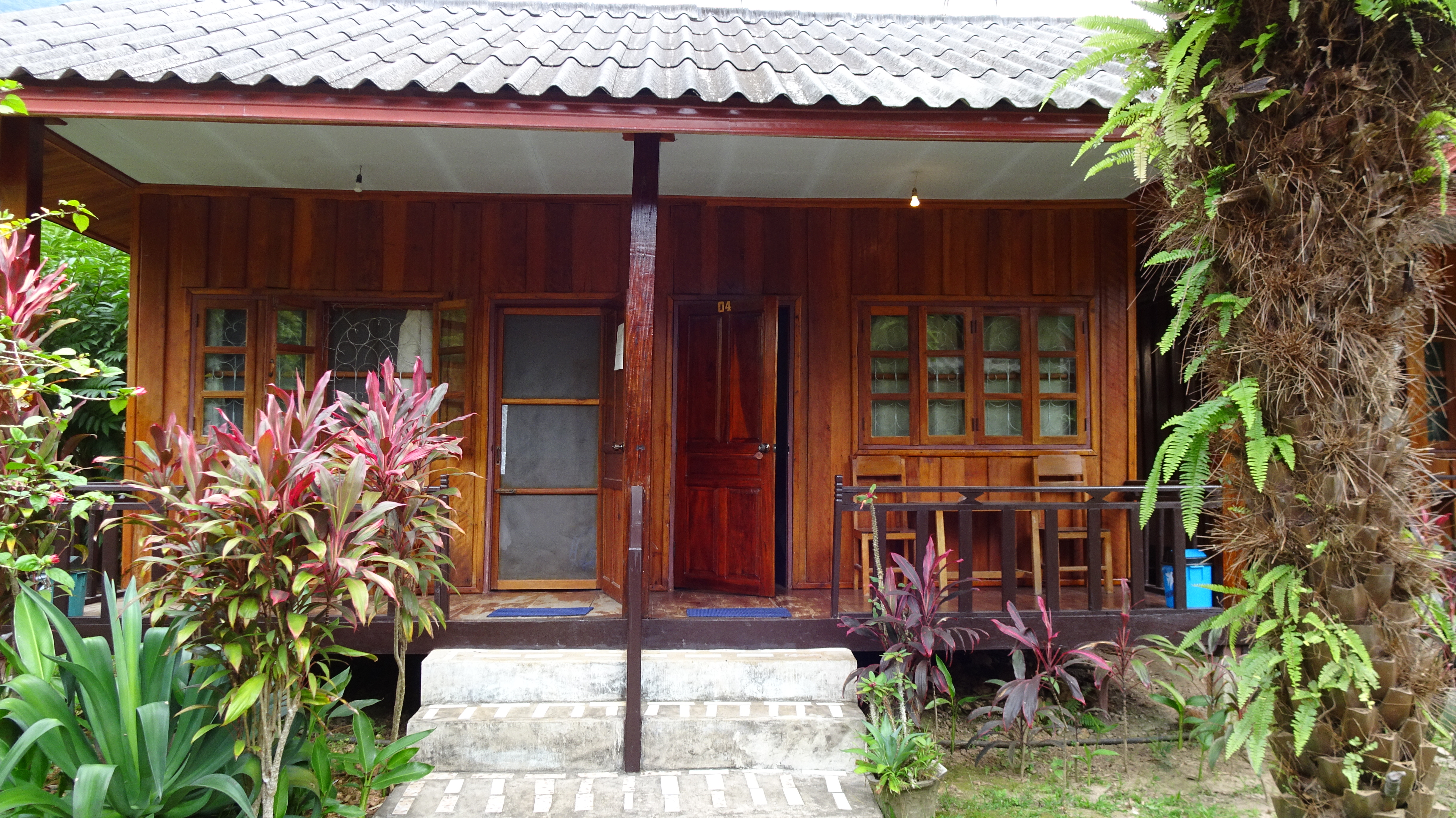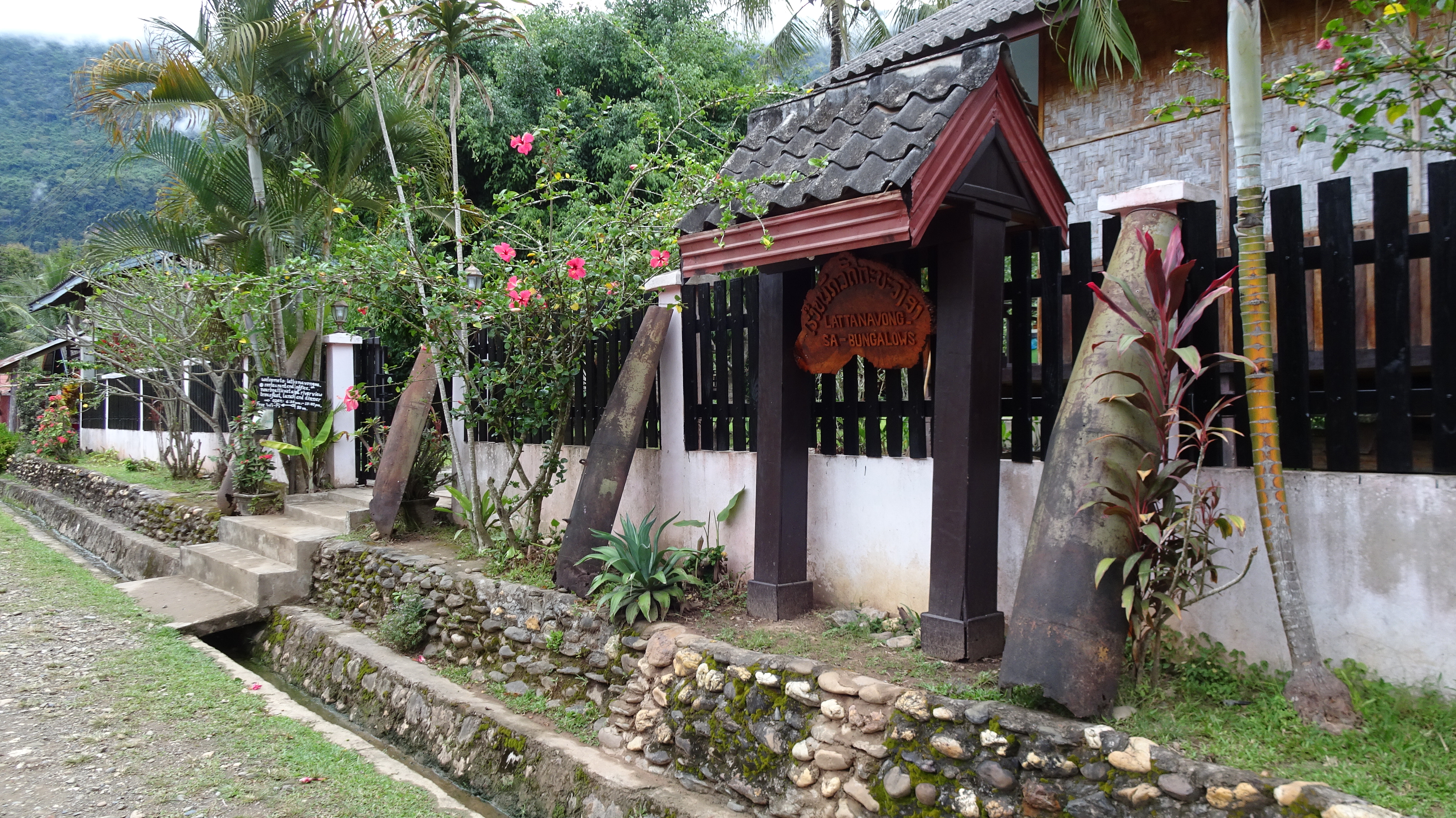 Nach kaum 5 Minuten, vorbei an 3 Restaurants, einem „Reisebüro“ und einem Minimarkt erreichten wir unser Bungalow-Ressort „Lattanavong“. Praktisch, zweckmäßig, alles was Weltreisende so zum Einfachwohlfühlen an minimalem für 2 Nächte und 1 Tag dazwischen brauchen. OK, die massiven Stühlchen auf den Verandas hätten komfortabler sein oder besser in Liegestühle mutiert werden können. Naja, mensch ist ja genügsam. 😉