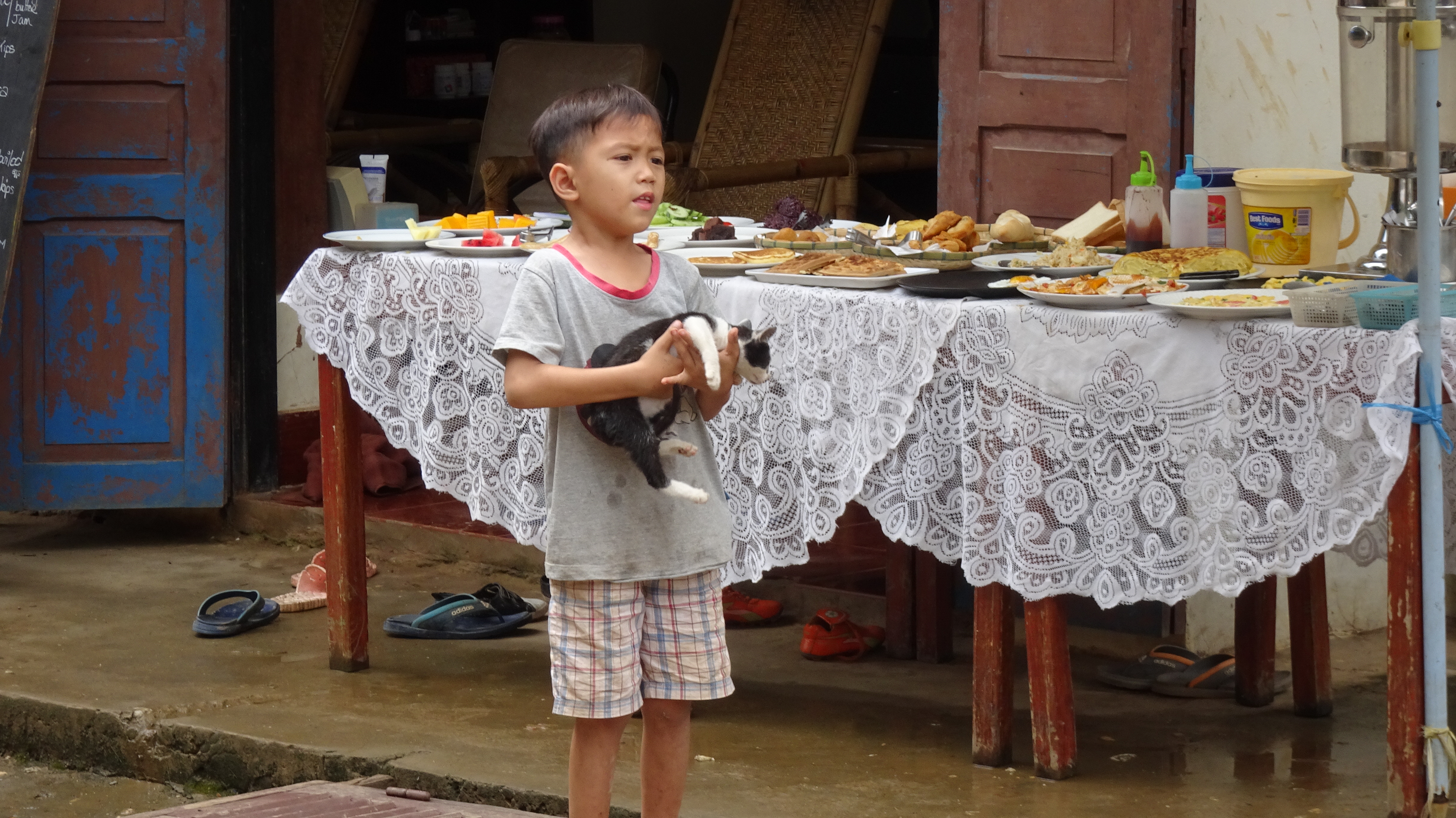Regen. Die ganze Nacht Regen und Wolken die zum greifen nah über den kleinen Ort Muang Ngoy hängen versüßen uns den Ruhetag. Wir sind froh heute keine Radetappe vor uns zu haben, sondern sich im Bett nochmals auf die andere Seite drehen zu können. Frühstücken spät und ausgiebig, Einige unternehmen eine Wanderung zu einer nah gelegenen Höhle und Andere erkunden den kleinen Ort der trotz der Abgeschiedenheit ein beliebtes Reiseziel bei zahlreichen Reisenden ist.