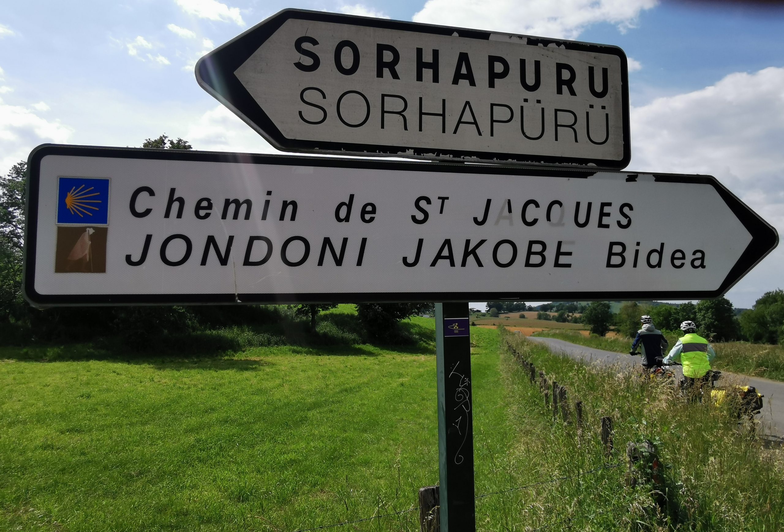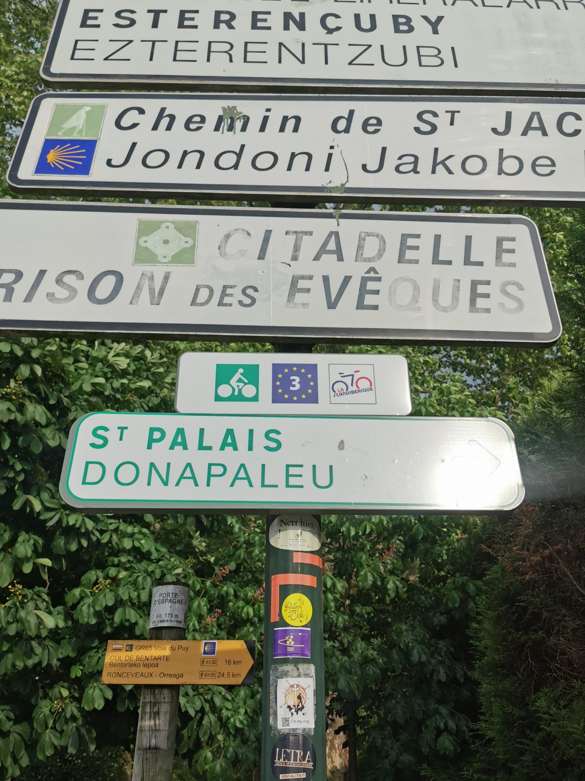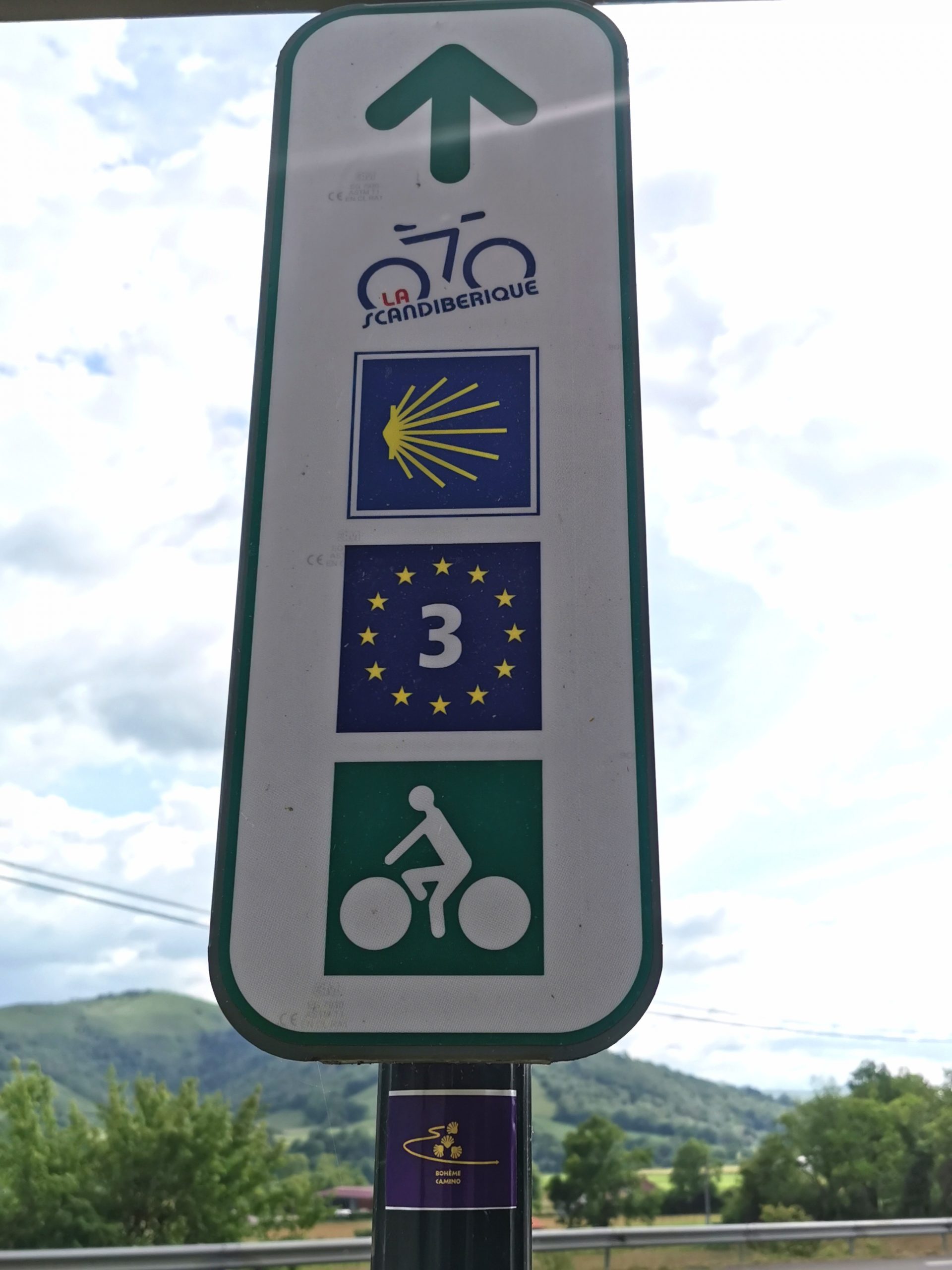 Wunderbar, freue ich mich am Abend, als ich das offizielle Schild für den Radler-Camino sehe, der auf die Passstrecke hinter unserem Hotel zeigt. Nicht zurück nach St. Jean, 12 Kilometer und gut 300 Höhenmeter gespart! Gegencheck auf der neu aufgelegten Karte für Camino-Radler: Ja, das geht, ein 800 Meter langer Grasweg kurz vor der Passhöhe ist zu überbrücken und ca. drei Kilometer Feldweg an der Französisch-Spanischen-Grenze.