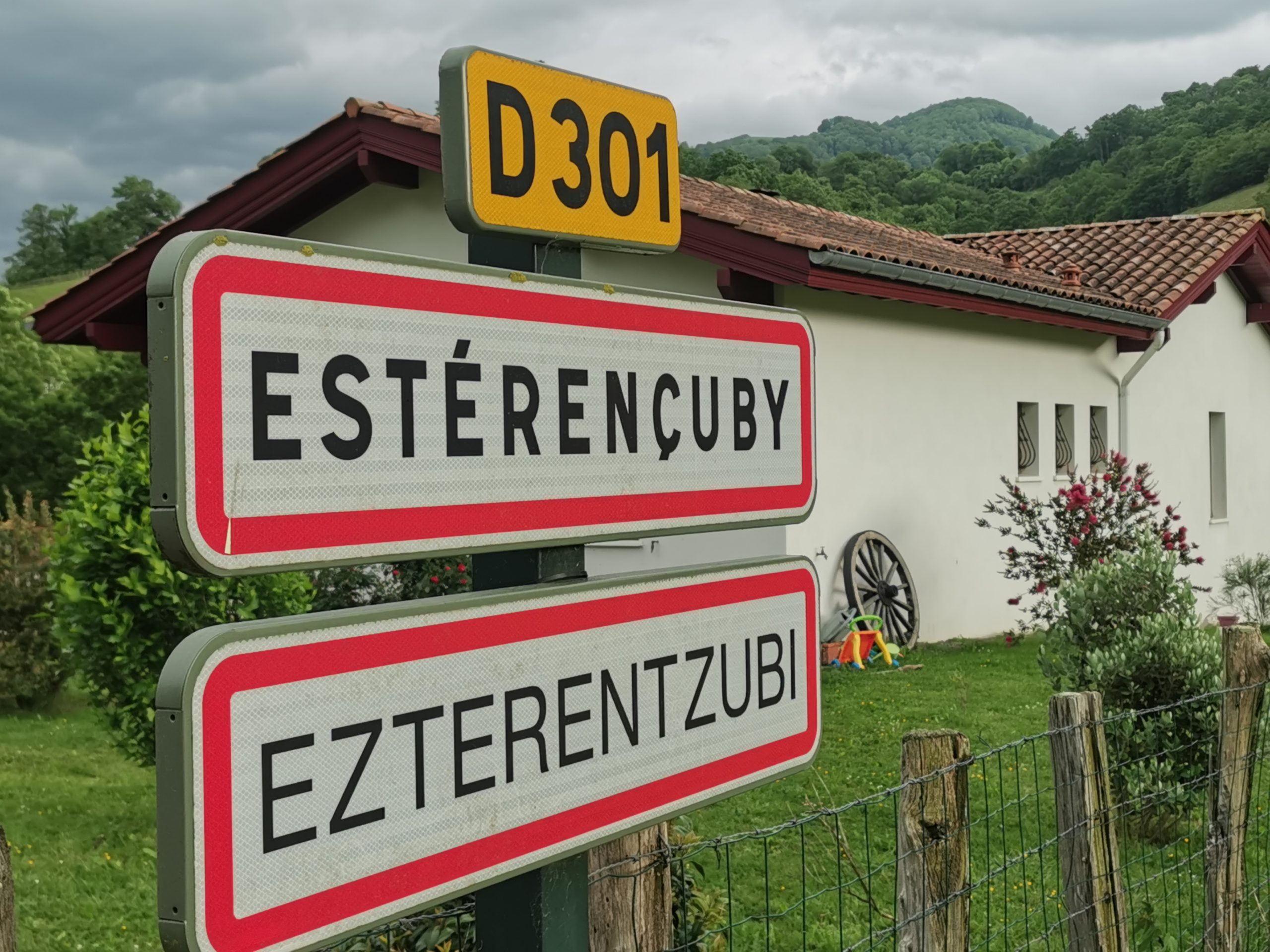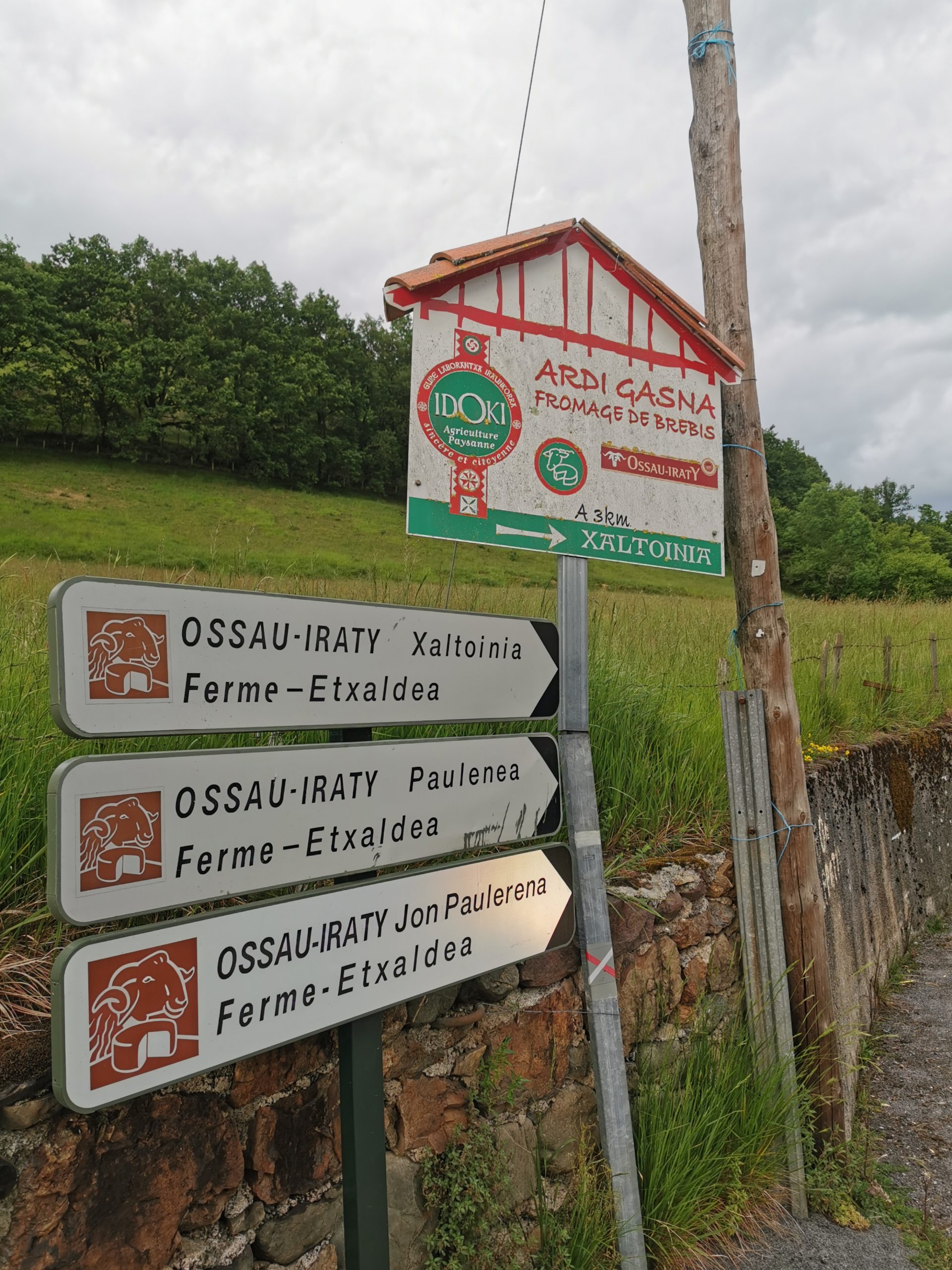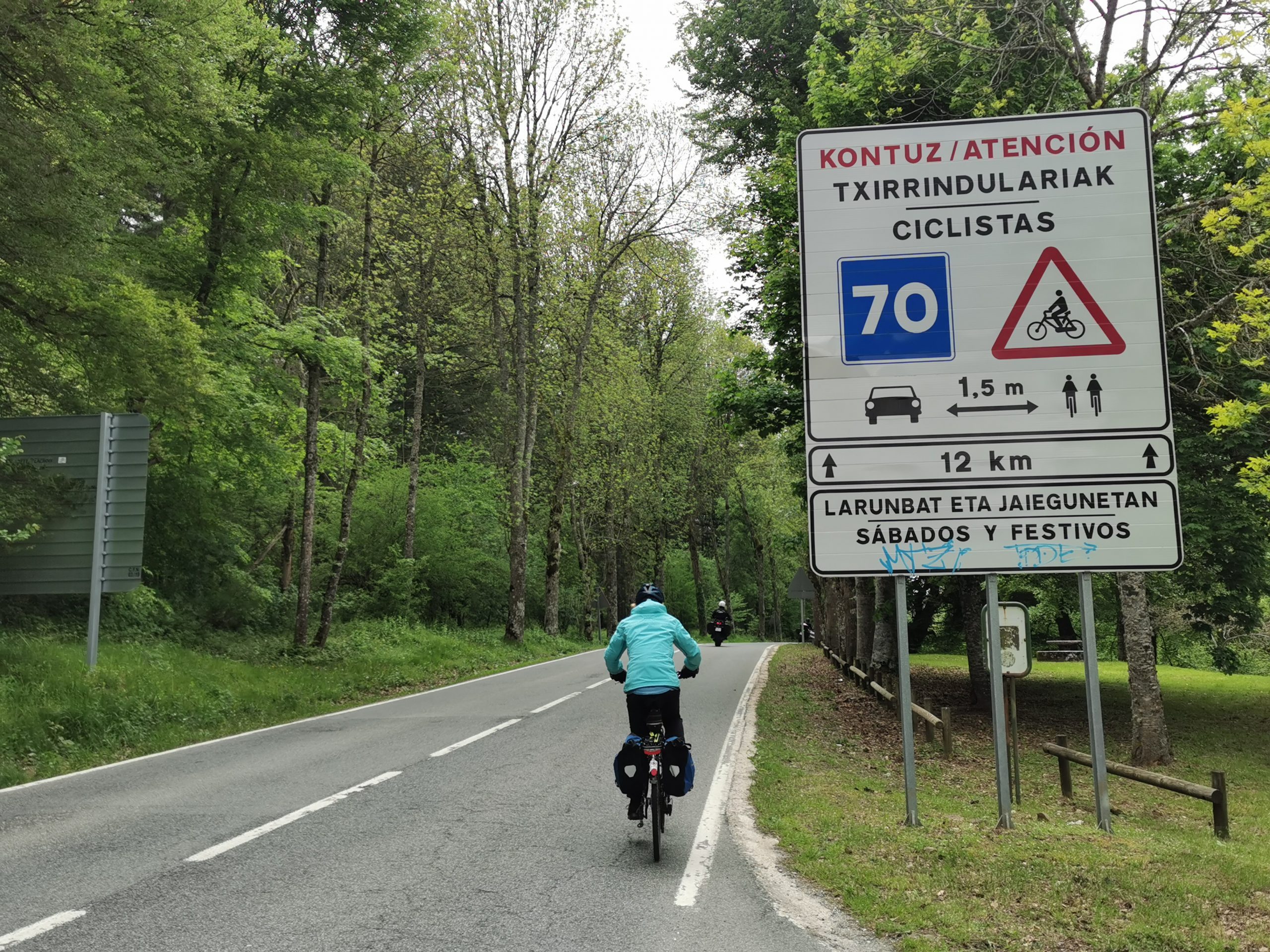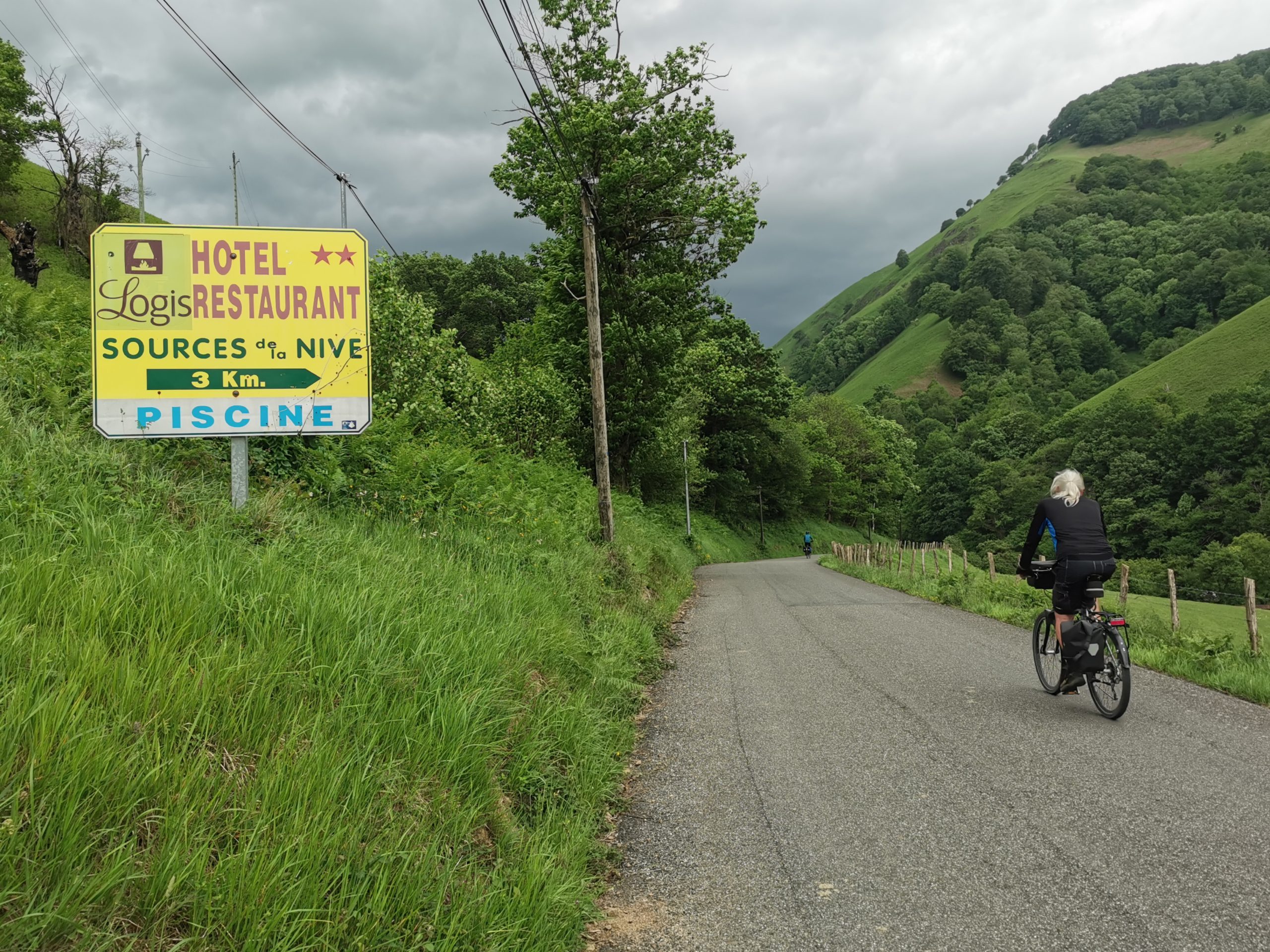 Wunderbar, freue ich mich am Abend, als ich das offizielle Schild für den Radler-Camino sehe, der auf die Passstrecke hinter unserem Hotel zeigt. Nicht zurück nach St. Jean, 12 Kilometer und gut 300 Höhenmeter gespart! Gegencheck auf der neu aufgelegten Karte für Camino-Radler: Ja, das geht, ein 800 Meter langer Grasweg kurz vor der Passhöhe ist zu überbrücken und ca. drei Kilometer Feldweg an der Französisch-Spanischen-Grenze.