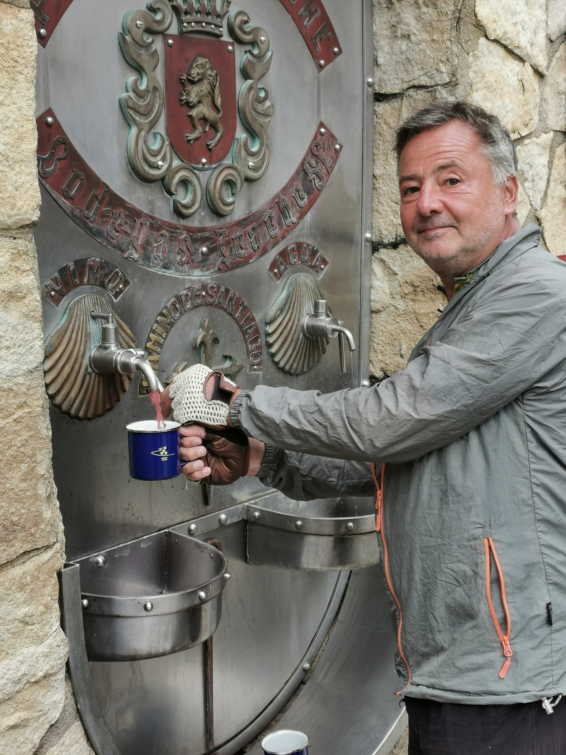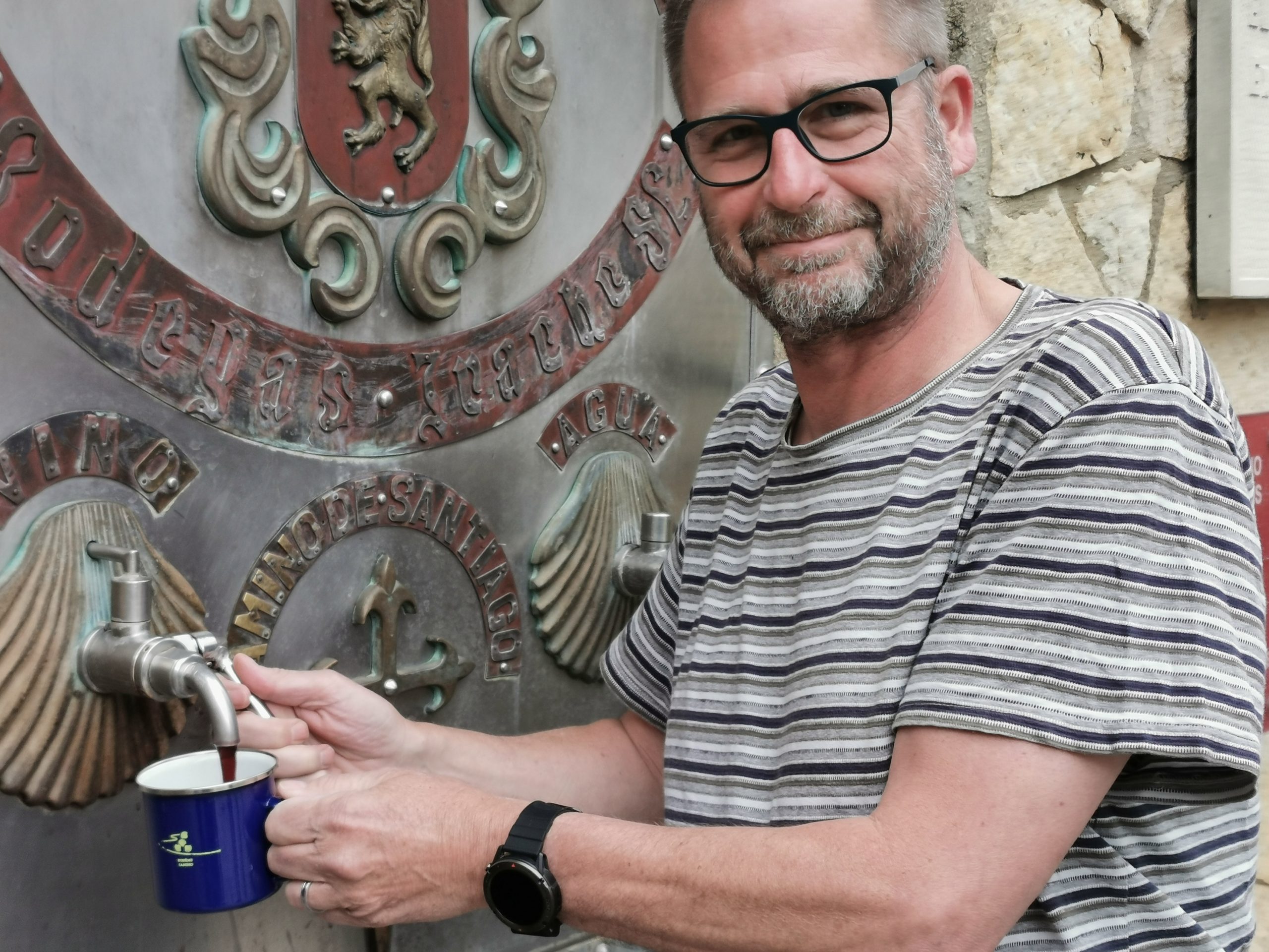 Wein für alle! Alle Pilger, zu Fuß oder auf zwei Rädern. So wie sich hier am Vormittag die Pilger an der berühmten Weinquelle drängen (100 Liter pro Tag, dass ist das Versprechen, dass das Kloster der Winzerei für die Überlassung des Weinberges abgenommen hat), schauen die meisten Pilger gegen Mittag schon in die Röhre beziehungsweise den Zapfhahn, der zu allem Überfluss auch noch schlecht zu schließen ist und Überdruck hat.