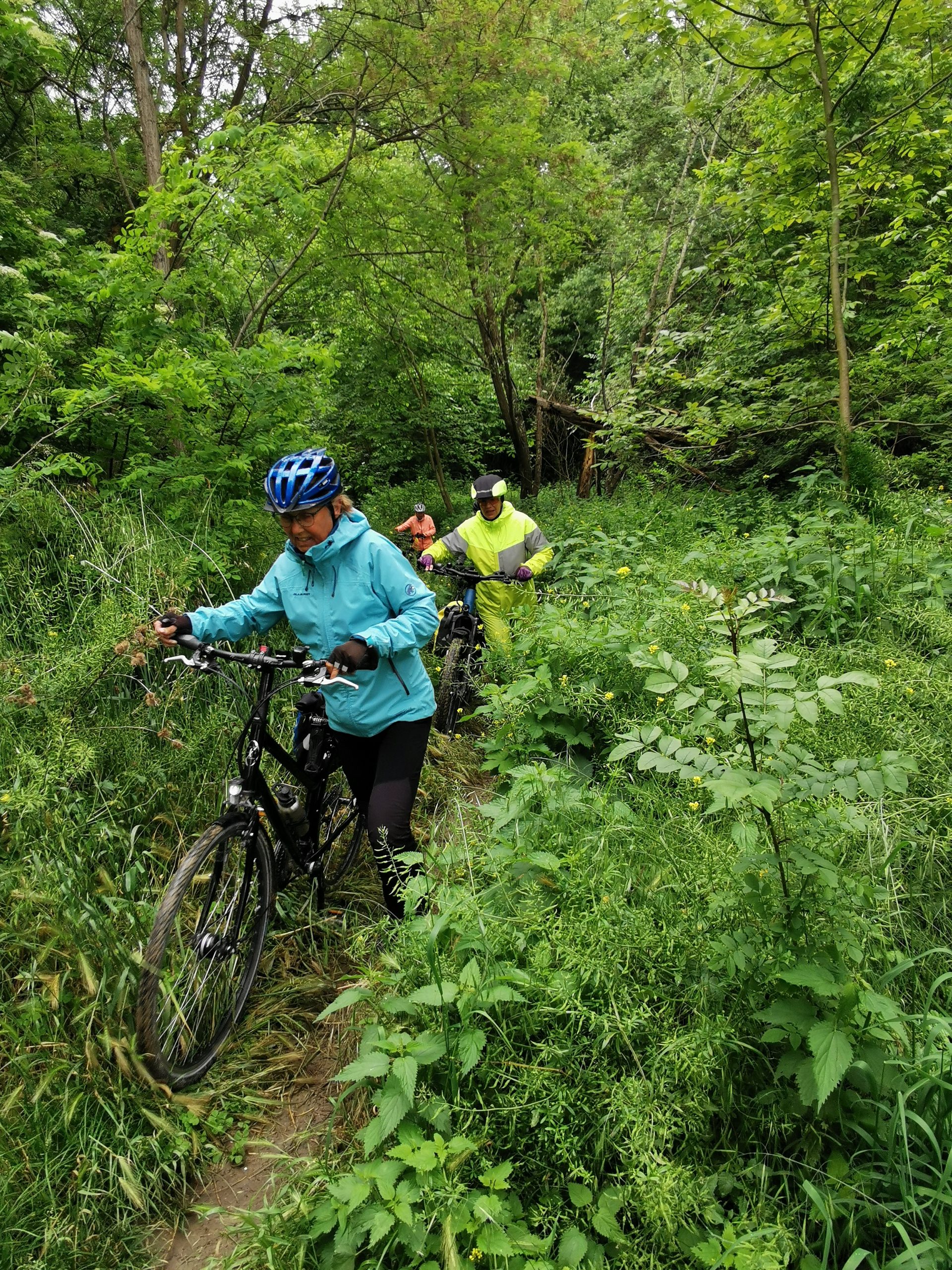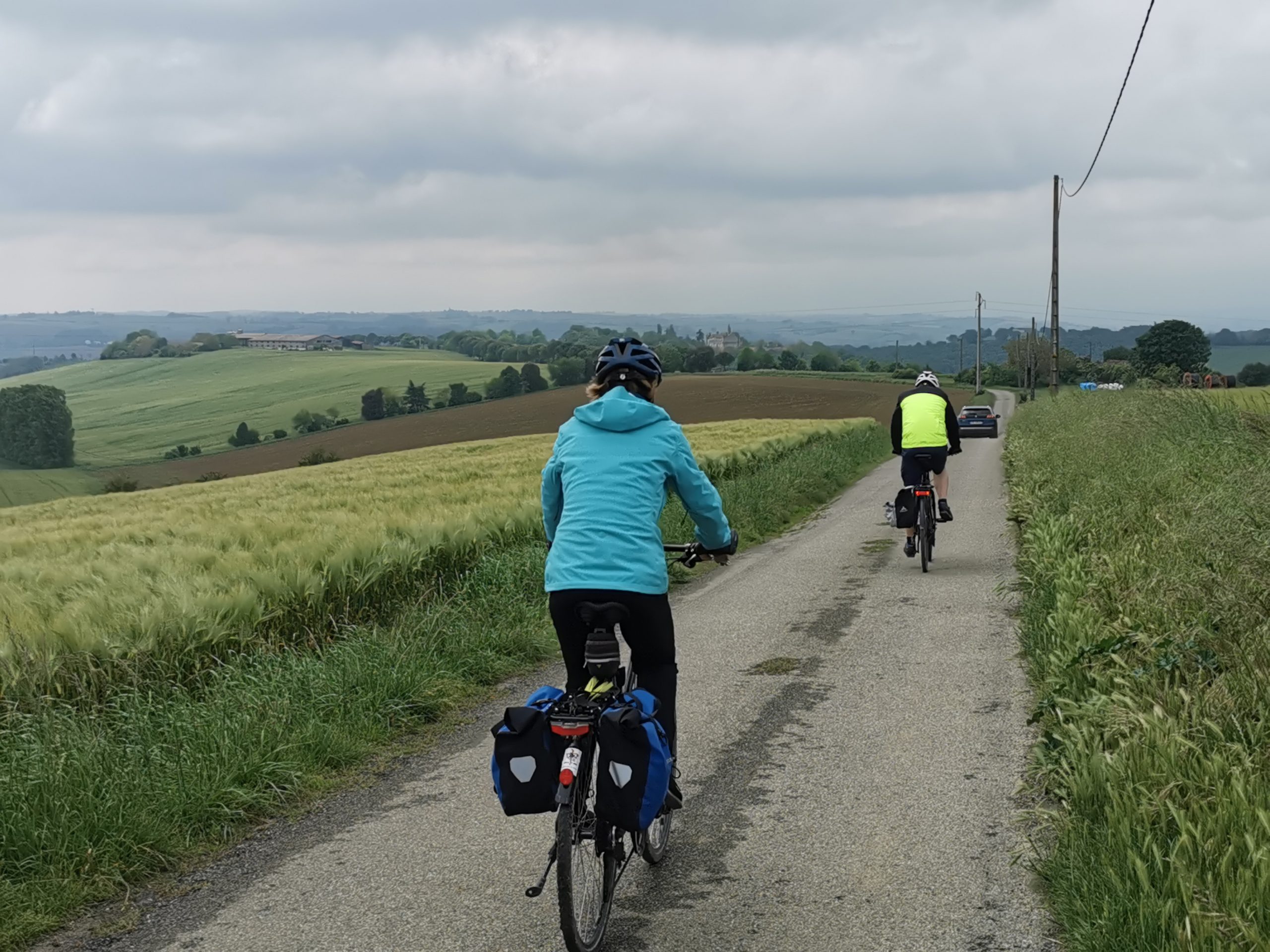 Die Fahrt nach Cazères lässt sich noch gut an, wir radeln entspannt an der Garonne entlang, den Garonne-Radweg. Nur dass der dann irgendwann weg ist. Nach 20 Kilometern teilweise neben einer Autobahn beschließe ich bei der Kaffeepause, umzuplanen. Das beschert uns wunderschöne Landschaft, ruhige Straßen, atemberaubende Fernblicke. Leider aber auch einen Ausflug in die Botanik (als Radweg ausgeschildert, in Wahrheit aber nur ein schlammiger Singletrail, der an einem verschlossenen Tor endet (s. Überschrift) und etliche Höhenmeter, die wir aber zum Ausgleich auch wieder hinuntersaußen dürfen.