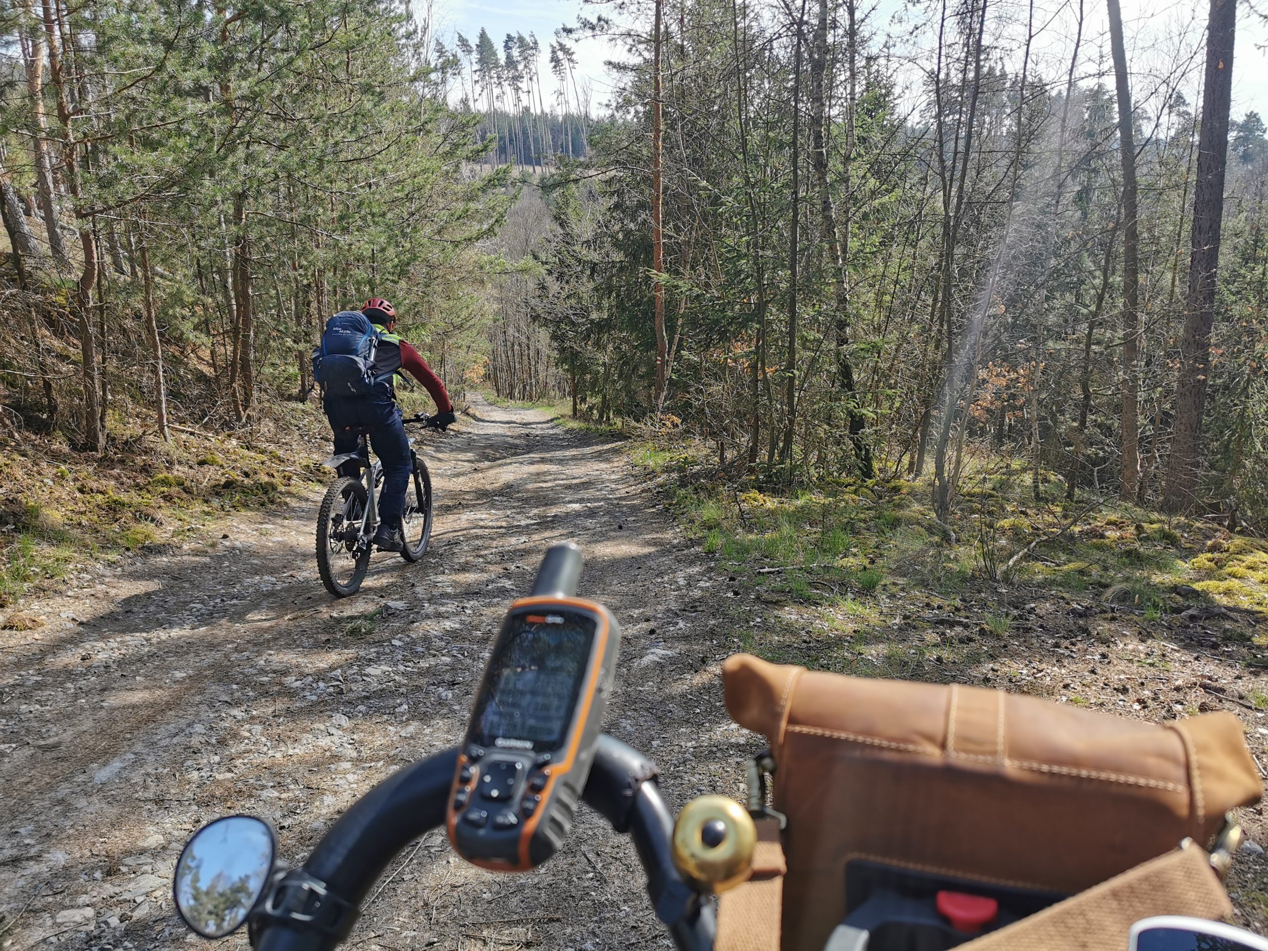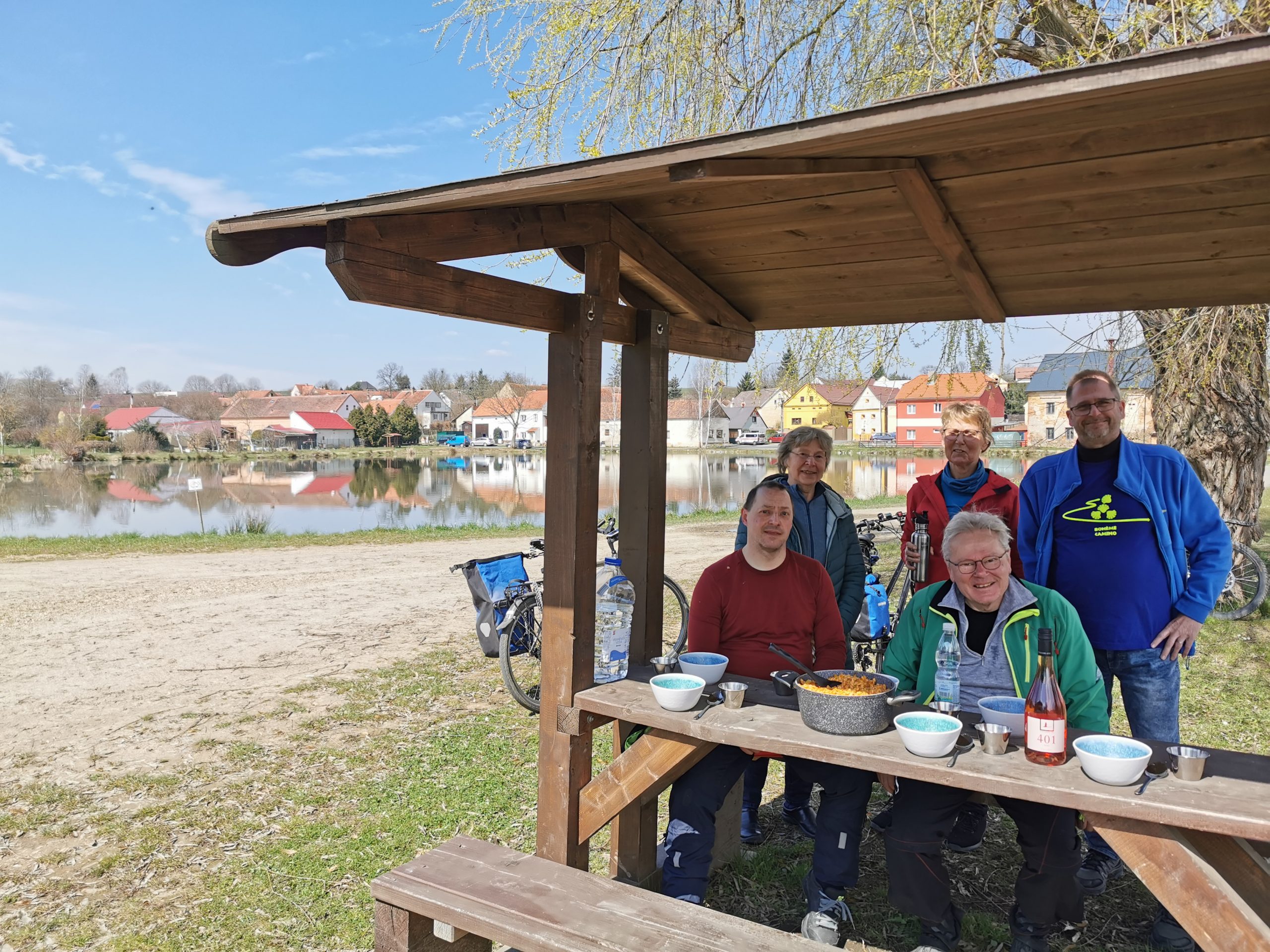 Aber genug des Meckerns: Auch wenn wir alle heute ein- bis zweimal geflucht haben, vor allem, als der „Radweg“ über unwegsame, schlammübersäte Waldwege führte: Es geht uns gut, die Landschaft ist grandious, meist rollt es auch gut, und die Kulinarik sorgt für weiteres Glücksgefühl. So auch beim Picknick am Löschwasserteich in Pňovany.