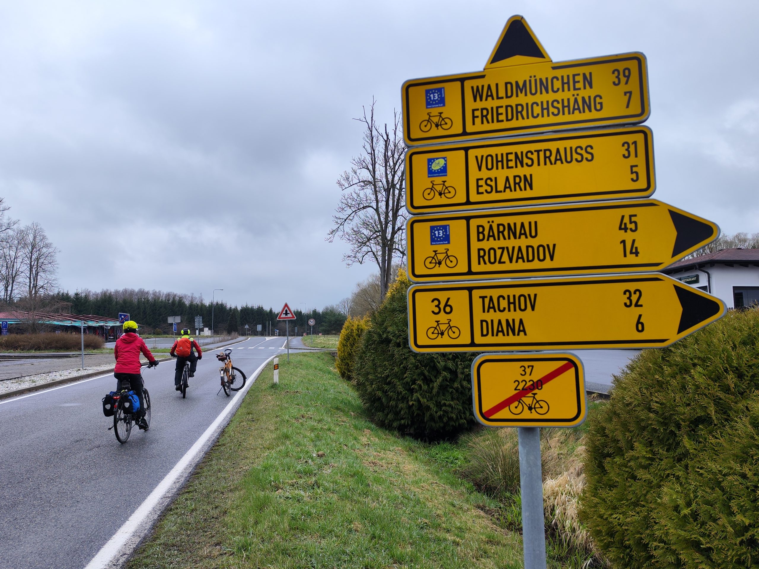 Den Paneuroparadweg genießen wir heute in homöopathischen Dosen, wobei die Erstverschlimmerung glücklicherweise ausbleibt. Mit Wonne blicken wir vom Flüsterasphalt auf die eine Einmündung des viel gepriesenen, angeblich fertiggestellten Radwegs Prag-Paris, die aus durchfurchtem Waldboden besteht. Ab bayrischer Grenze ist der Paneuroparadweg dann tatsächlich einmal ausgeschildert. Vor allem aber der Jakobsweg!