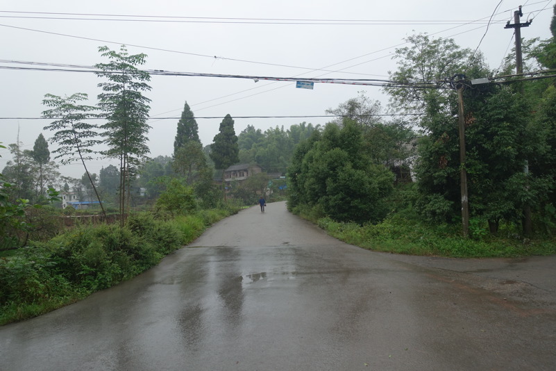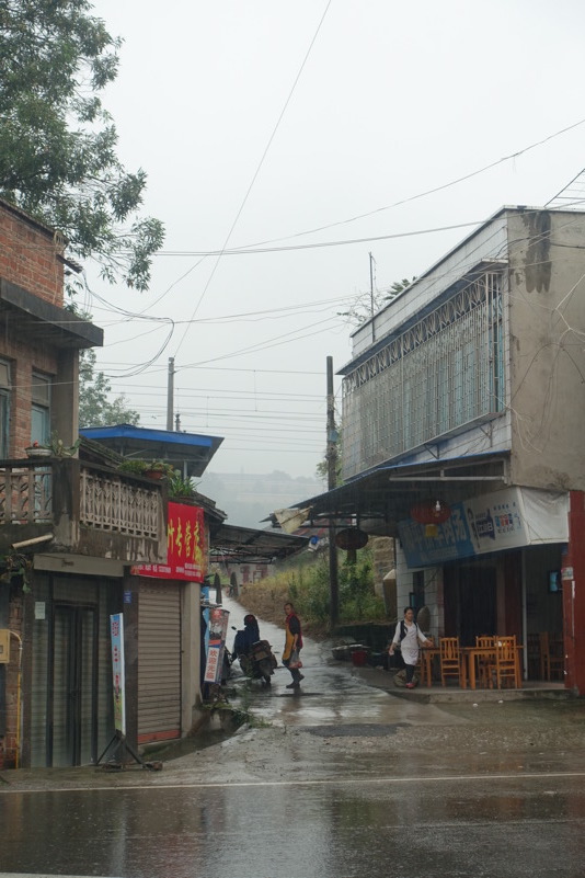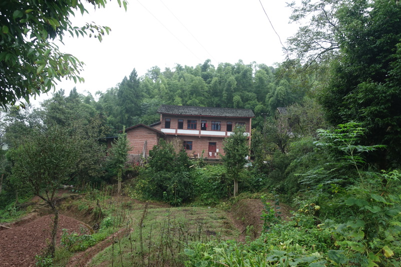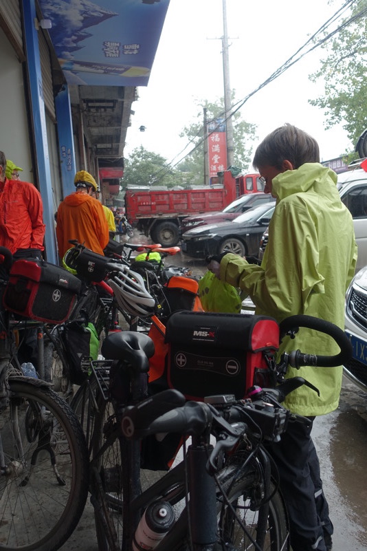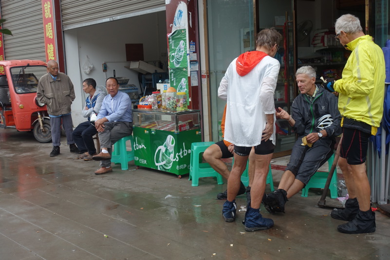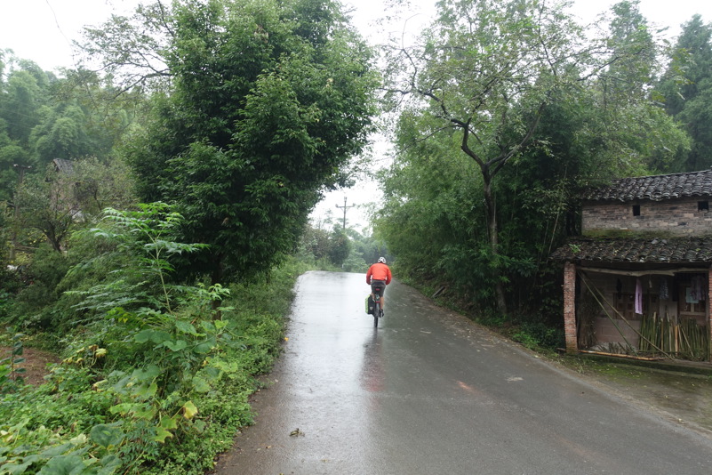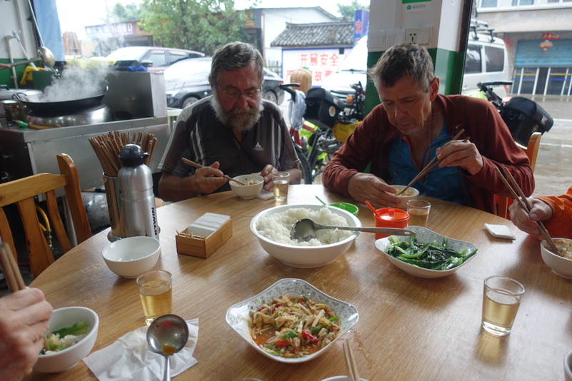 Am späten Vormittag treffen wir wieder mit den beiden Luos und dem Begleitfahrzeug zusammen. Derweil kurvt Maria immer noch mit Xiao Lei und dem anderen Fahrzeug auf wilder Fahrt durch Sichuan. Wie durch ein Wunder treffen wir aber zum Mittagessen wieder alle zusammen. Eine junge Familie bekocht uns mit einfachen und leckeren Gerichten. Wir werden neugierig beäugt und bestaunt, allgemein freut man sich darüber „Langnasen“ mal in Echt und in Farbe zu sehen. Mittlerweile hat sich der leichte Niesel zu einem amtlichen Regen ausgewachsen, der keine Anstalten macht aufzuhören. So wird das Letzte Drittel mal wieder zu einer richtig nassen Angelegenheit.