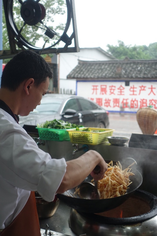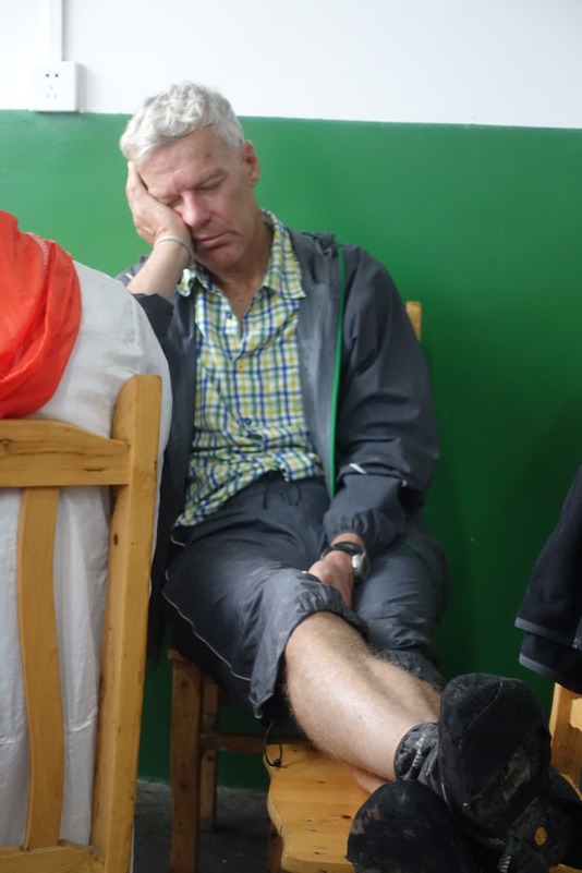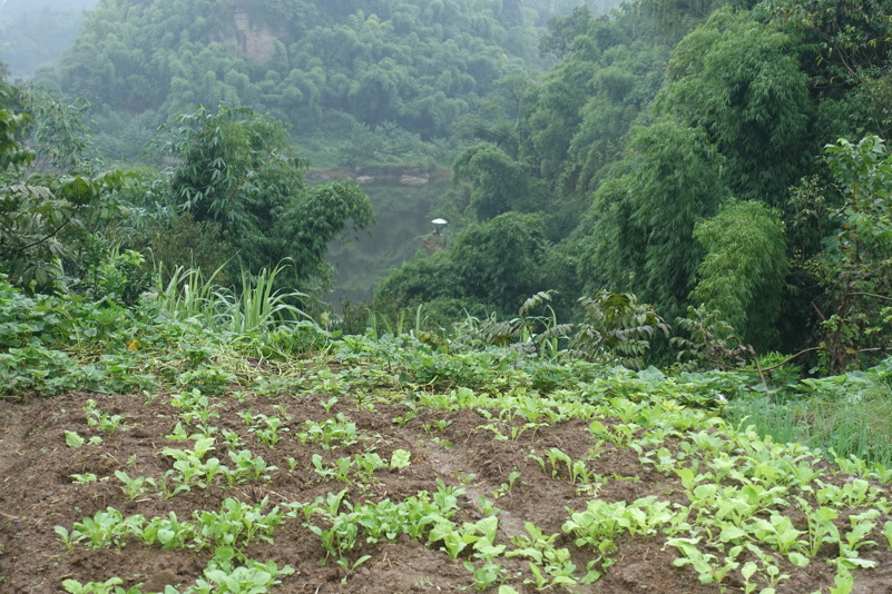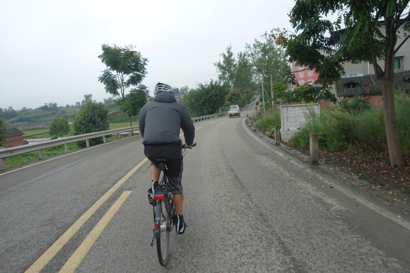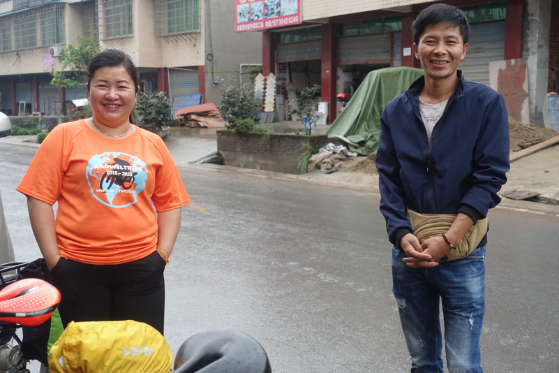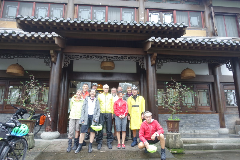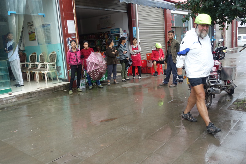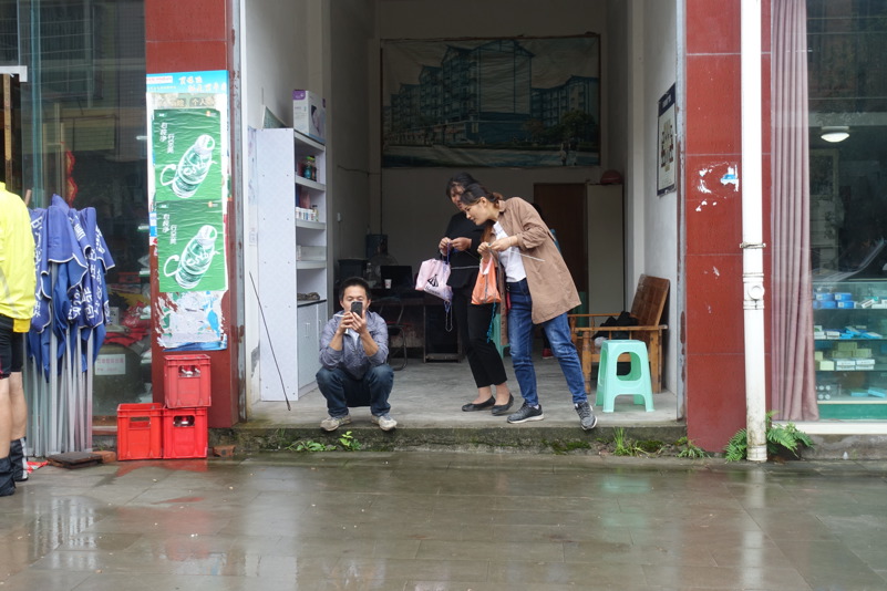 Am späten Vormittag treffen wir wieder mit den beiden Luos und dem Begleitfahrzeug zusammen. Derweil kurvt Maria immer noch mit Xiao Lei und dem anderen Fahrzeug auf wilder Fahrt durch Sichuan. Wie durch ein Wunder treffen wir aber zum Mittagessen wieder alle zusammen. Eine junge Familie bekocht uns mit einfachen und leckeren Gerichten. Wir werden neugierig beäugt und bestaunt, allgemein freut man sich darüber „Langnasen“ mal in Echt und in Farbe zu sehen. Mittlerweile hat sich der leichte Niesel zu einem amtlichen Regen ausgewachsen, der keine Anstalten macht aufzuhören. So wird das Letzte Drittel mal wieder zu einer richtig nassen Angelegenheit.