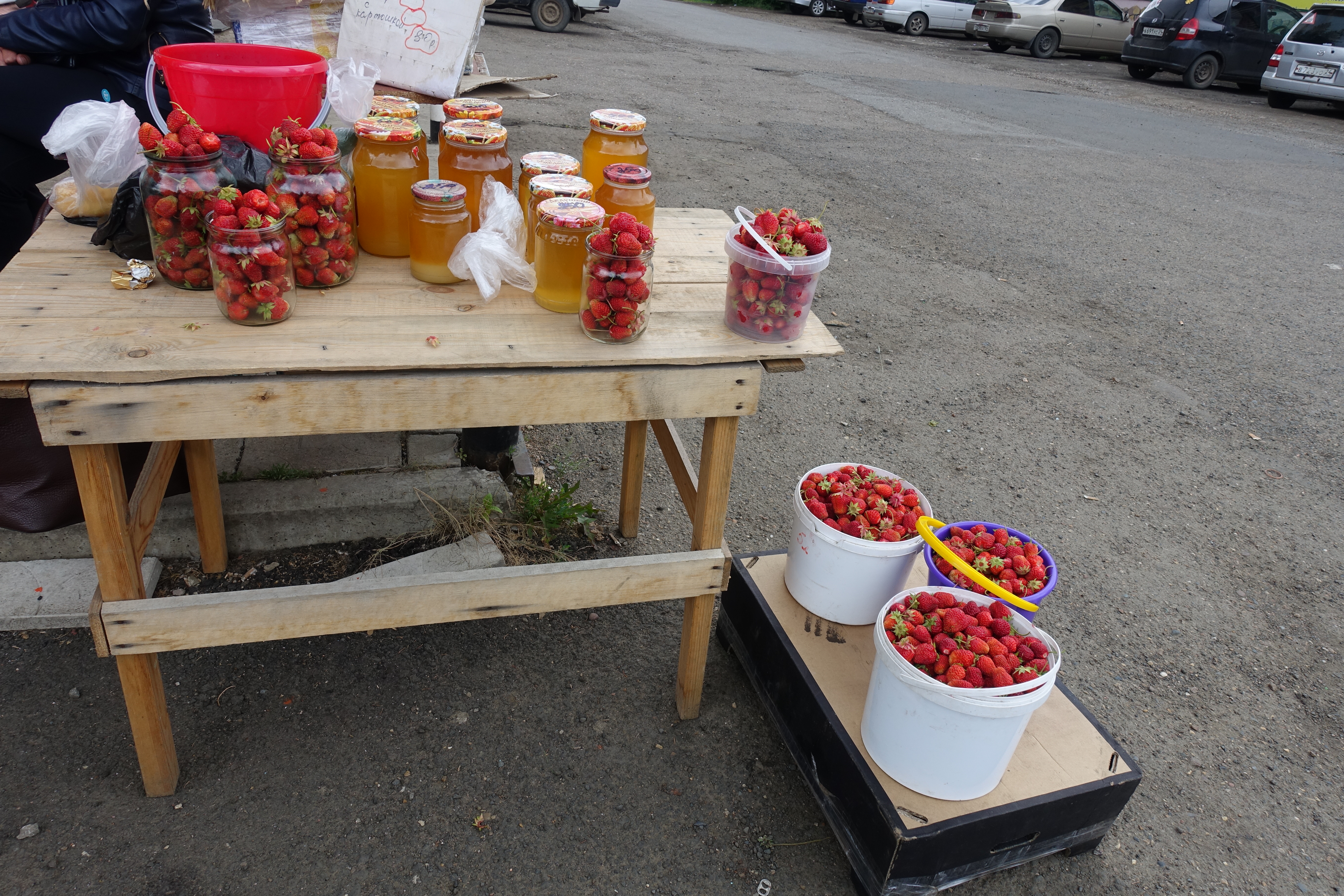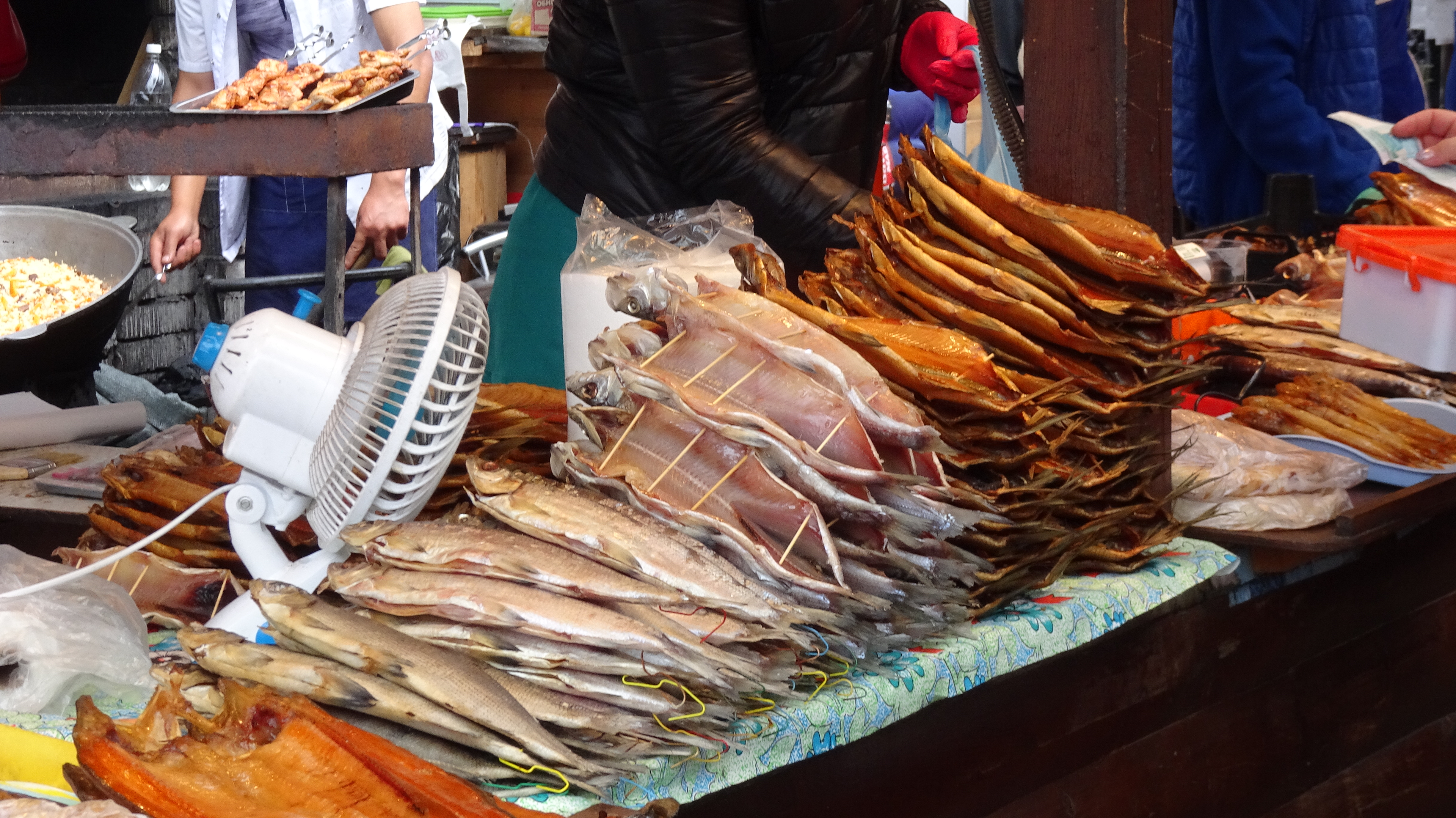 Danach bummelten wir wie viele andere „Touris“ auch durch alle Angebotsstände und Touristeninfos entlang der Gorkistraße bis zu einem etwas größeren Markt und ließen uns zum Mittag leckeren heißgeräucherten Baikalfisch schmecken.