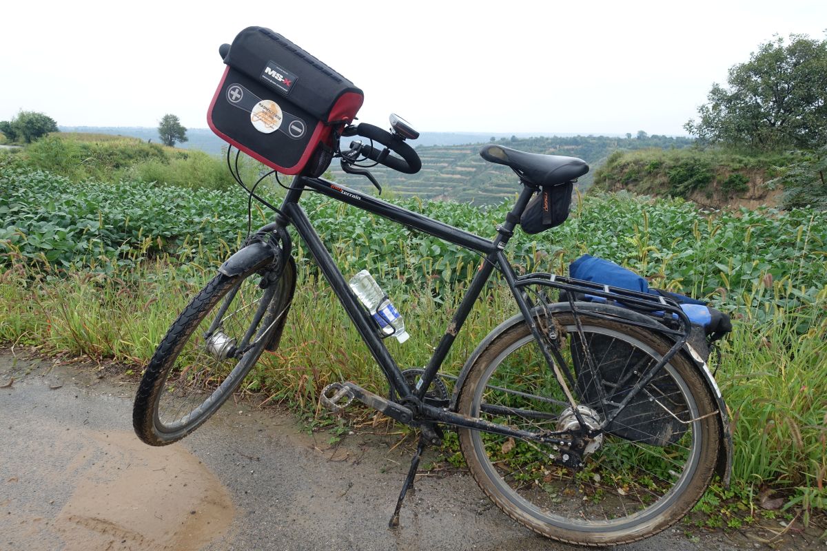 Die Nacht brachte Regen. Als wir losfuhren regnete es noch immer, hörte aber nach ein paar Kilometern wieder auf. Nach rund 7 km war eine Brücke, die wir hätten passieren sollen weggerissen und statt dessen eine Baustelle dort. Eine Behelfsstraße war durch den Regen so aufgeweicht, dass der Lößschlamm extrem weich und glitschig war. Wir versuchten unser Räder durch zu schieben, aber nach ein paar Metern waren die Räder so mit Matsch zugesetzt, dass die Räder sich nicht mehr drehten. Nun mussten wir die Räder den Weg hinaufschleifen. Das war ein schwieriges Unterfangen, da man auf dem rutschigen Untergrund keinen richtigen Halt hatte und die Räder ganz schön Gewicht hatten. Einige von uns hat es bei der Aktion in den Matsch gehauen. Schöne Sauerei.