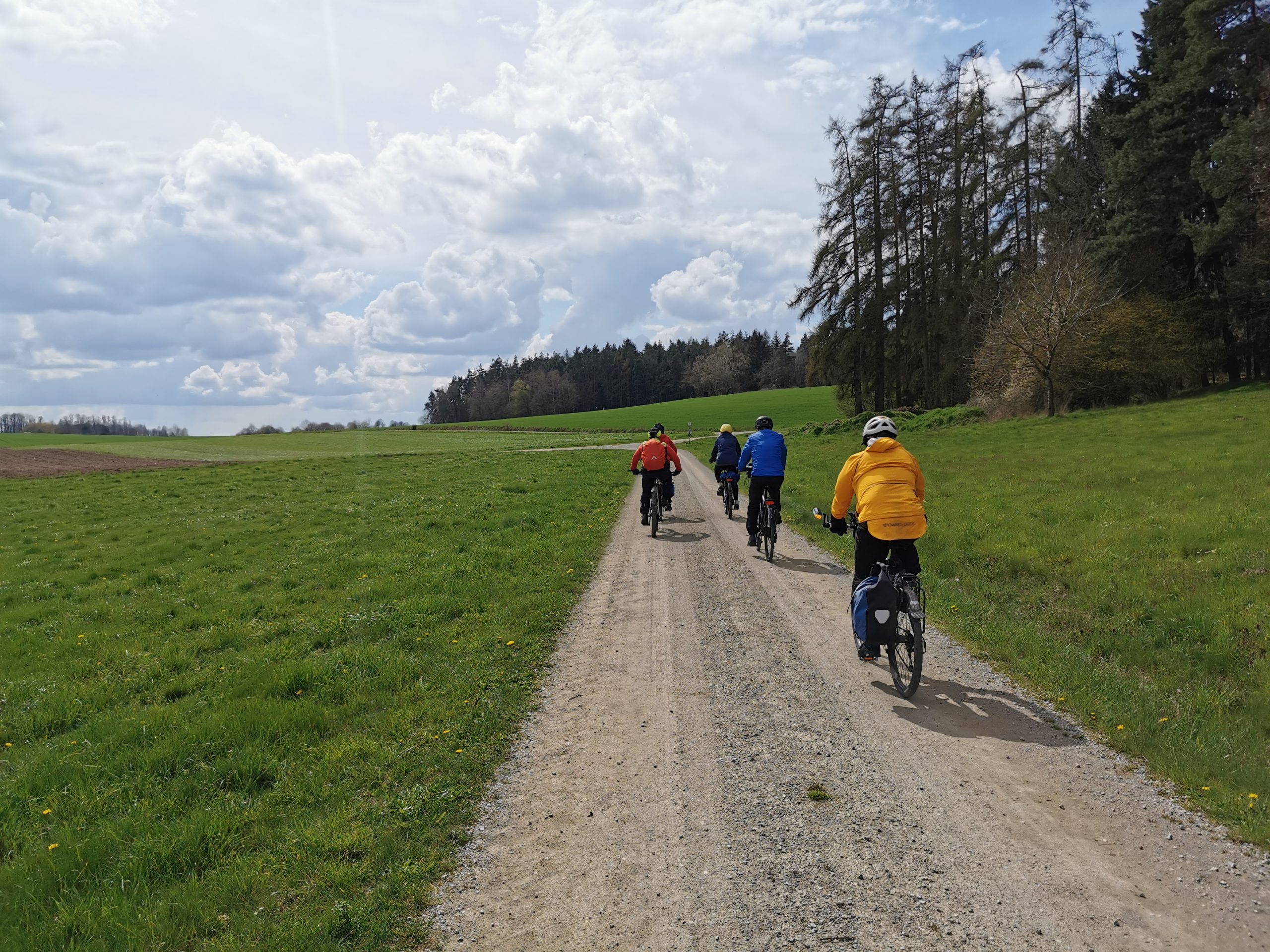 Den Paneuroparadweg genießen wir heute in homöopathischen Dosen, wobei die Erstverschlimmerung glücklicherweise ausbleibt. Mit Wonne blicken wir vom Flüsterasphalt auf die eine Einmündung des viel gepriesenen, angeblich fertiggestellten Radwegs Prag-Paris, die aus durchfurchtem Waldboden besteht. Ab bayrischer Grenze ist der Paneuroparadweg dann tatsächlich einmal ausgeschildert. Vor allem aber der Jakobsweg!