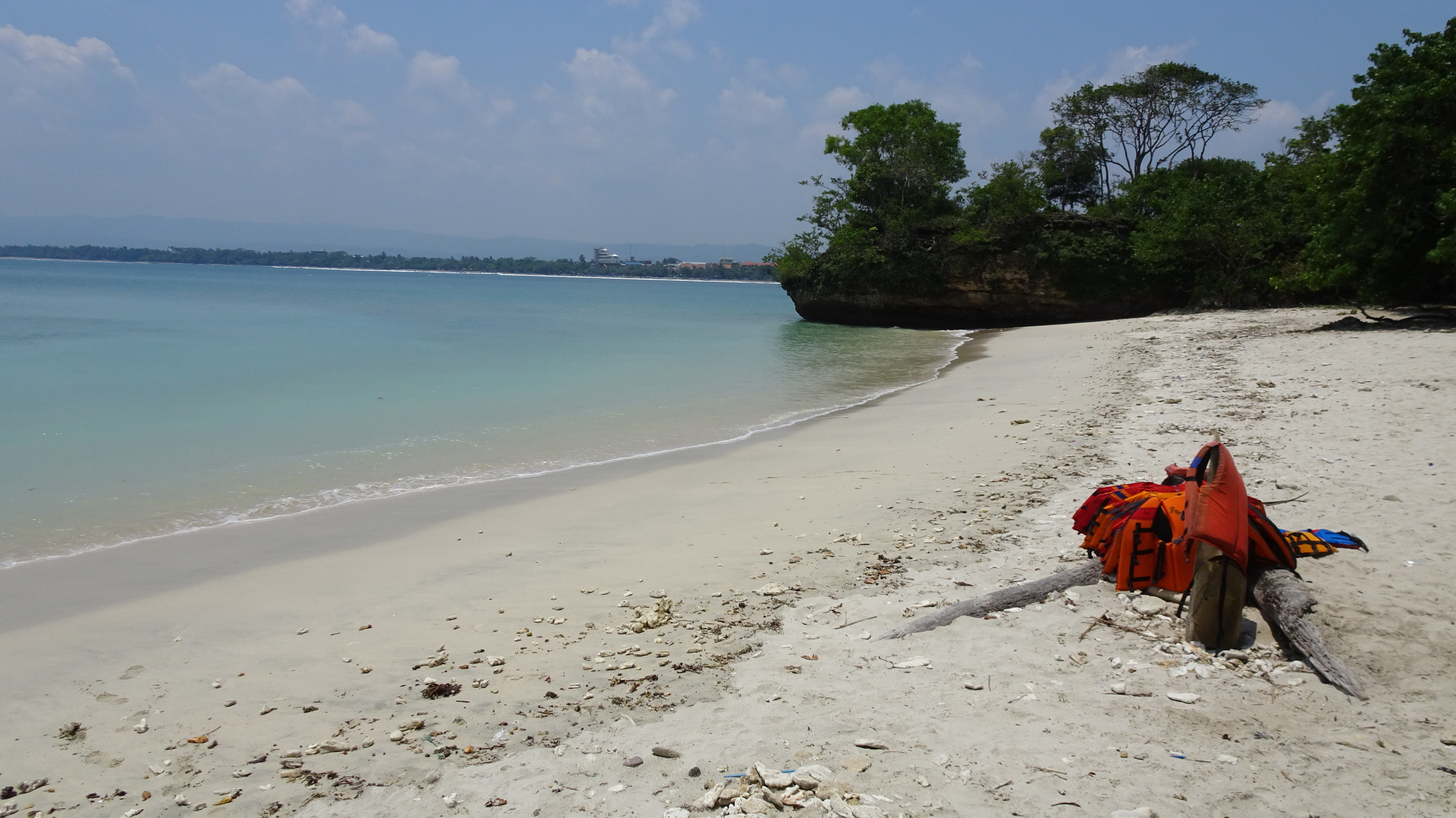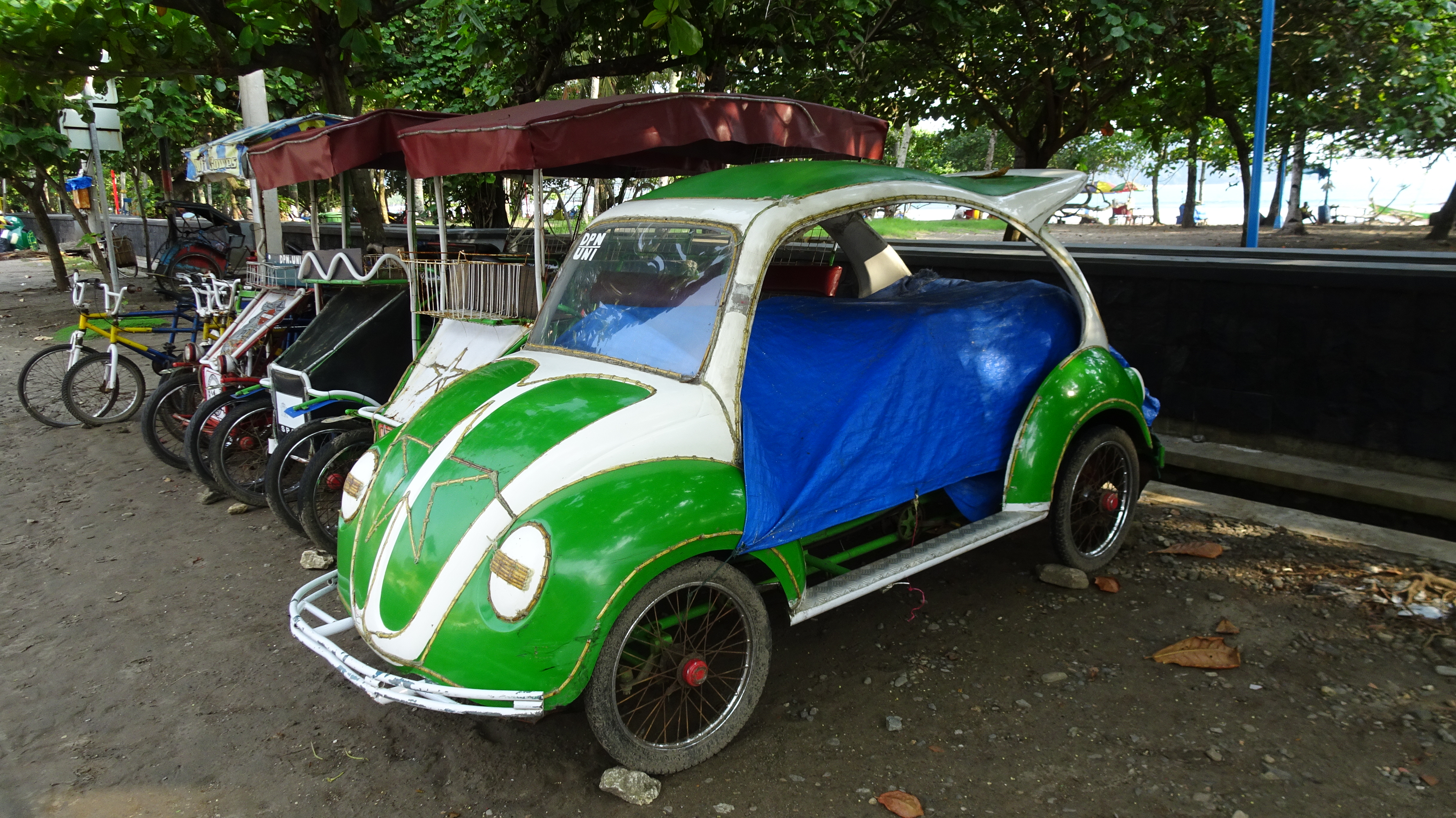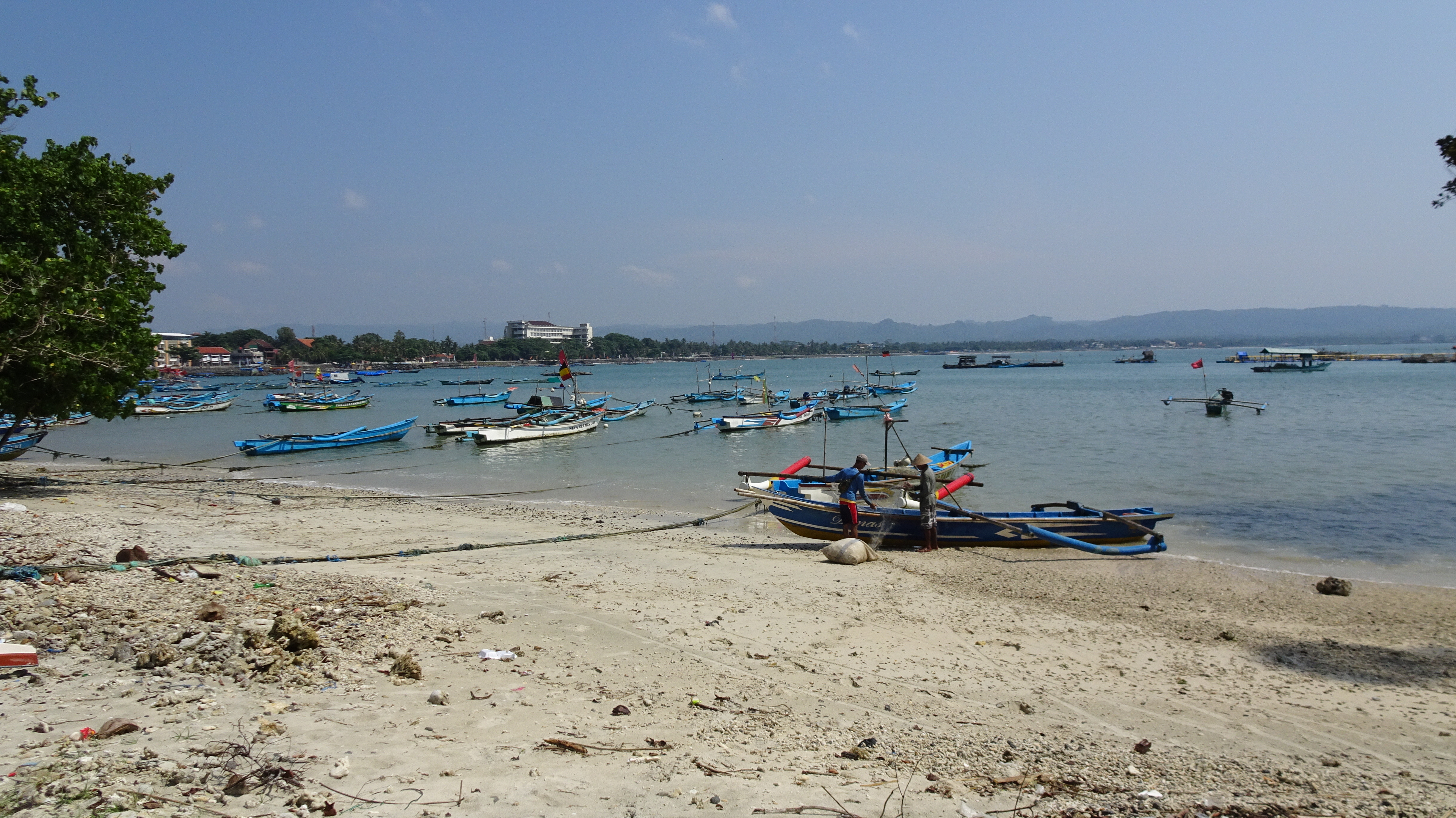 Hier ist auch der einzige längere weiße Strand auf Java, der zum Baden geeignet ist! Auf den übrigen hunderten Kilometern Strand sind die Strömungen so stark, daß man(n) aufs Meer hinaus gezogen wird und dann ohne Hilfe keine Chance hat, zurück zum Ufer zu gelangen. Jedes Jahr holt sich das Meer einige, die das nicht wahrhaben wollten, erfahren wir.