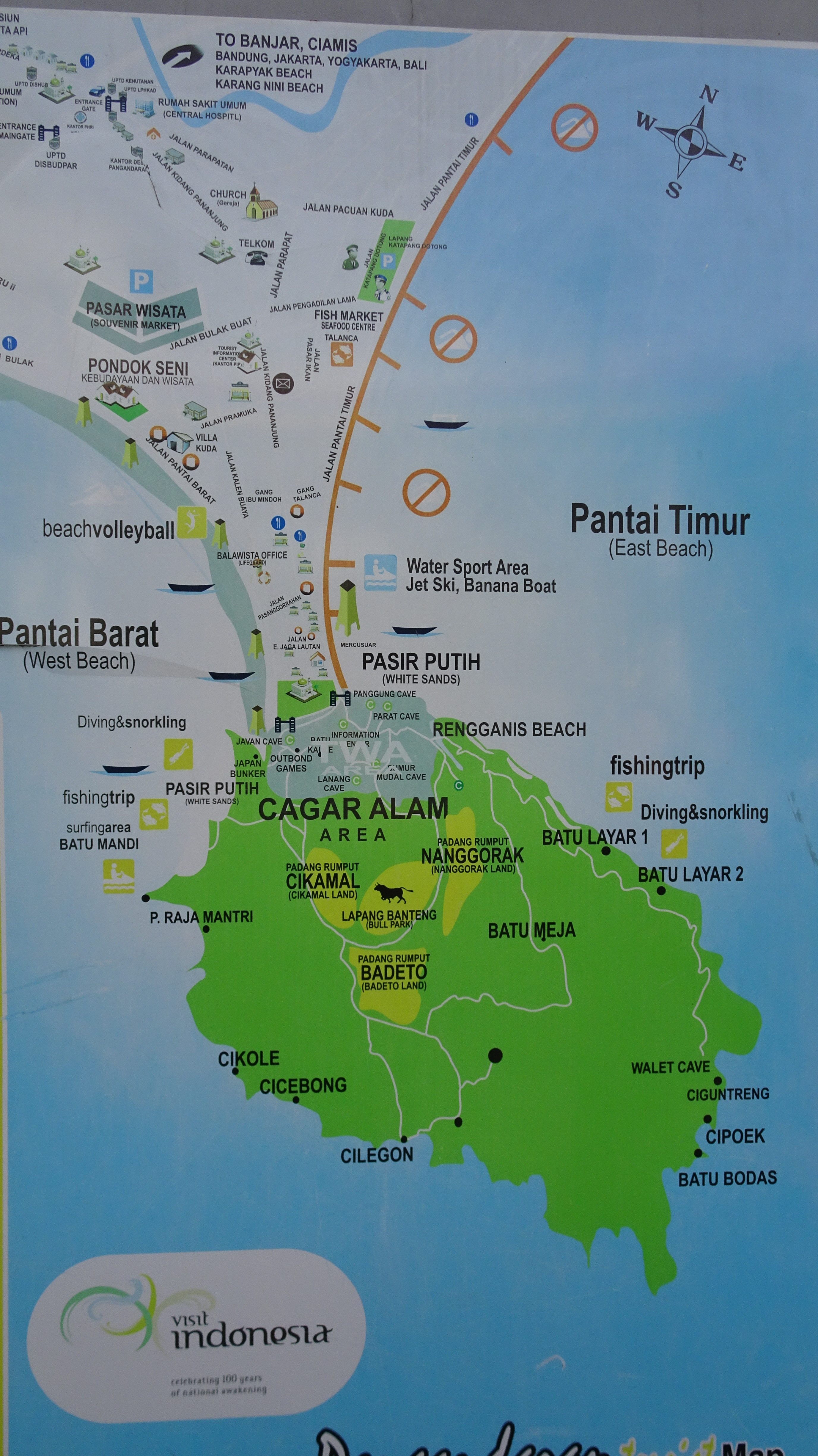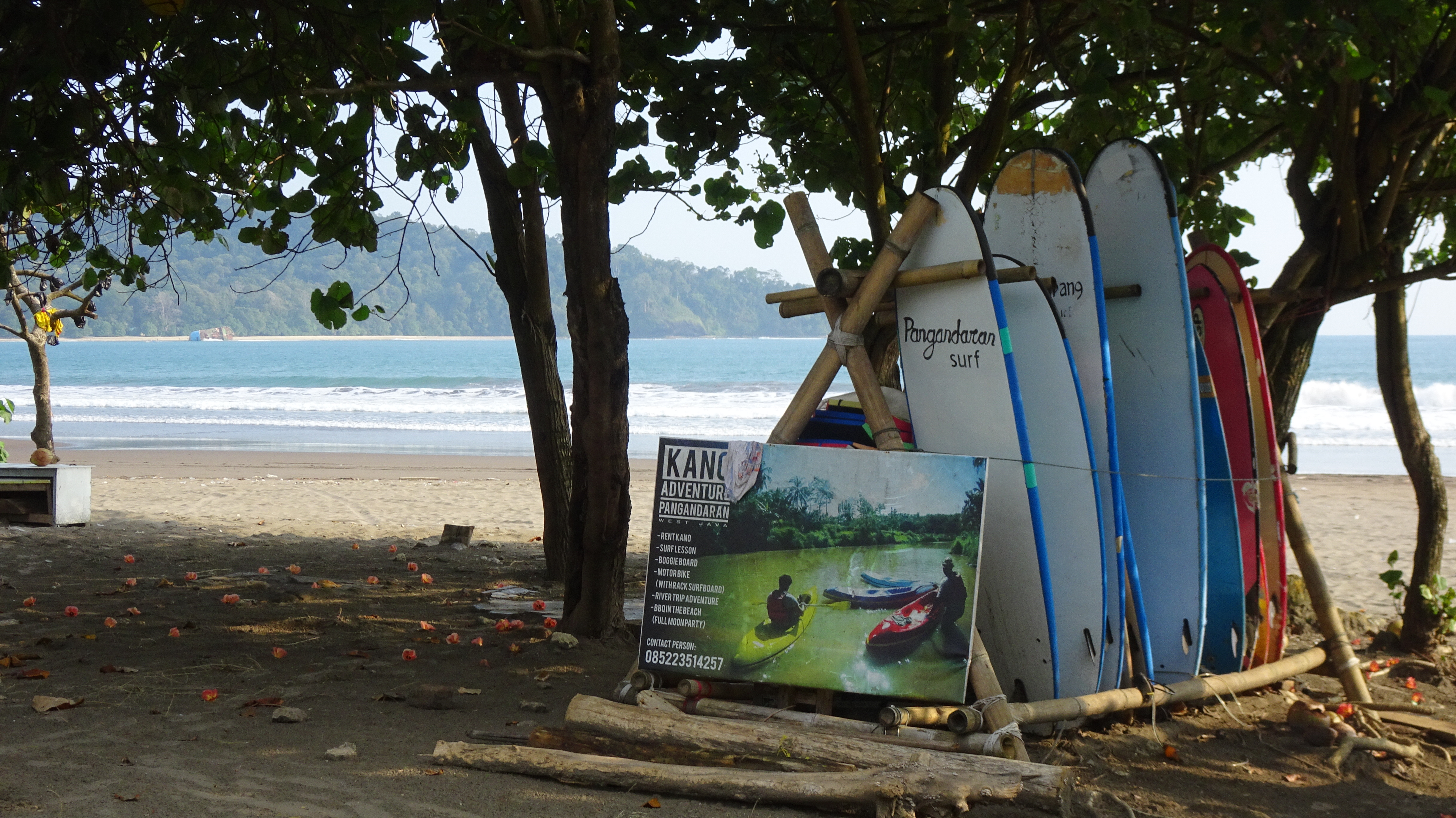 „Pangandaran ist ein Bade- und Fischerort an der Südküste Javas und gehört zur Provinz Jawa Barat. Er wird hauptsächlich von Javanern aus Bandung oder Yogyakarta u.a. zum Surfen besucht, ist aber auch ein beliebtes Ziel internationaler Rucksacktouristen. Der Ort liegt auf einer Halbinsel, die im Süden durch einen kleinen Nationalpark begrenzt wird.