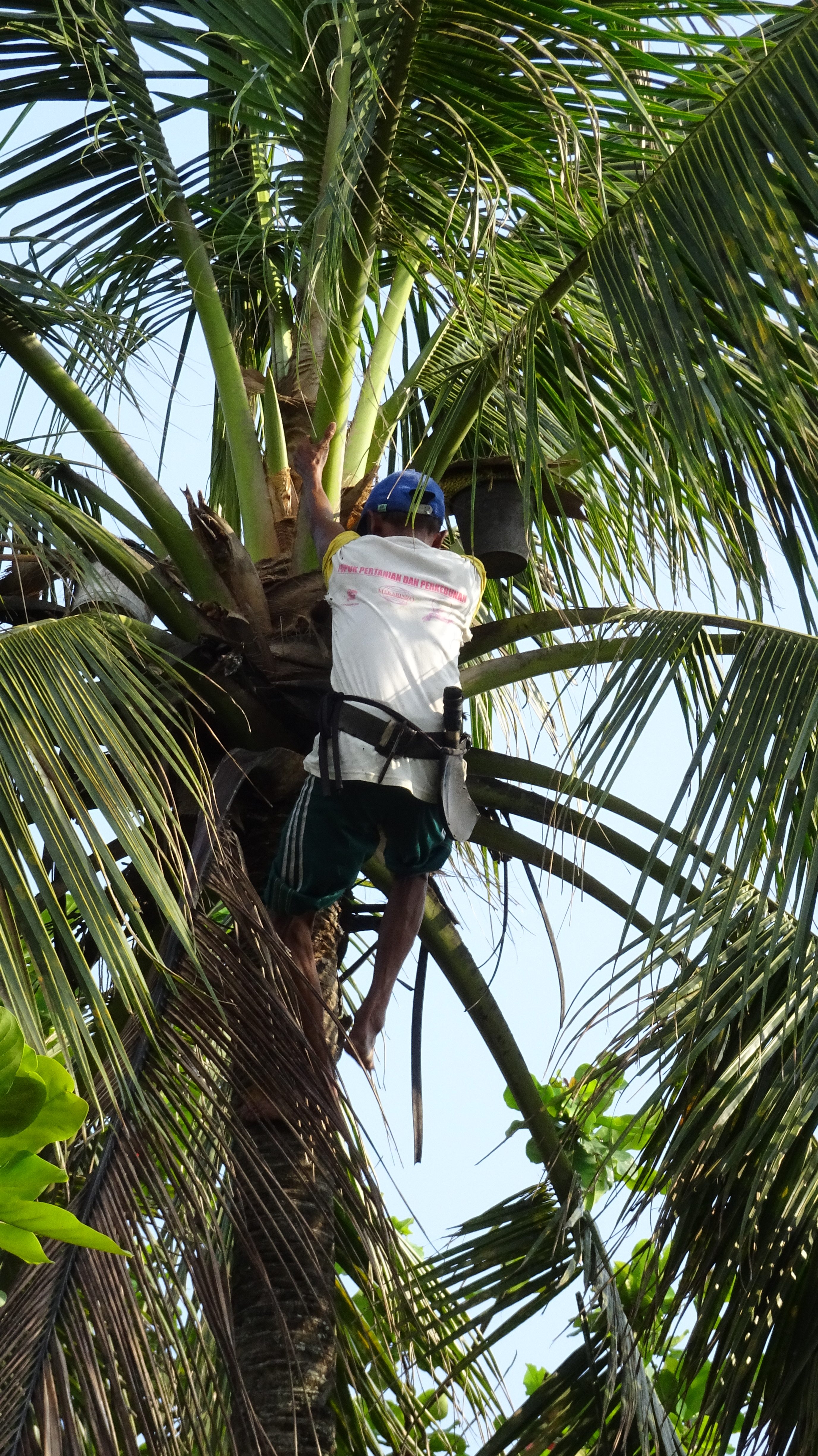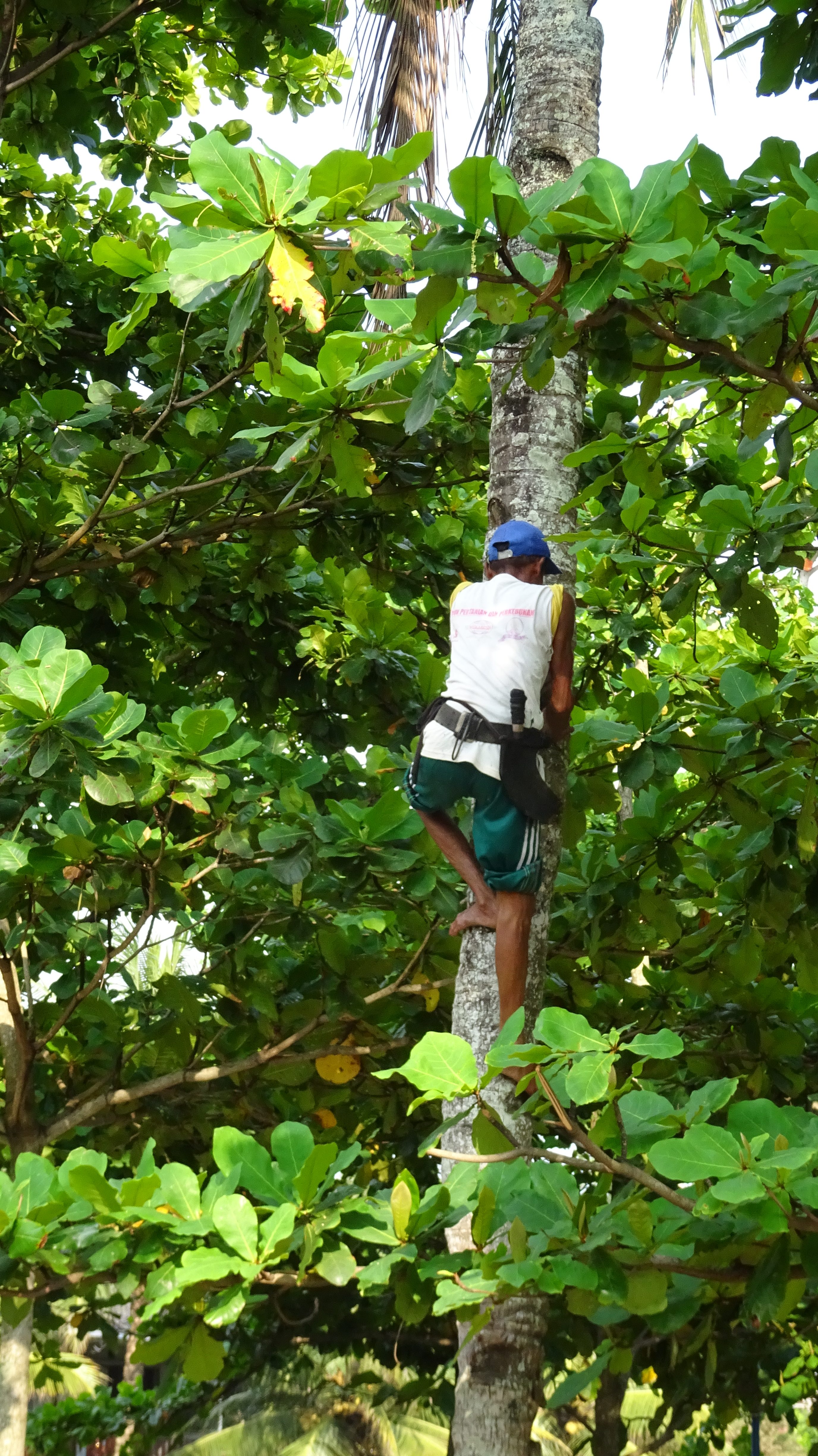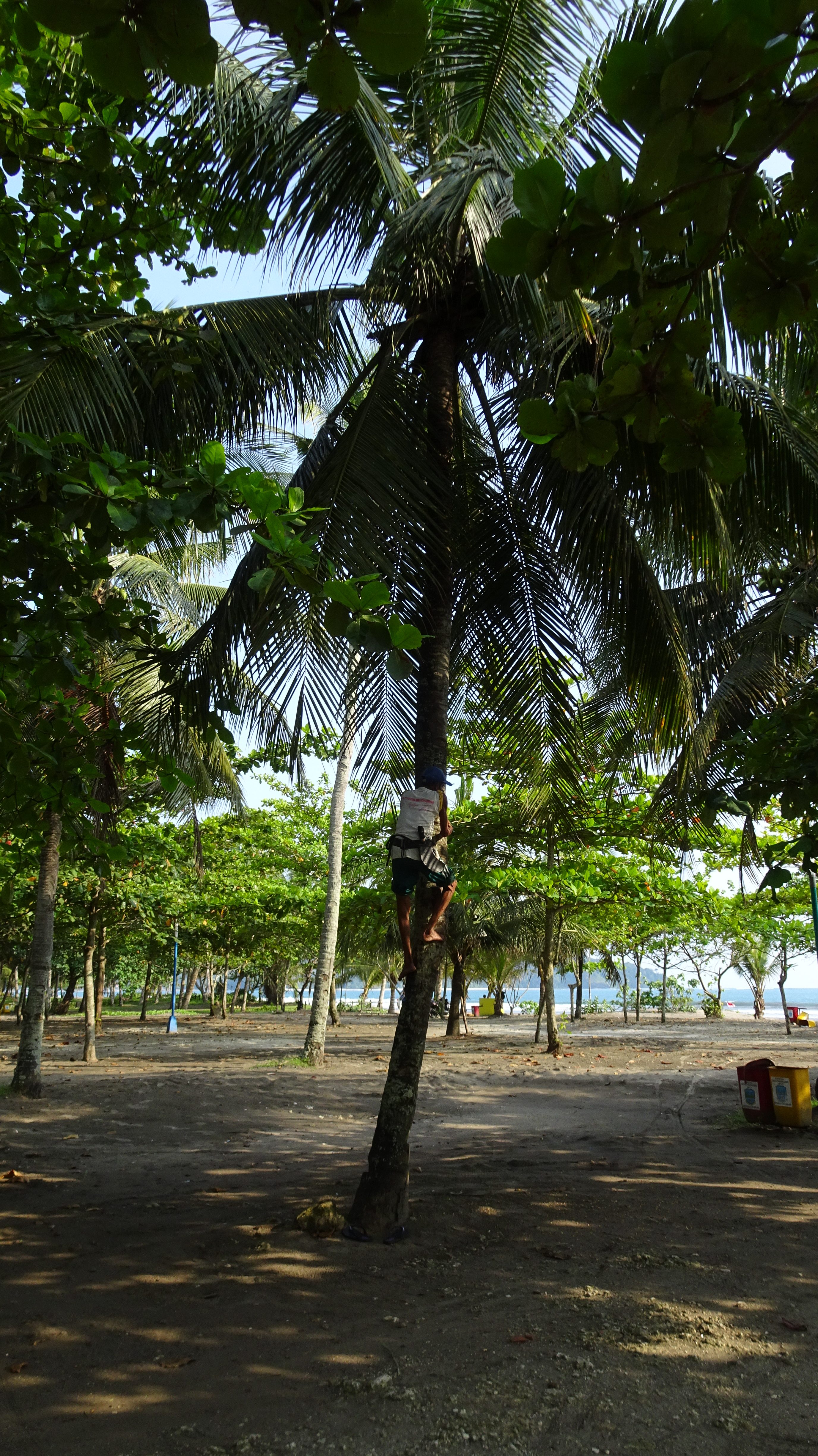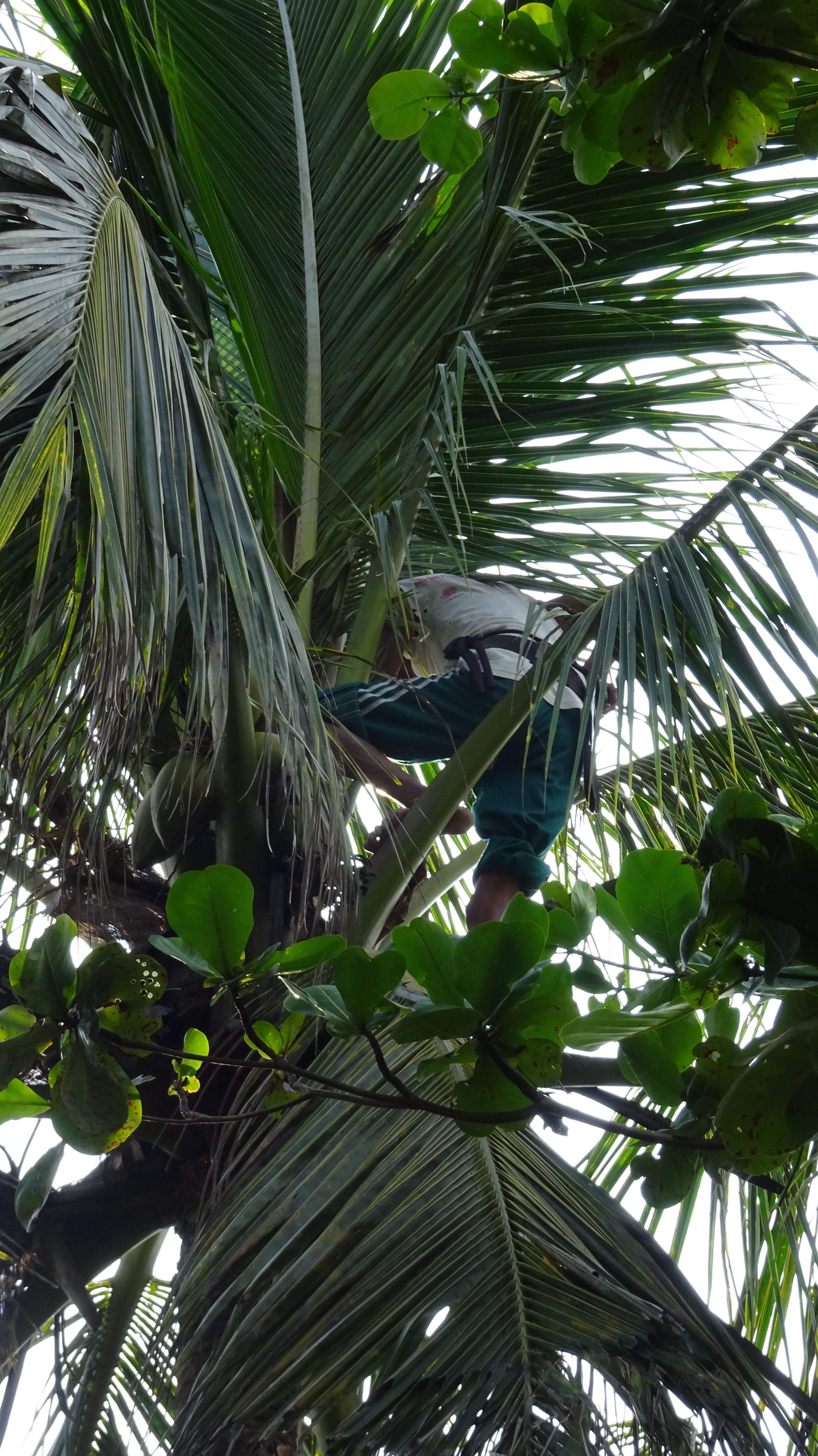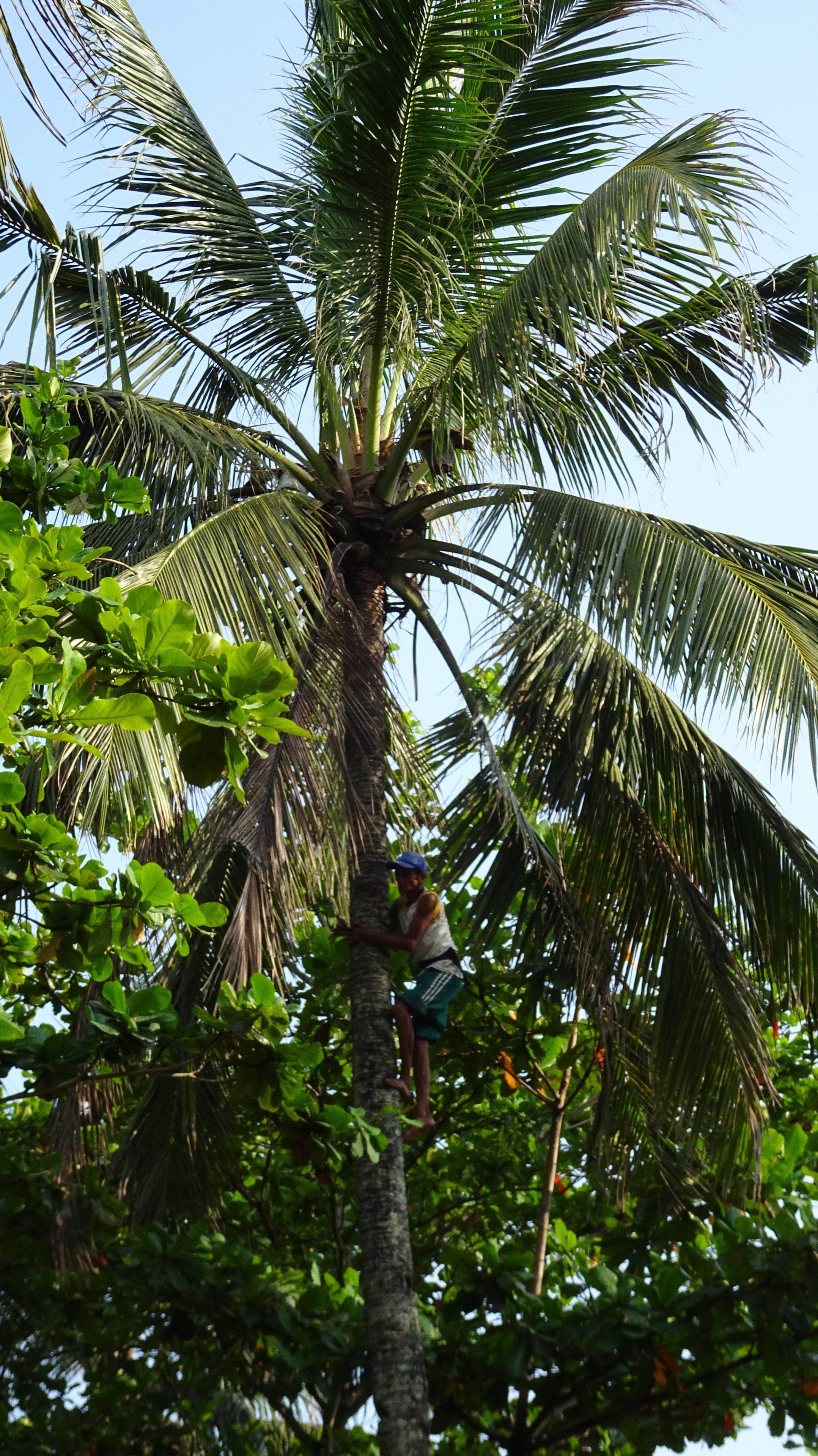 Zu gern hätte ich erfahren, was der Palmenkletterer da tat, aber die Sprachbarriere war dagegen. Die Nüsse ließ er alle oben hängen. Der drahtige kleine Mann stieg direkt aus seinen Floppys am Stamm hoch und runter wieder direkt in die Latschen hinein. Chapeau!