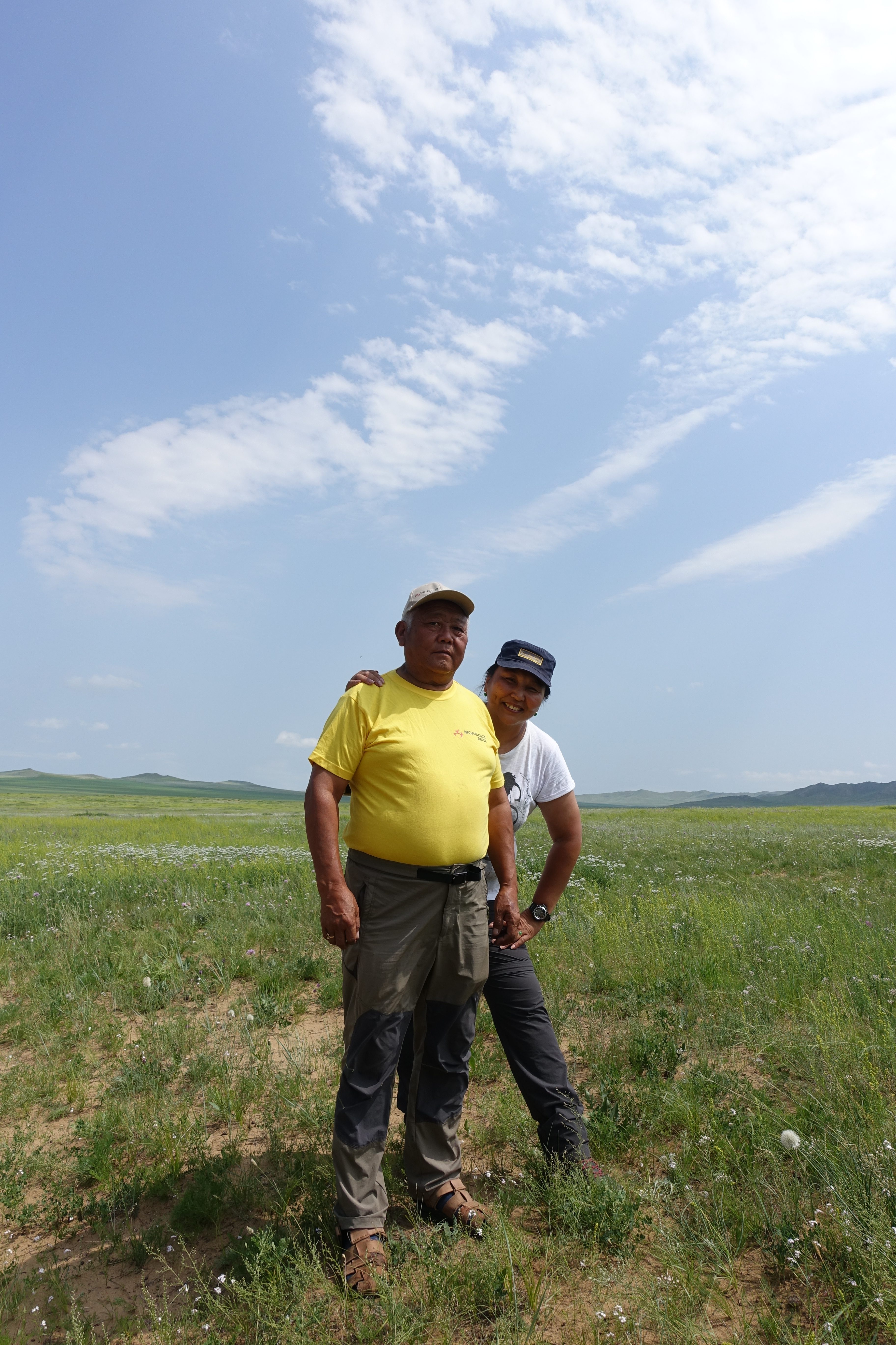 Auf unserer Etappe in der Mongolei werden wir durch zwei lokale Partner unterstützt. Algaa („Alexander“) ist verheiratet, hat vier Kinder und ist professioneller Fahrer. Seit 42 Jahren sitzt er hinterm Steuer und seit zwölf Jahren fährt er für Mongolei Reise. Privat interessiert er sich für Vögel und Gartenarbeit. Byambasuren („Byambaa“) ist verheiratet und hat zwei Kinder. Vor zwölf Jahren fing sie an als Reiseleiterin zu arbeiten. Sie mag es in der Natur zu sein und reitet gerne, auf Pferden und auf Fahrrädern.
