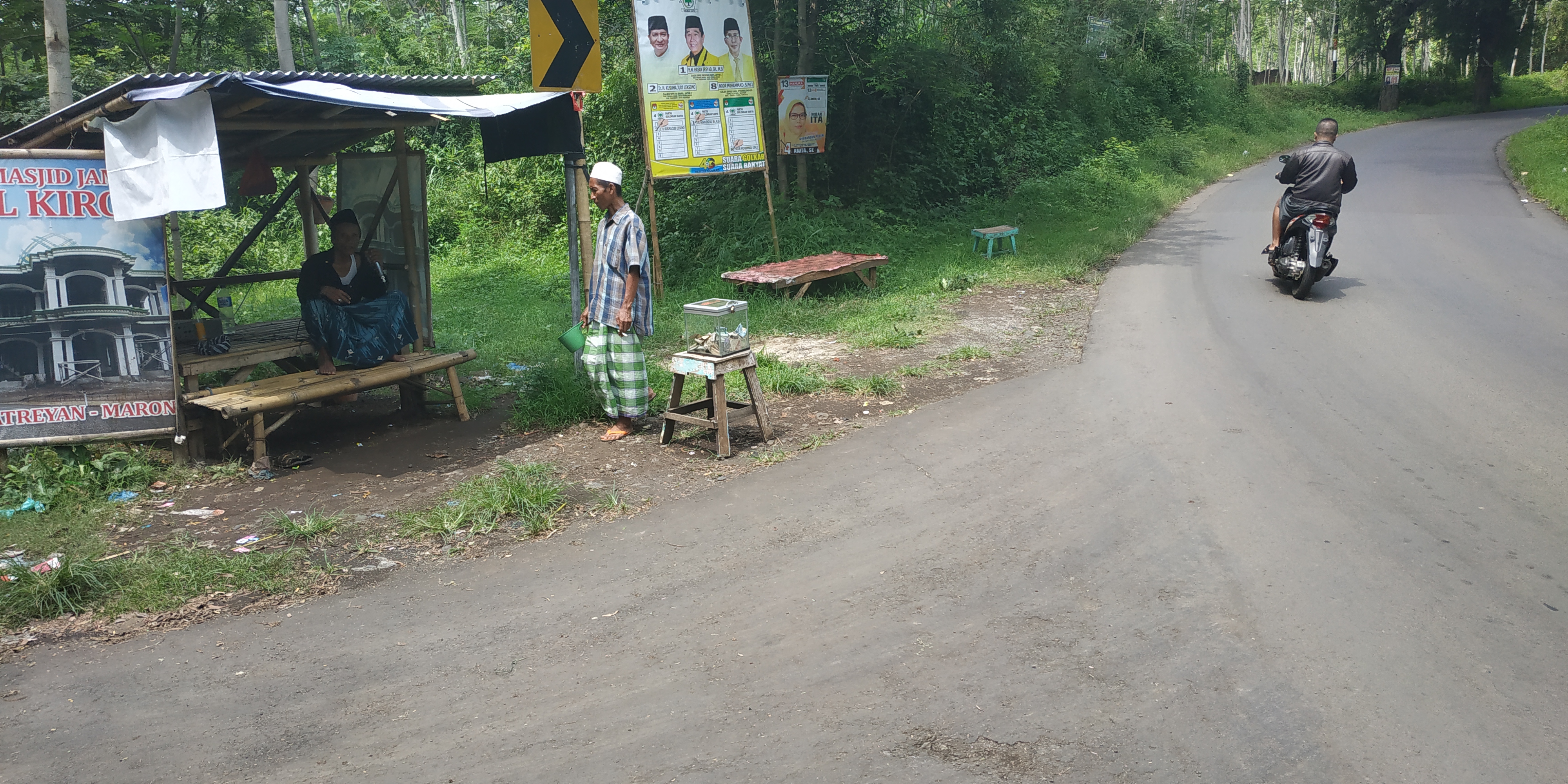 Nach 30 km haben wir den Sockel des Vulkans erreicht und wir fahren durch die Tiefebene zwischen Reisfeldern an unzähligen Kanälen entlang. Während am Bromo die einzigen Hindus Javas wohnen, die Tenggeresen und Kopftücher seltener waren, so ist die Dichte der Moscheen hier wieder größer. In fast jedem Dorf wird an mehreren Stellen für die Moschee gesammelt und zwar lautstark mit Megaphon am Straßenrand, wo man genötigt wird für die Moschee zu spenden, quasi akustische Wegelagerei.  Auch bin ich mir nicht sicher ob Doktor Muft die nötige Kompetenz hat in der Politik mitzuspielen, aber ich kann mich ja auch täuschen.