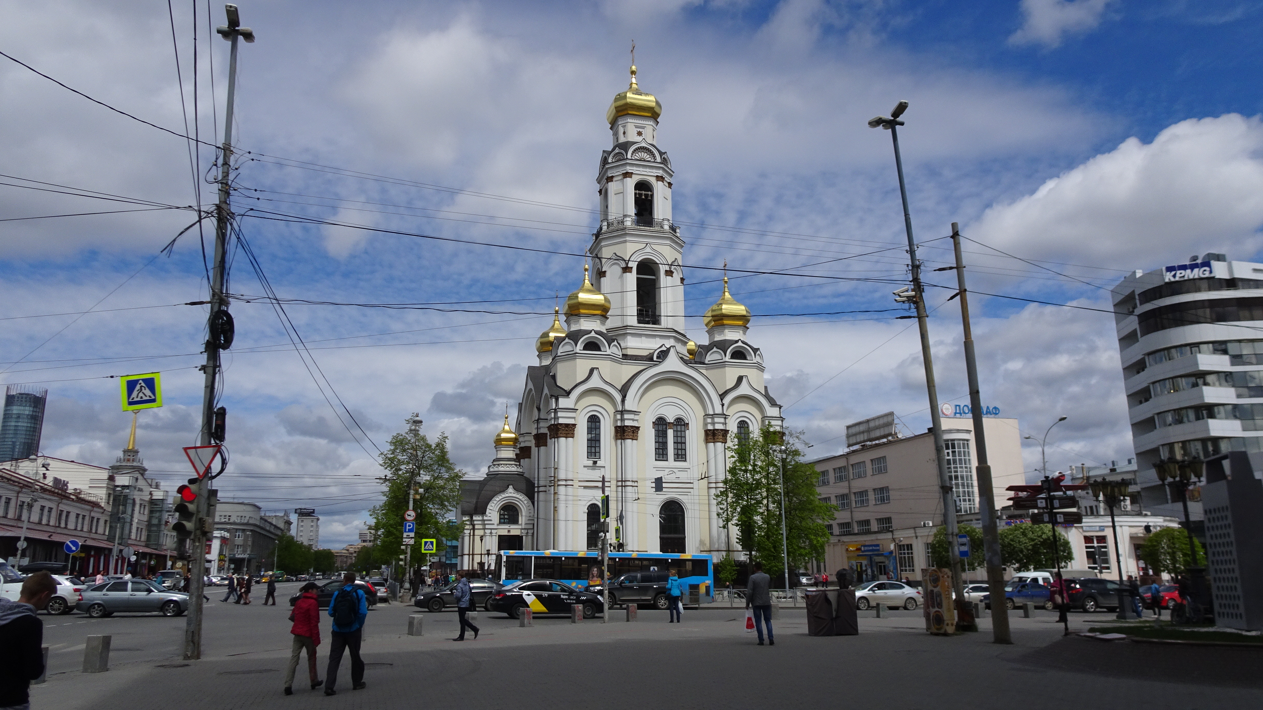 Zum Abschluß zeigt uns Aljona die Blutskirche, eine neu gebaute orthodoxe Kathedrale. Sie wurde 2002/2003 am Platz der Ermordung der Zarenfamilie errichtet. Hier wurde 1918 von den damaligen Bolschewiki im Umkreis von Jakow Michailowitsch Swerdlow (Яков Михайлович Свердлов, 1885-1919, damals ein führender Politiker der Partei der Bolschewiki sowie etwas mehr als ein Jahr lang Staatsoberhaupt Sowjetrusslands) im Verlauf des Russischen Bürgerkrieges die Zarenfamilie ermordet und in einem alten Bergwerksschacht verscharrt.