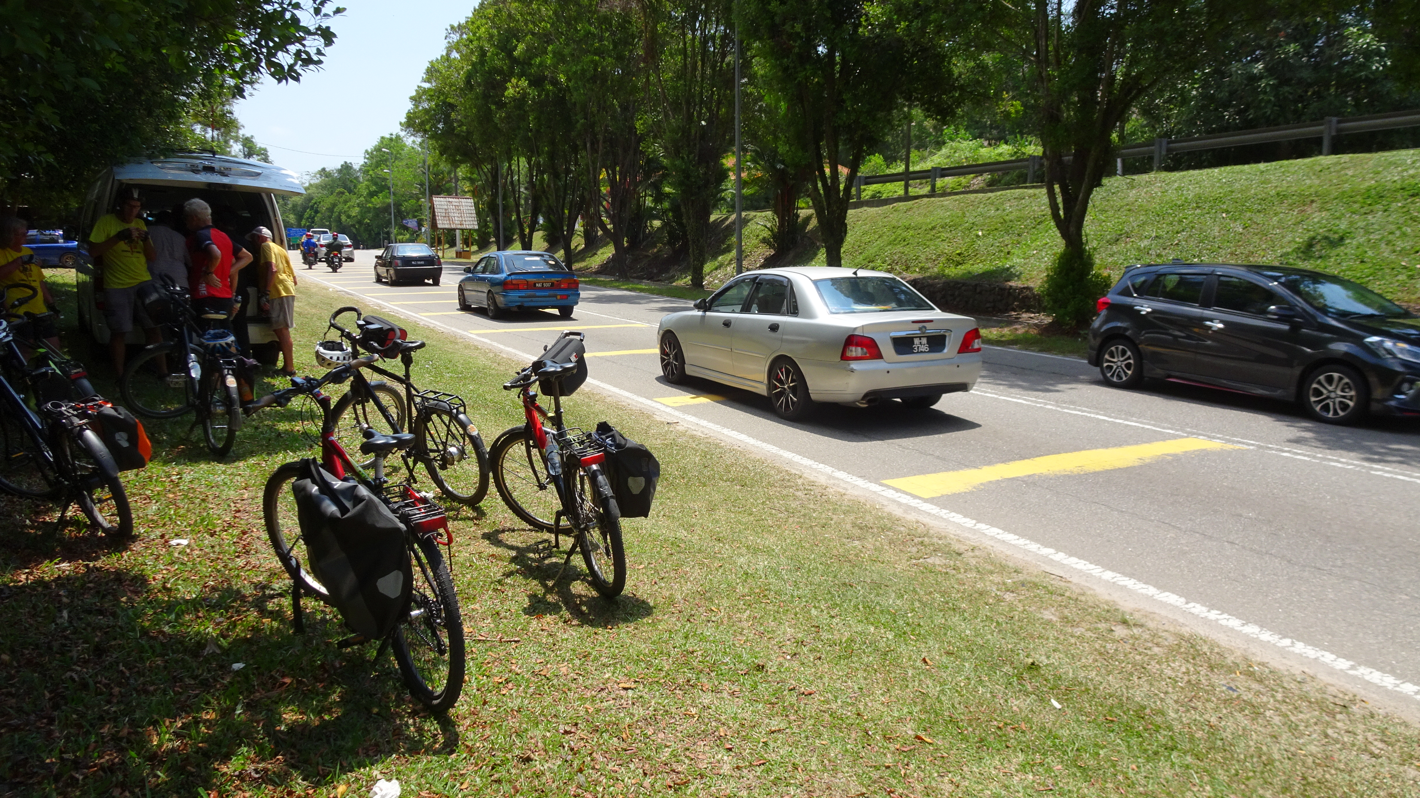 Fahrradwege haben wir eigentlich nur in Kuala Lumpur gesehen, aber sie haben uns nicht viel genutzt. Wo vorhanden und möglich fahren wir also auf dem Seitenstreifen, teilweise im brüllendem Verkehr. Vor allem die überall präsenten Mopeds tanken interessanten Treibstoff, sind möglichst tuned und heulen bei jedem Start kräftig auf. Die fahren an uns links und rechts vorbei oder schlängeln sich auch zwischen uns hindurch, um sich dann kurz noch umzudrehen und uns ein freundliches „Hallo“ zuzurufen. Meist sind wir dann weniger begeistert.