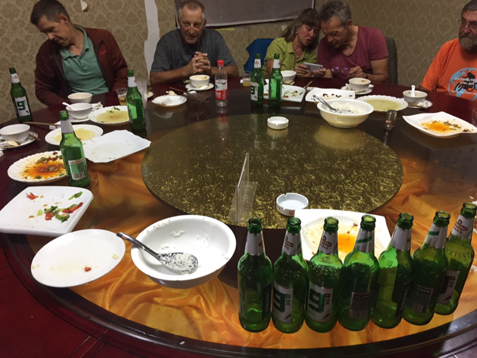 In China ist es unmöglich Gewicht zuzulegen. Wir saßen am runden Tisch, bewaffnet mit zwei Stäbchen. Der Tisch drehte sich mit den leckeren Speisen. Alle waren hungrig wie die Löwen. Wir hatten bei den diversen Bergetappen bis zu 3000 Kalorien täglich verbrannt. Mehr als eine Erdnuss geht nicht zwischen die Stäbchen. Der Tisch dreht sich weiter. Es gelingt mir etwas Fleisch zwischen die Stäbchen zu klemmen und in den Mund zu führen. Höchste Konzentration war gefordert, weitere Kalorien werden verbrannt. Der Tisch dreht sich und dreht sich, die Teller mit den verschiedenen Gerichten ziehen an mir vorbei. Wer die Technik mit den Stäbchen nicht beherrscht, verhungert. Die Teller auf dem runden Tisch sind leer, die Radfahrer waren hungrig. Mein Magen knurrt, er ist gar nicht zufrieden mit mir, dass ich die Technik nicht besser beherrsche. Ich hätte unbedingt vorher zu Hause mit lockerem Reis üben müssen. Unsere Reiseleiterin stellt die ketzerische Frage, soll ich noch etwas nachbestellen oder haben schon alle genug? Hans schiebt gerade die letzten Erdnüsse in den Mund und Gerhard pickt nach den letzten Reiskörnern.